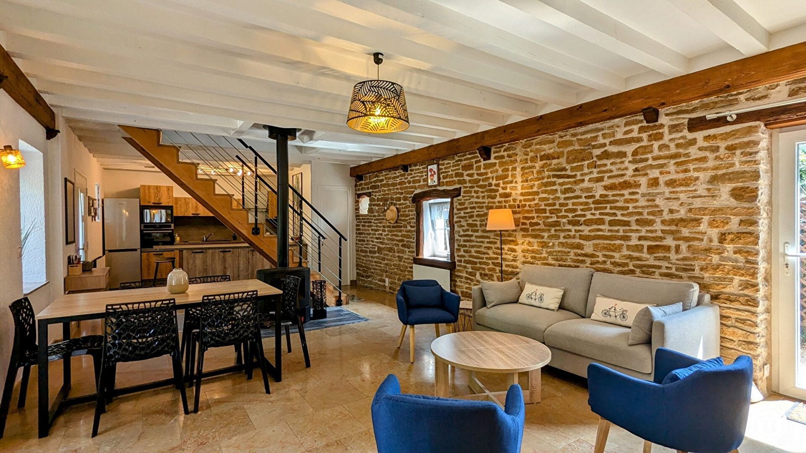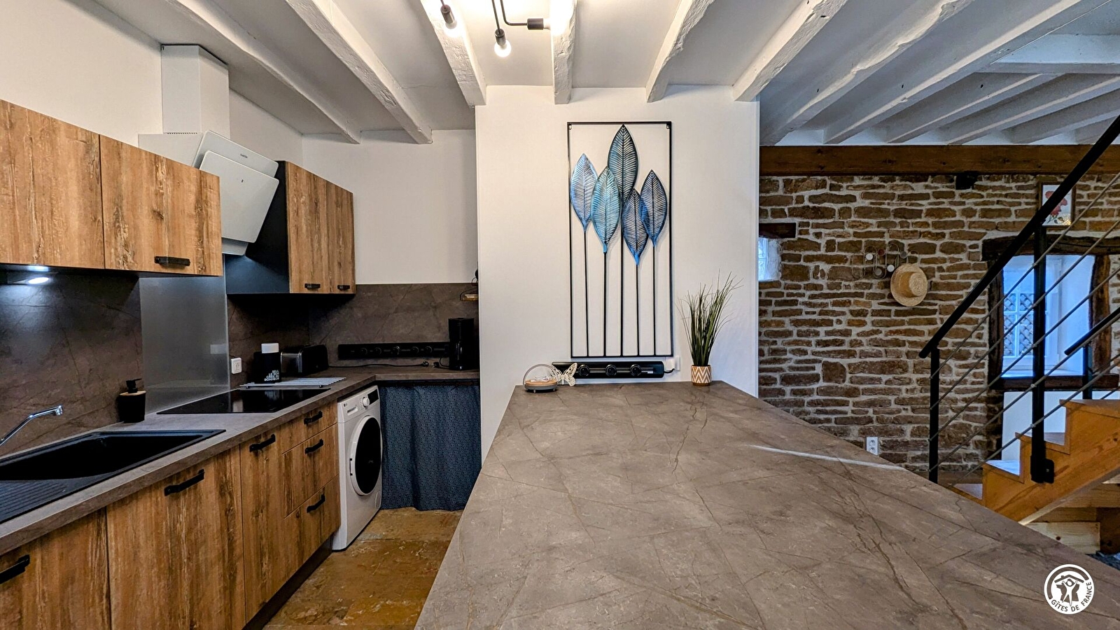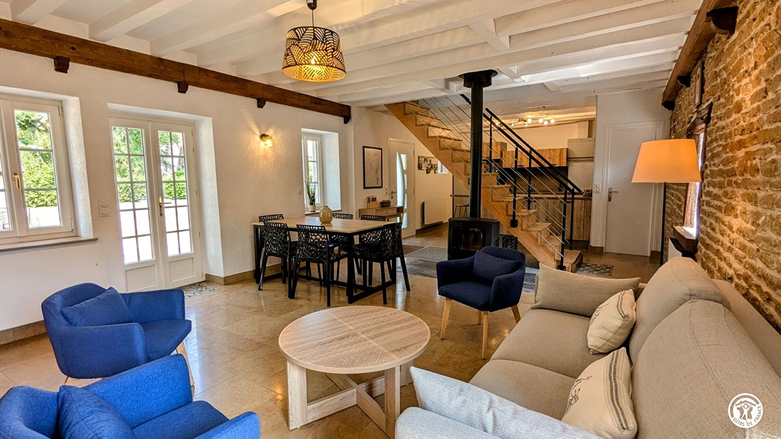 Au rez-de-chaussée : grand séjour avec cuisine moderne entièrement équipée ouverte sur le salon/salle à manger avec poêle à bois (bois fourni pour 1ère flambée), TV et Wifi. Murs et sols en pierre de Bourgogne. Accès direct à la cour et au jardin. WC indépendant.