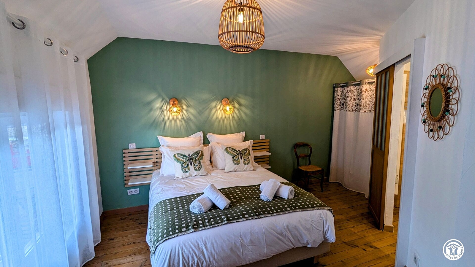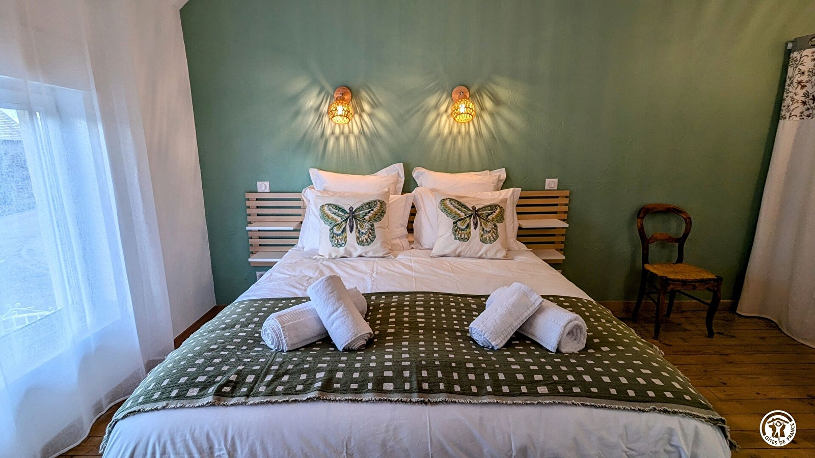A l'étage, 3 chambres : 1 chambre avec 1 lit de 160x200 cm et salle d'eau privative avec WC, 1 chambre avec 2 lits de 90x200 cm jumelables, 1 chambre avec 1 lit de 160x200 cm. Salle d'eau avec douche italienne et WC. Draps, linge de toilette, ménage et électricité inclus. Bois de chauffage en supplément : 5€ l'unité.
