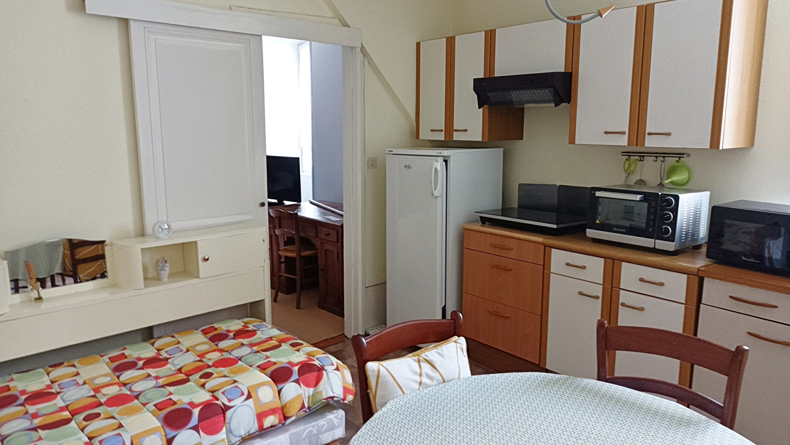 Ce meublé de 40 m2 , composé d’une chambre – séjour avec un lit de 140 cm et d’une cuisine comprenant un lit de 90cm est l’endroit idéal pour accueillir 3 personnes. Sa cuisine est fonctionnelle et bien équipée.