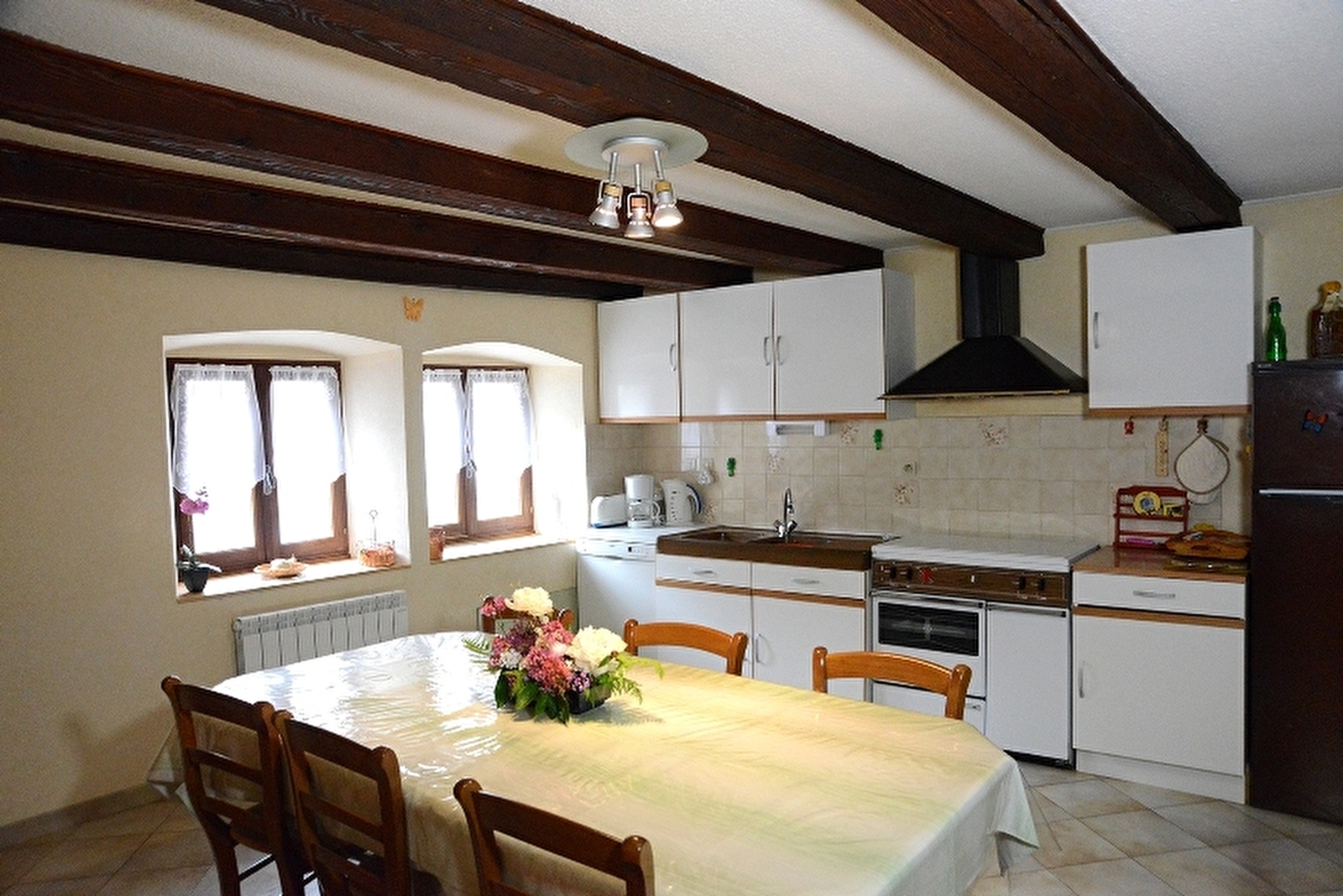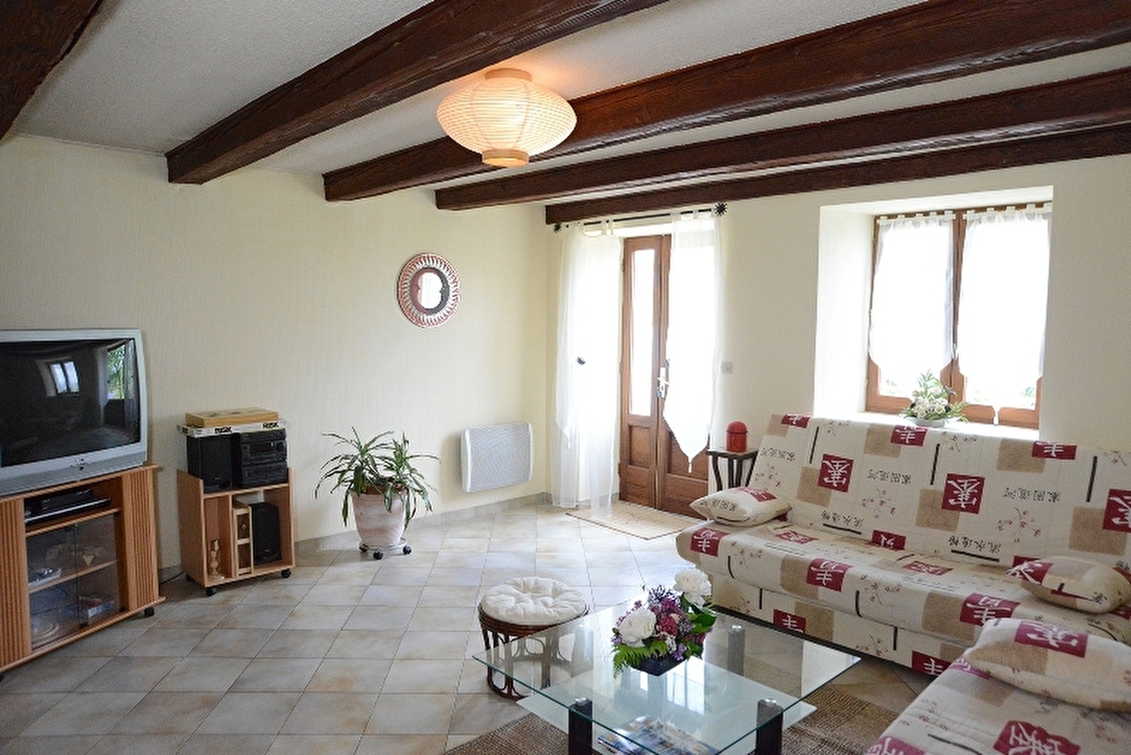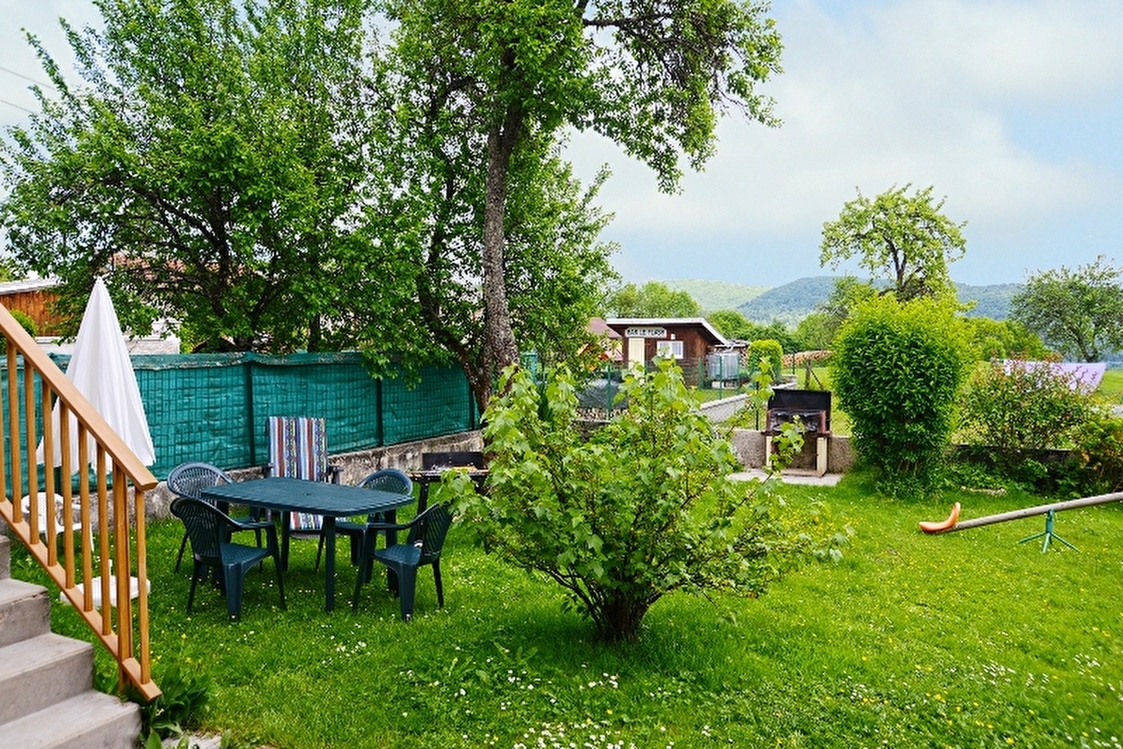 Maison mitoyenne indépendante à deux pas du Lac de Vouglans. Au rez de chaussée, hall d'entrée, WC indépendant. A l'étage: cuisine indépendante toute équipée, séjour-salon avec TV, chaine hifi, lecteur DVD, cheminée (5 euros le panier), balcon offrant une splendide vue sur la nature environnante en particulier sur les Monts Jura. Au 2e étage: CH1: 1 lit 2 pl, CH2: 1 lit 2 pl, CH3: 1 lit 2 pl, salle de bains avec WC intégrés. Terrain attenant clos avec salon de jardin et barbecue. Animaux acceptés selon conditions et avec une caution de 100 €.