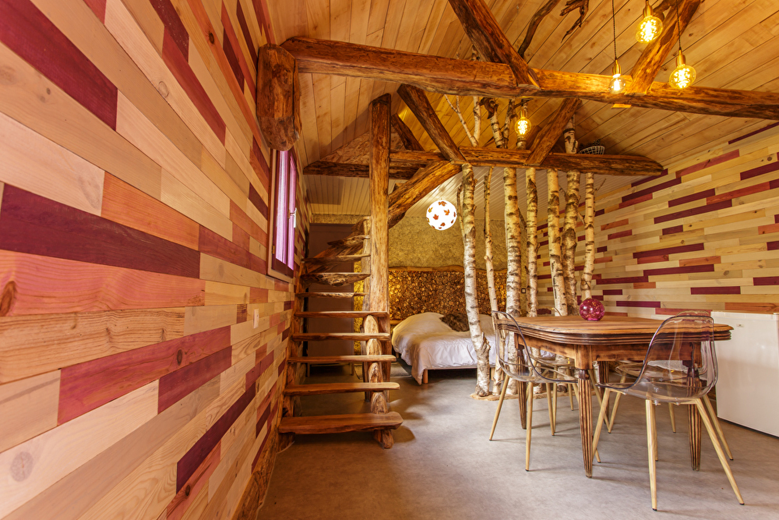Relooké intégralement cet hiver 2021, à base de matériaux naturels et de récupération il est équipé d’une douche et d’un lavabo, ainsi que d’un wc séparé. Le cabane myrtille est située à proximité de la salle de restauration et près de l’aire de jeu. Il est composé d’une pièce unique comprenant une cuisine aménagée, un lit double et un lit simple en mezzanine.