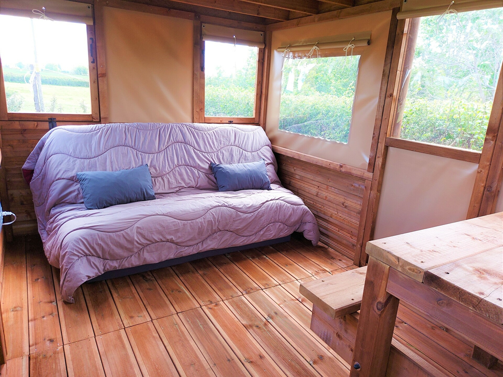 Au rez-de-chaussée, un coin salon avec table, banc et un canapé convertible.
