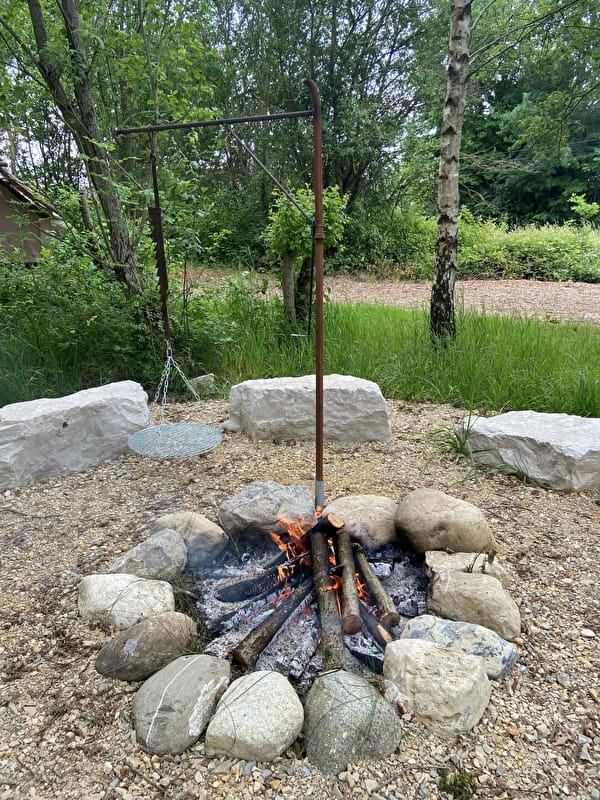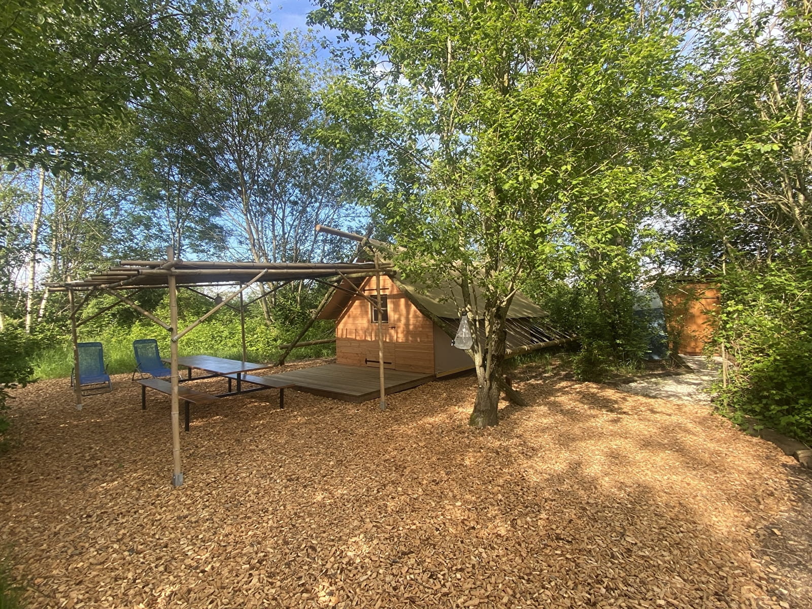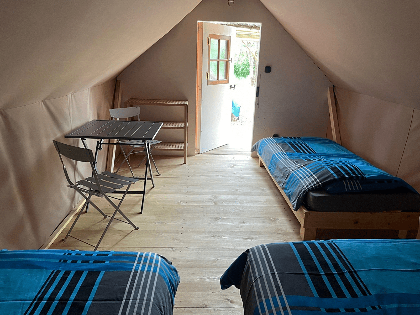 Dans un cadre bucolique, vous trouverez deux tentes de trappeurs luxueuses pouvant accueillir chacune d’elle de 2 à 5 personnes.