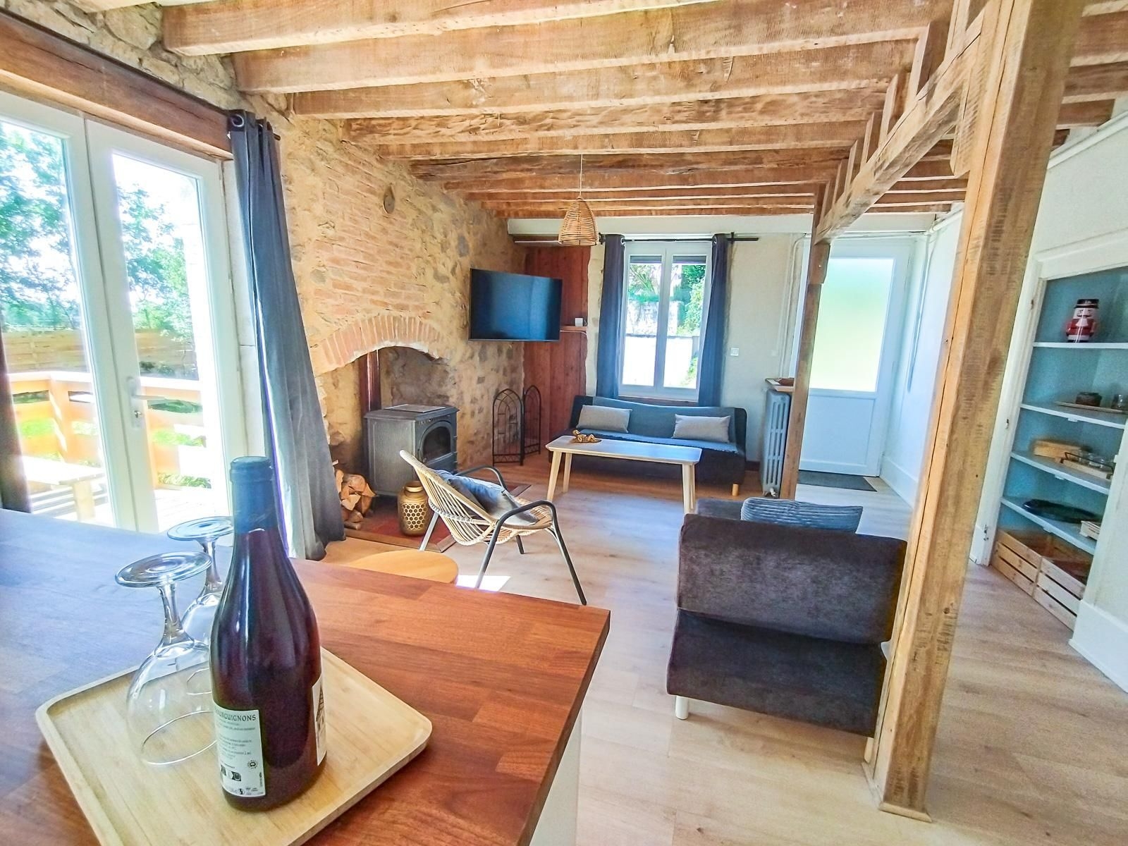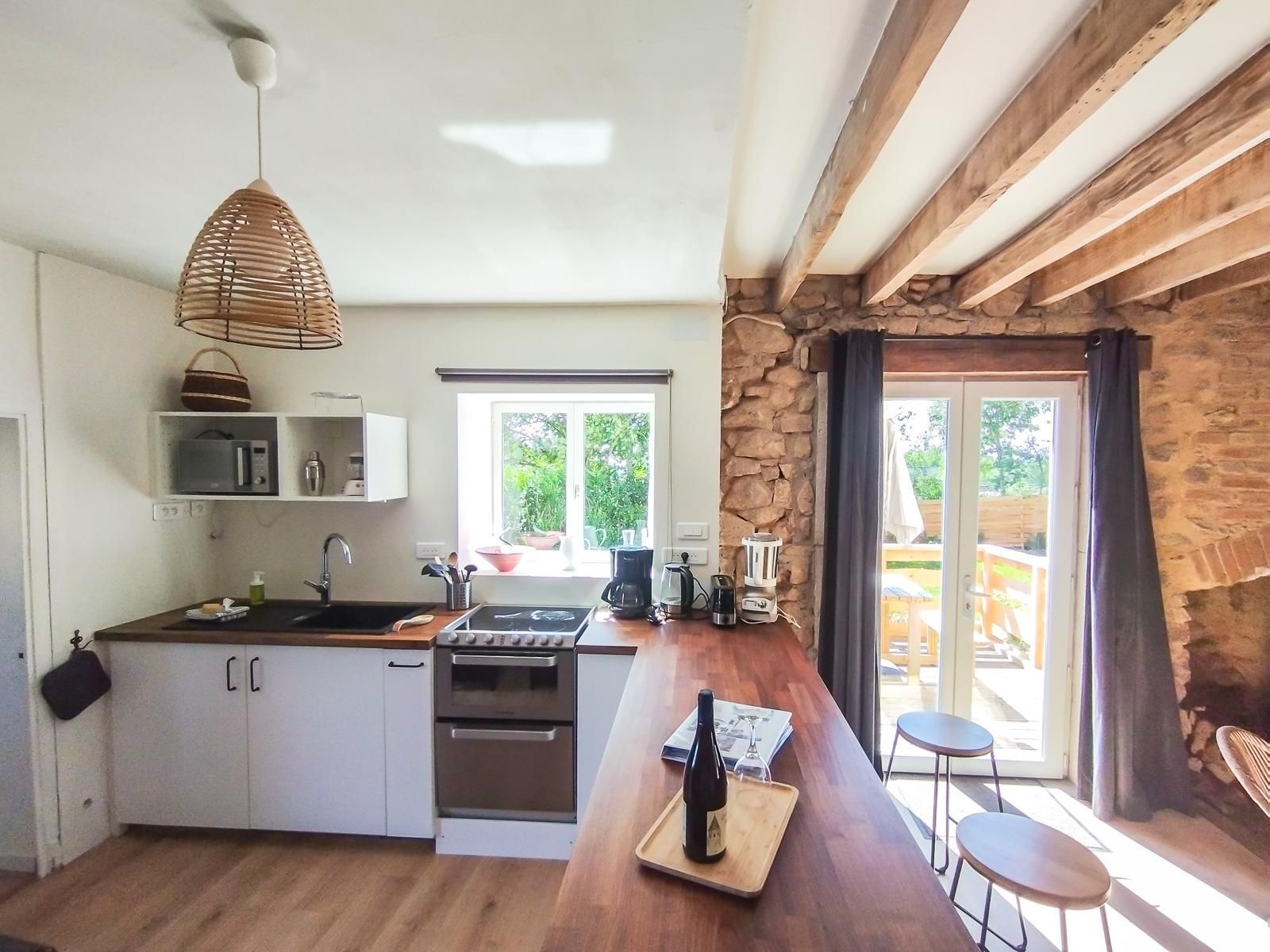 Le Logis "CAMPAGNE", alliant authenticité et confort, de plain-pied (rez-de-chaussée) est une résidence parfaite pour 4 personnes (famille ou amis). Et pour un séjour en télétravail. Pièce de vie de 33m2 avec belle cuisine équipée ouverte sur salon. TV écran plat et poêle à bois (bois fournis). Le séjour offre un accès direct à deux terrasses privatives dotées de mobilier de jardin et barbecue. La jardin, quant à lui, est à partager avec les occupants des autres gîtes. Salle d’eau moderne avec douche à l’italienne et grand miroir anti-buée. WC séparé. Espace buanderie avec machine à laver. Deux chambres avec chacune un bureau et un lit double. Cerise sur le gâteau : un vélo d'appartement pour votre fitness quotidien. Local sécurisé pour vélos et poussettes. Stationnement privatif le long de la maison.