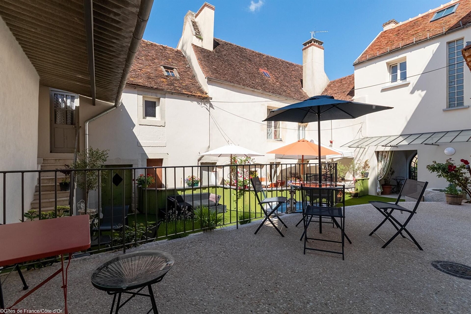 Terrasse avec salon de jardin à disposition des locataires des gîtes dans le patio commun. Parking public dans la rue. Local commun dans l'immeuble pour stocker les vélos.