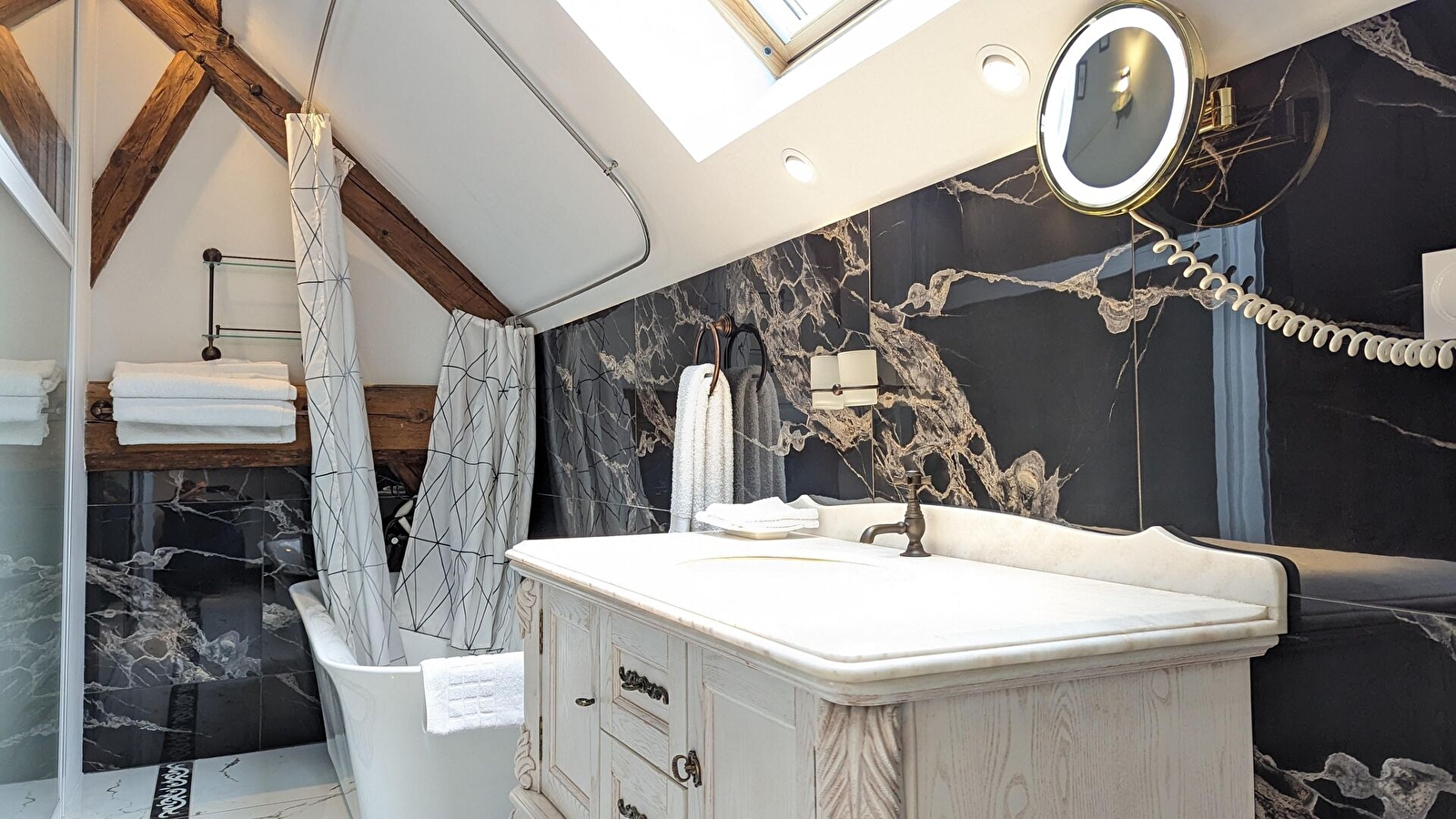 Dans le prolongement du restaurant (ambiance bistro/guinguette), l’accès au gîte se fait par une terrasse privative à l’hébergement.