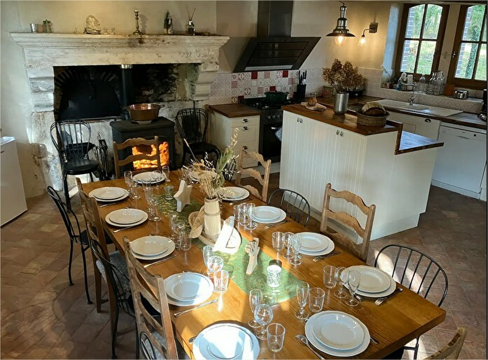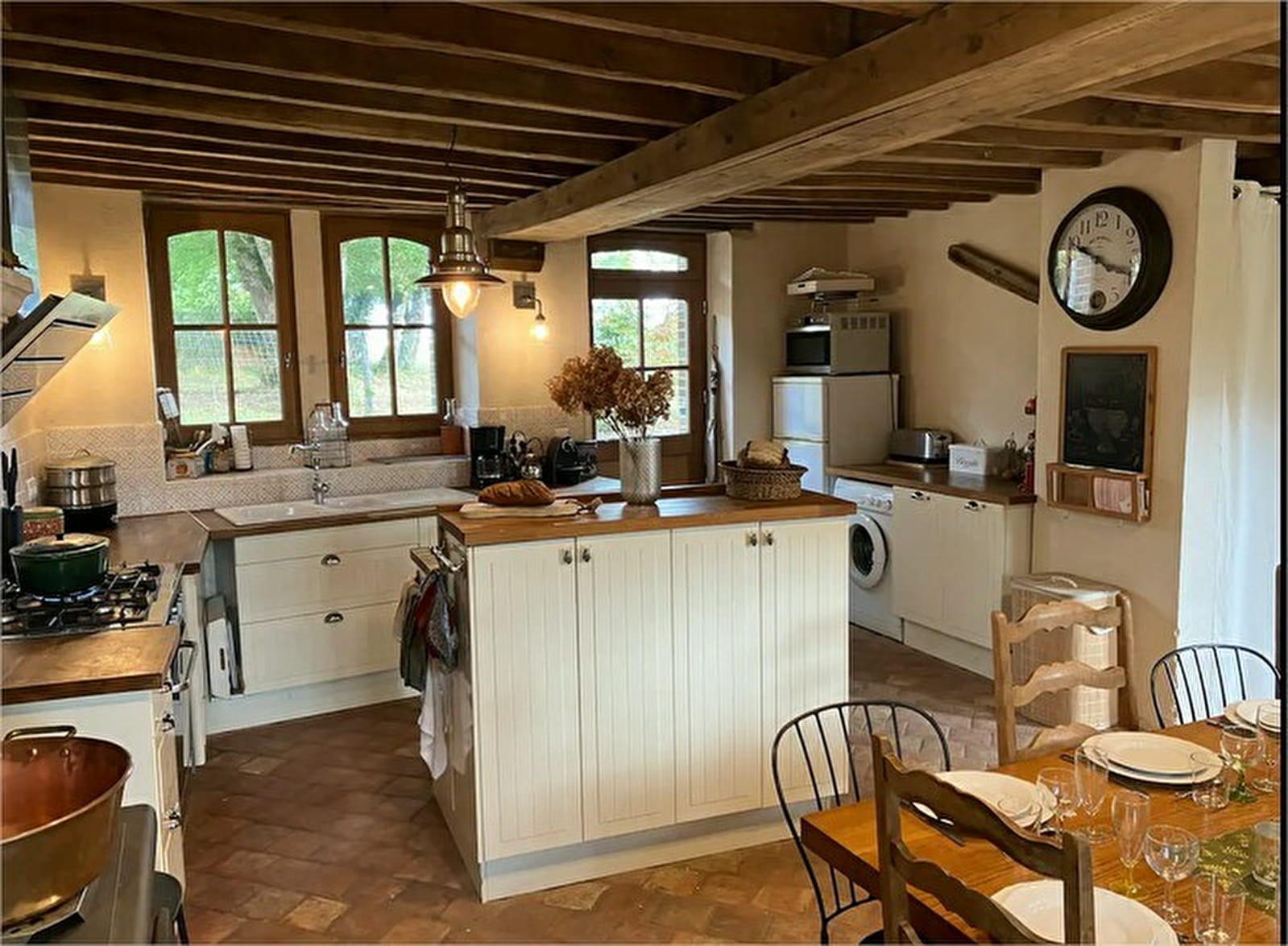 Une cuisine conviviale, spacieuse et bien équipée (piano de cuisson 5 feux gaz + four électrique, micro-onde, frigidaire, congélateur, plats toutes tailles, cafetières filtre et Nespresso, bouilloire, grille-pain, moules à gâteaux, poêles à crêpes, lave-vaisselle, lave-linge, table et fer à repasser, …)