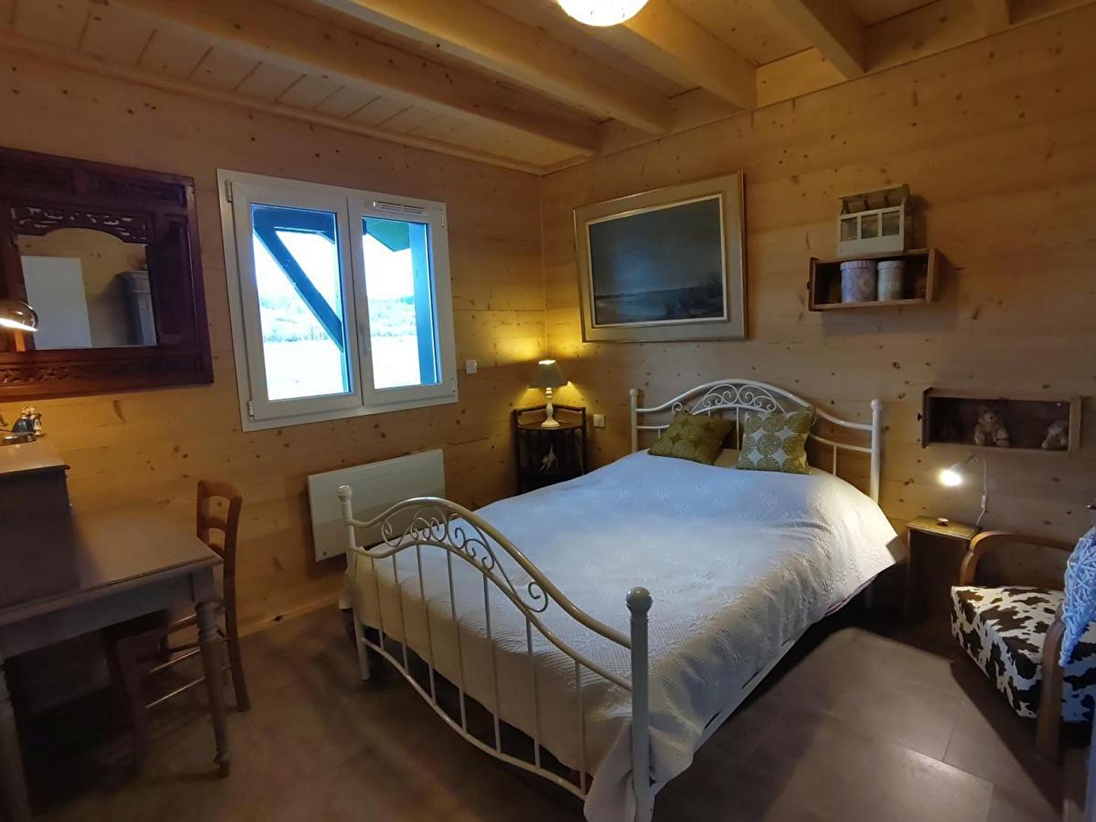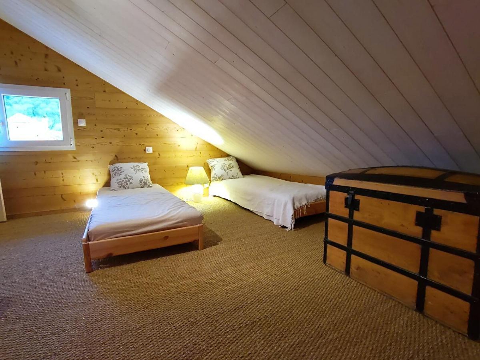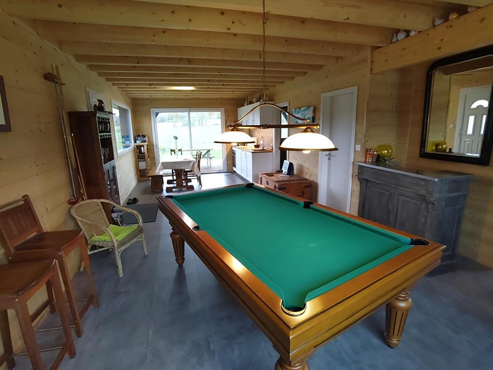 Rez-de-chaussée : pièce à vivre comprenant une partie cuisine et un espace détente avec billard, poêle-cheminée et coin salon, une chambre (1 lit 1.40m), salle d'eau + wc, buanderie. 1er étage : vaste pièce mansardée de 60m² au sol (25m² au dessus de 1.80m de hauteur) avec 4 lits de 0.80m qui peuvent se jumeler (sommiers au sol) et un espace salon, salle d'eau + wc. Parking privé. Chauffage électrique et bois (pellets) compris, draps fournis. Internet Fibre. Borne de recharge pour véhicules électriques à 500m. Option ménage et linge de toilette.