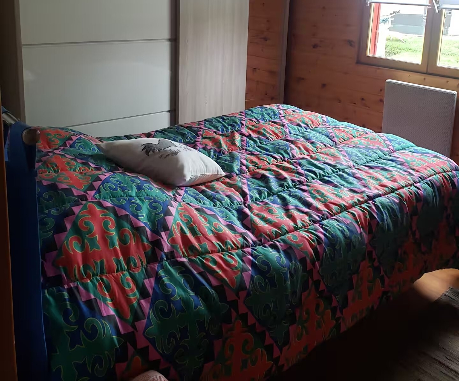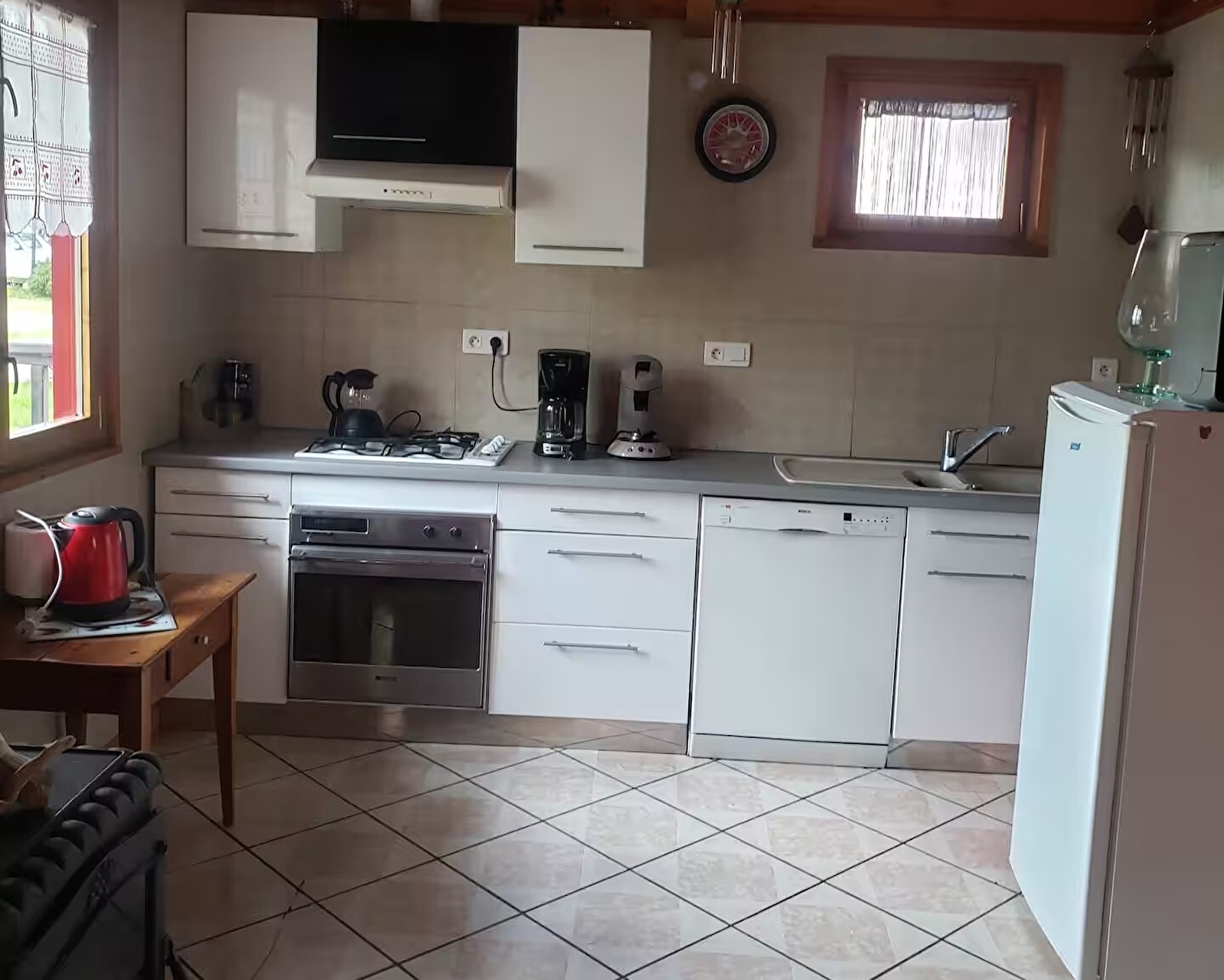 Chauffage avec la cuisinière bois (bûches fournies) et radiateur électrique.