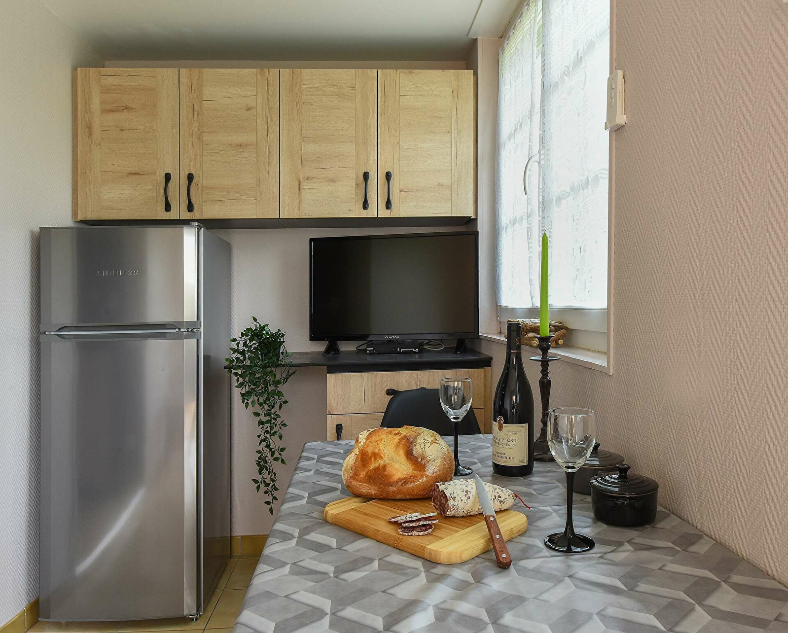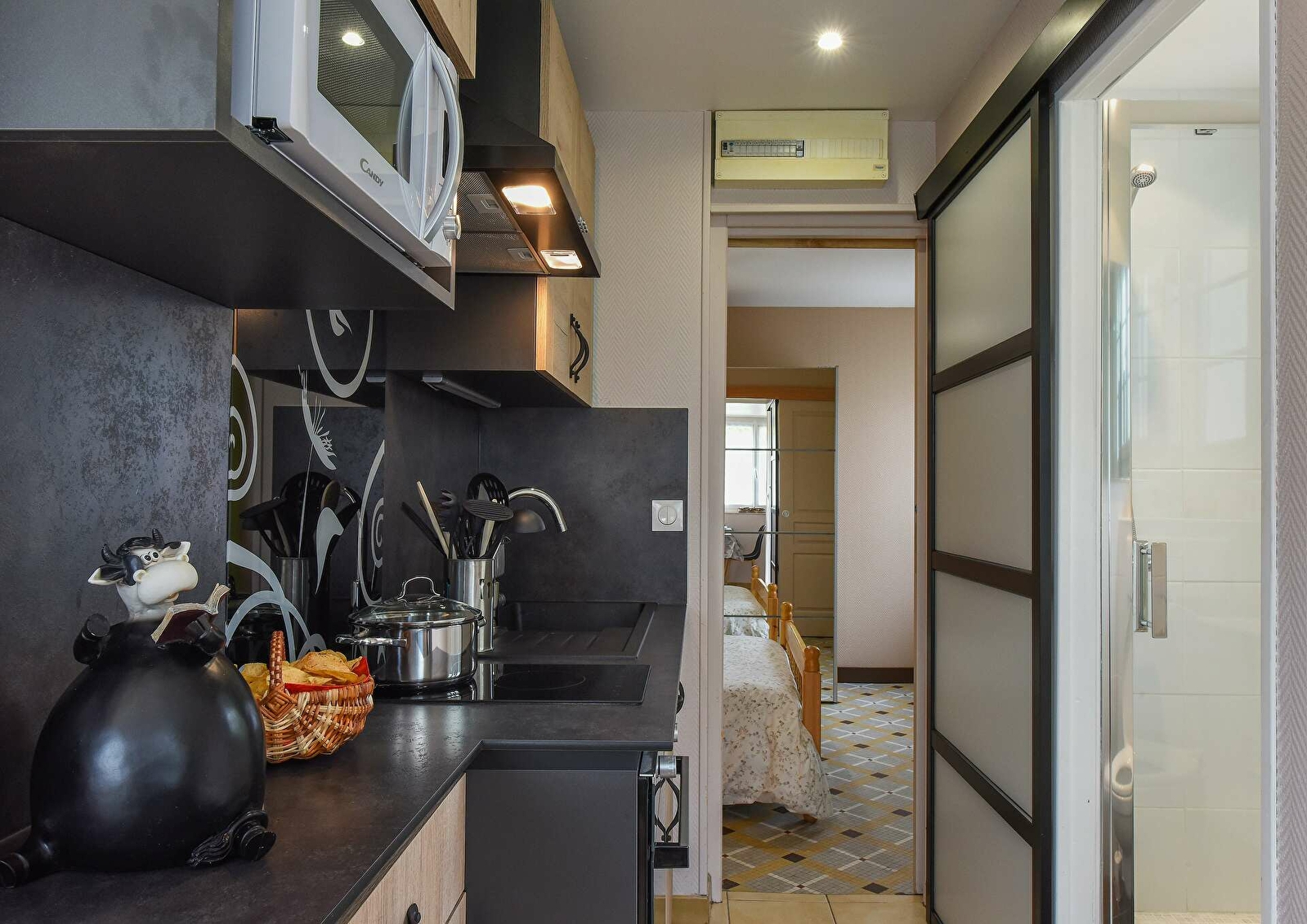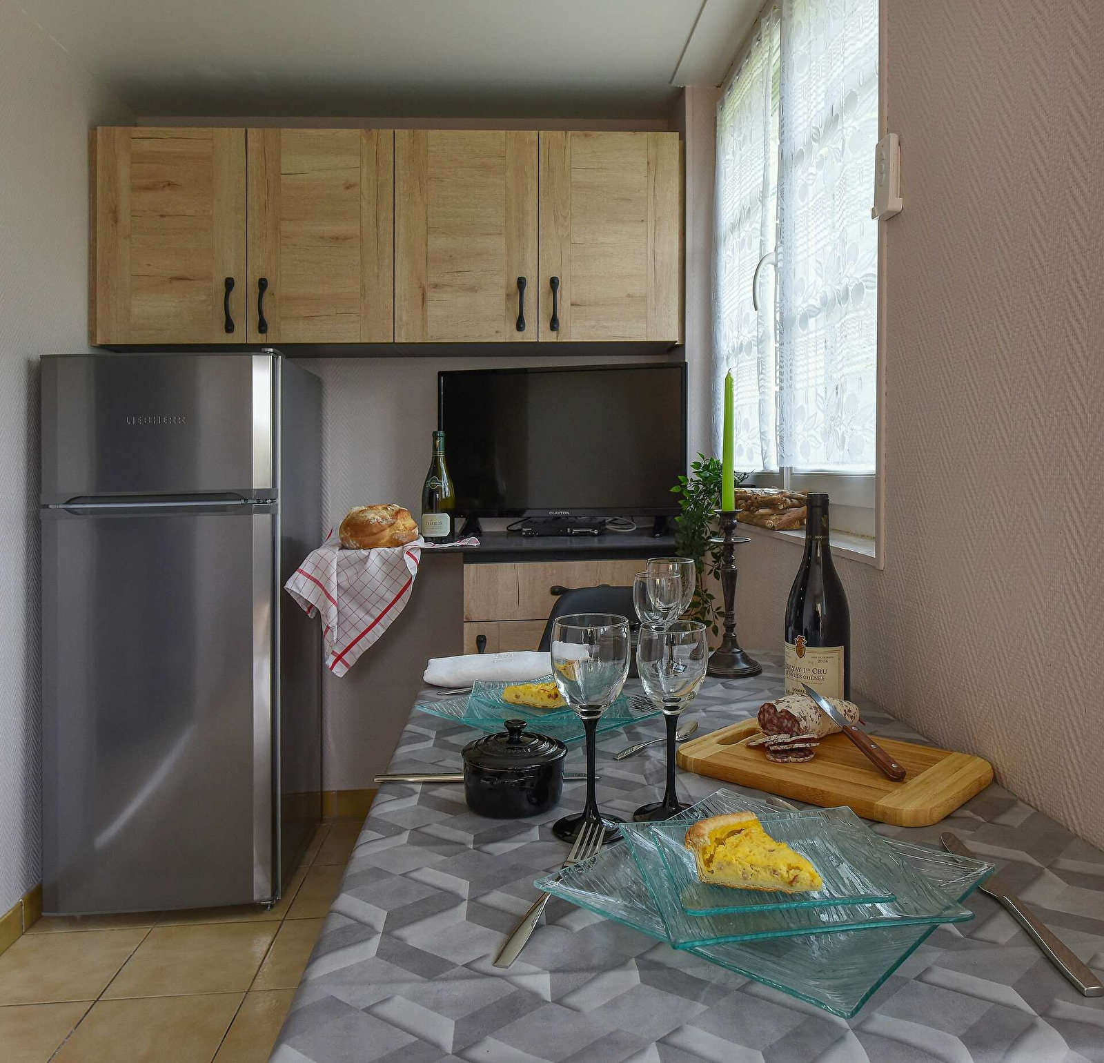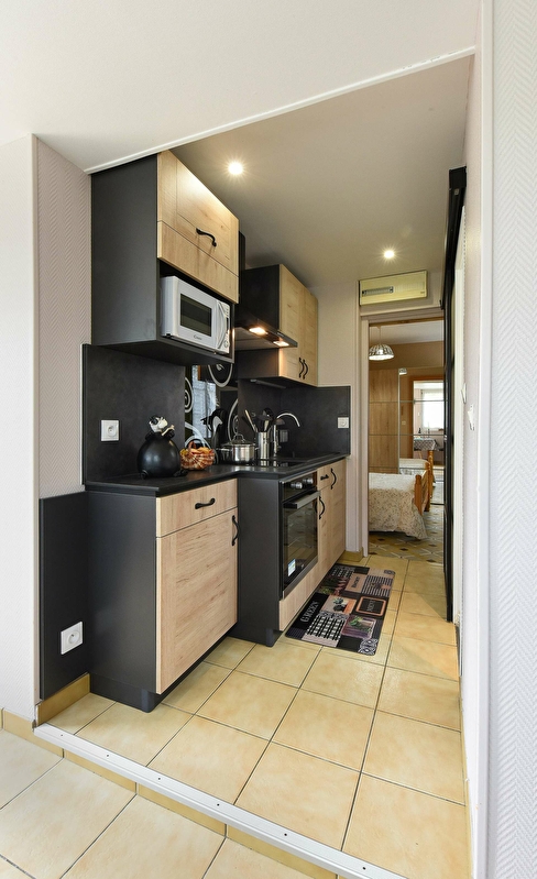- d'un séjour/cuisine équipée très fonctionnelle (avec four traditionnel et four micro ondes) avec téléviseur à écran plat