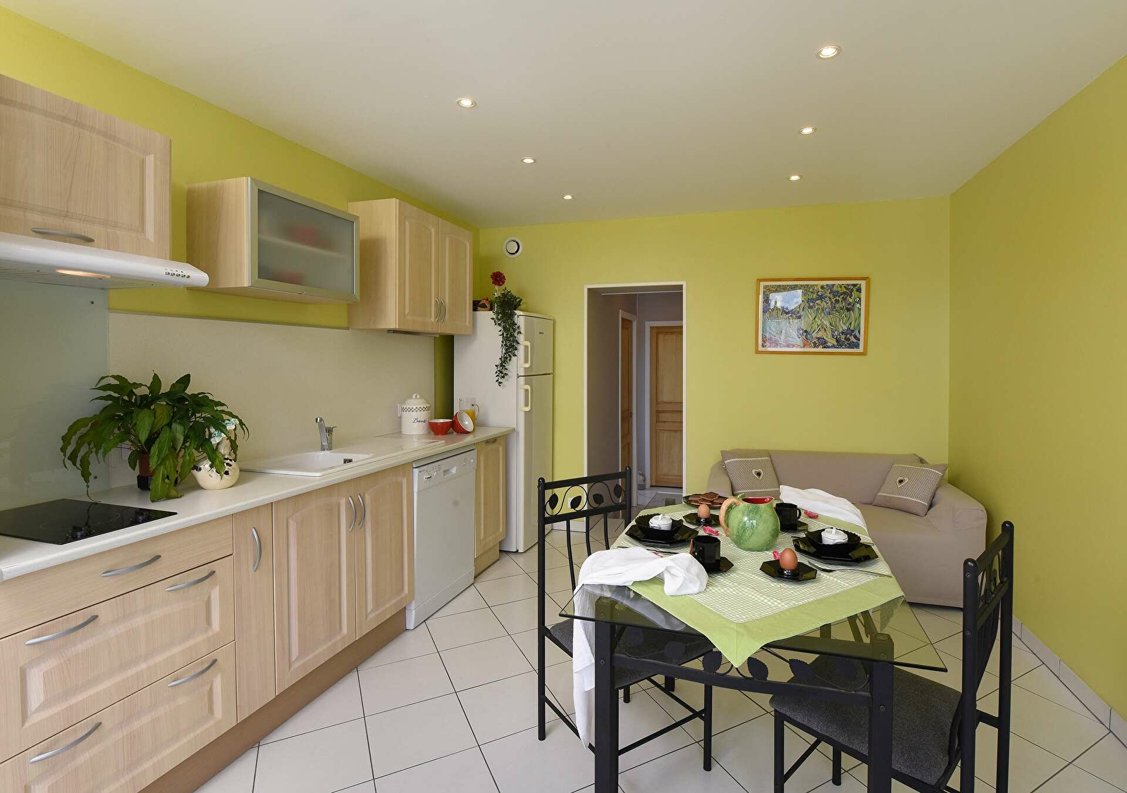 Vous disposerez d'un séjour/cuisine équipée très fonctionnelle (avec four traditionnel et four micro ondes) avec téléviseur à écran plat, d'une chambre avec literie (lit 140) équipée d'un téléviseur à écran plat, d'une salle de bains, d'un WC, d'un lave linge commun, d'un accès wi fi GRATUIT