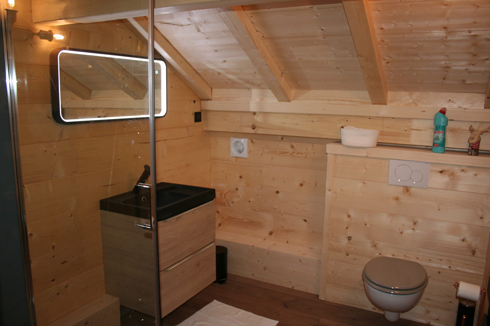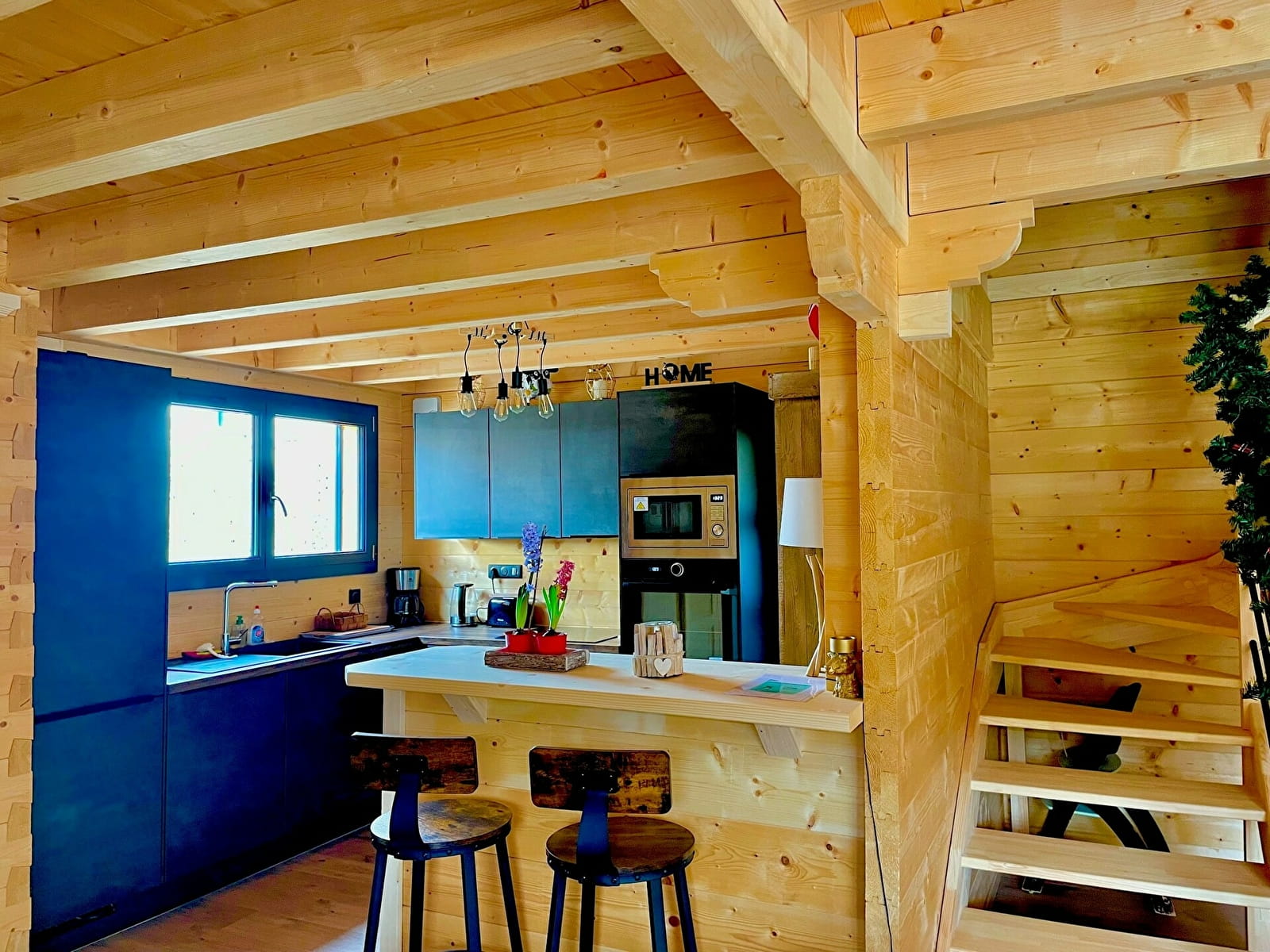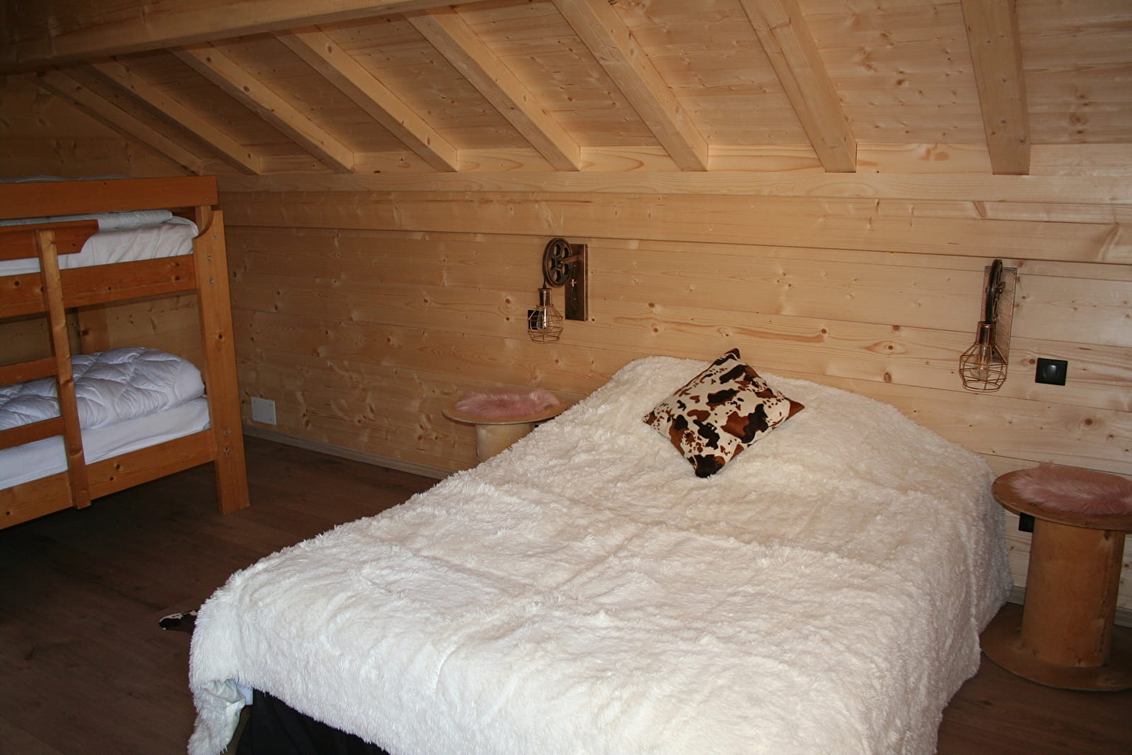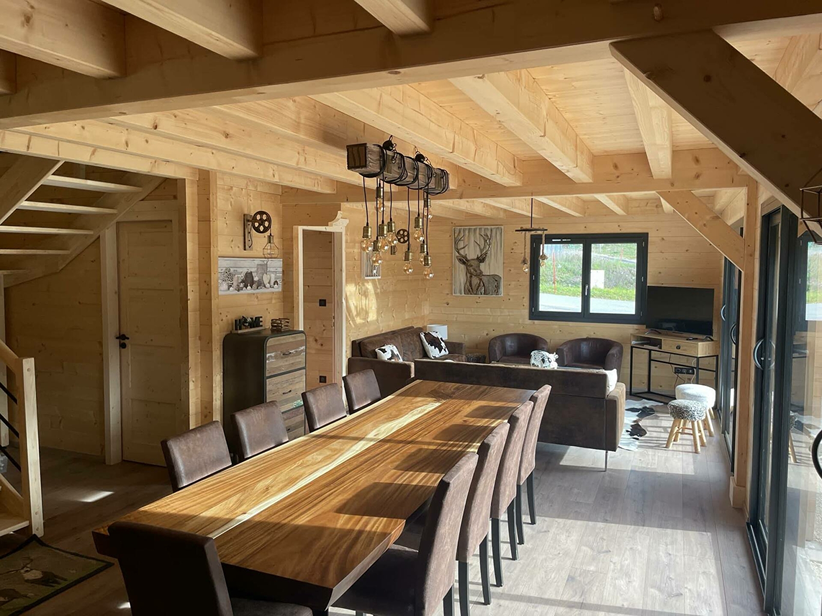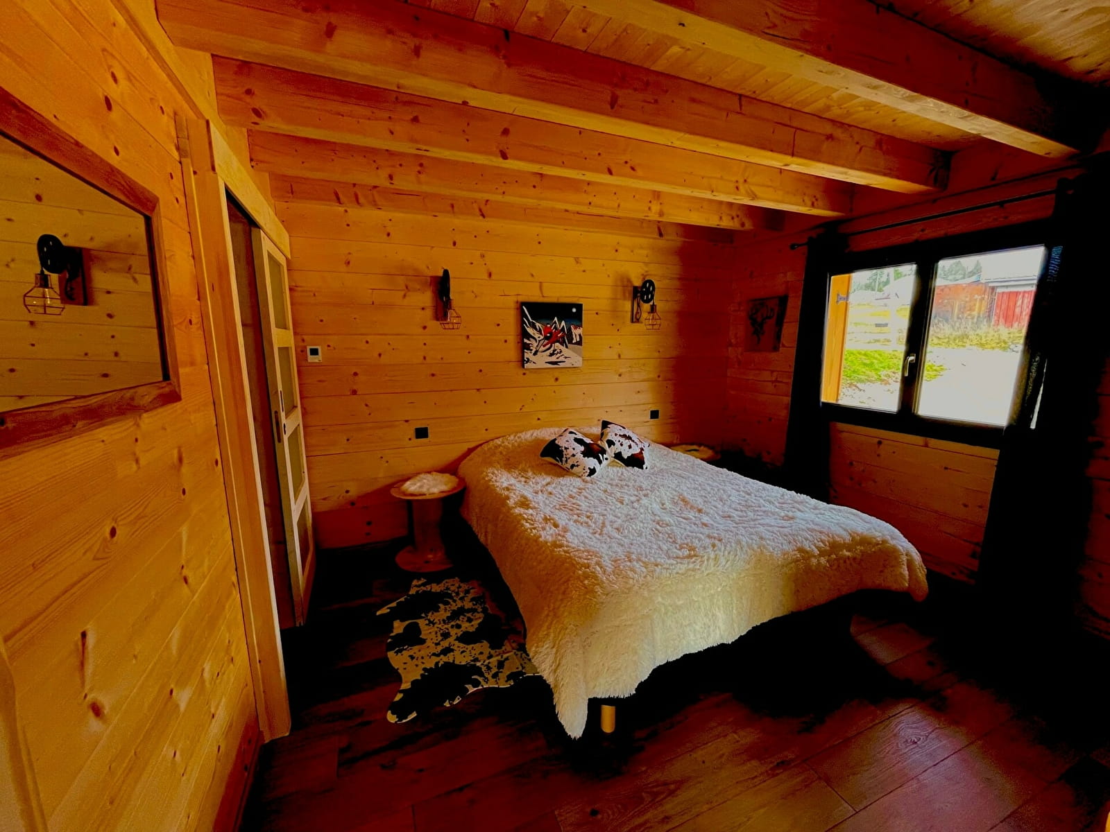 Ce chalet de 142m2 est composé d’une grande pièce principale avec cuisine ouverte sur le séjour et salon ainsi qu’un wc indépendant, une chambre avec sa salle de bains privative
