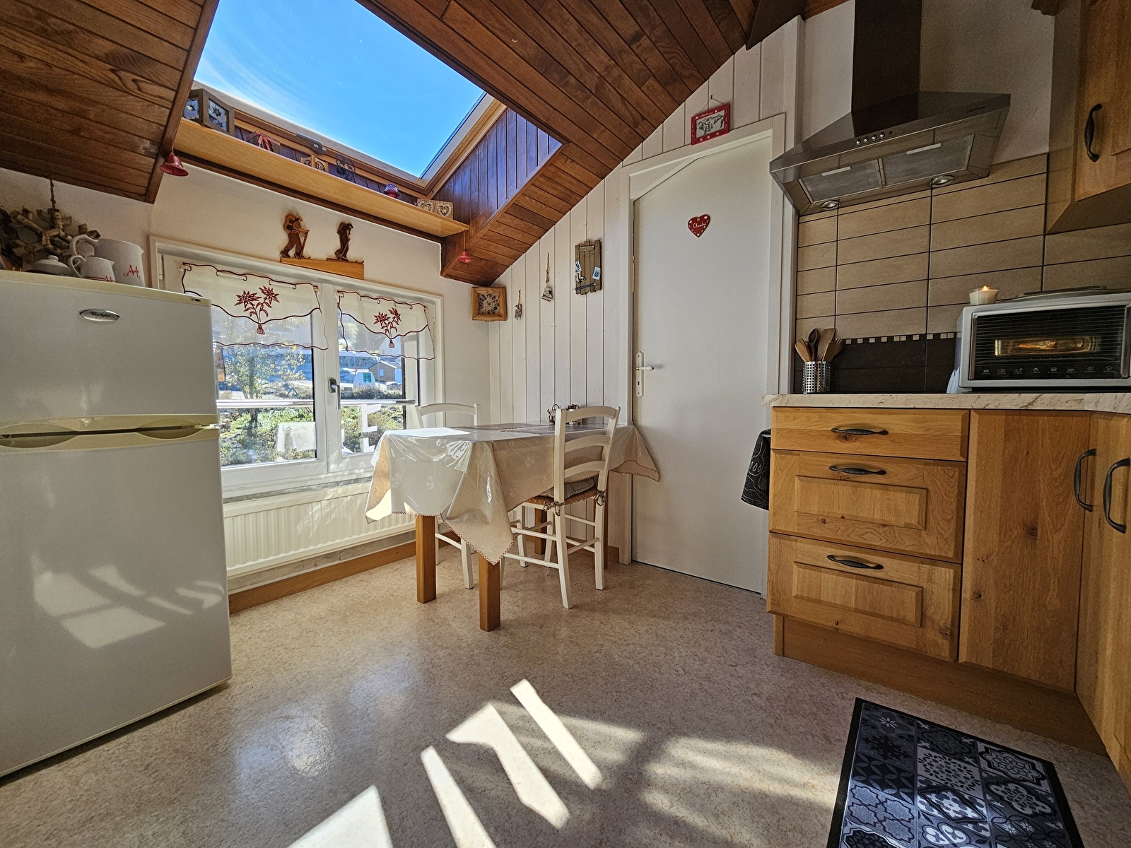 Au 1er étage, vous trouverez une grande pièce de vie avec coin salon. Un second salon avec cheminée à bois s'y trouve également. Une cuisine séparée et une salle de bain avec toilettes se trouvent au même niveau.