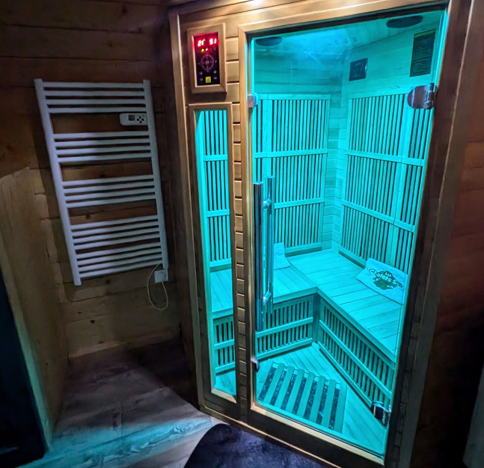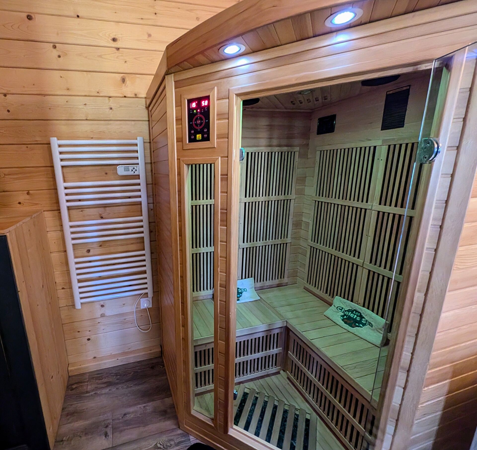 l'hébergement comprend : une kitchenette, une grande chambre avec 1 lit de 160 cm, TV écran plat, une grande pièce/salle d'eau avec Spa, sauna infra-rouge et douche. 1 WC indépendant. Grande terrasse avec salon de jardin offrant une superbe vue sur la nature environnante.