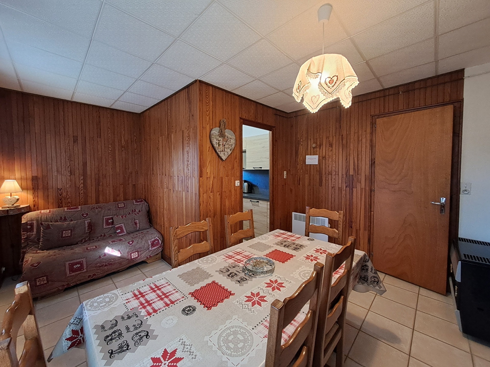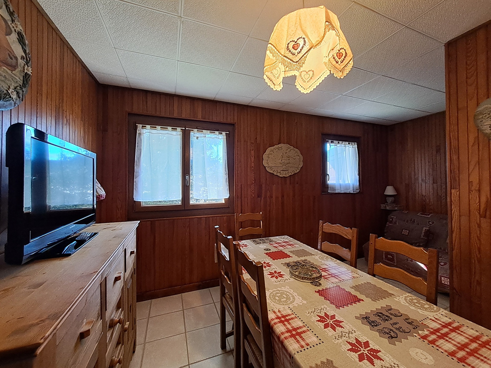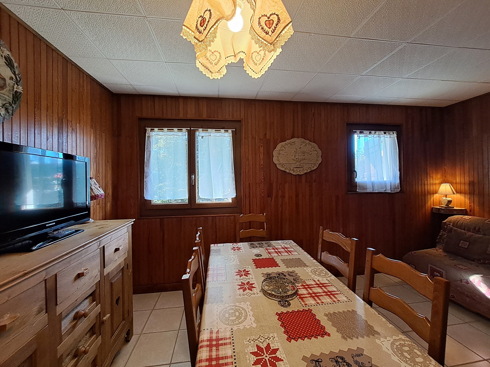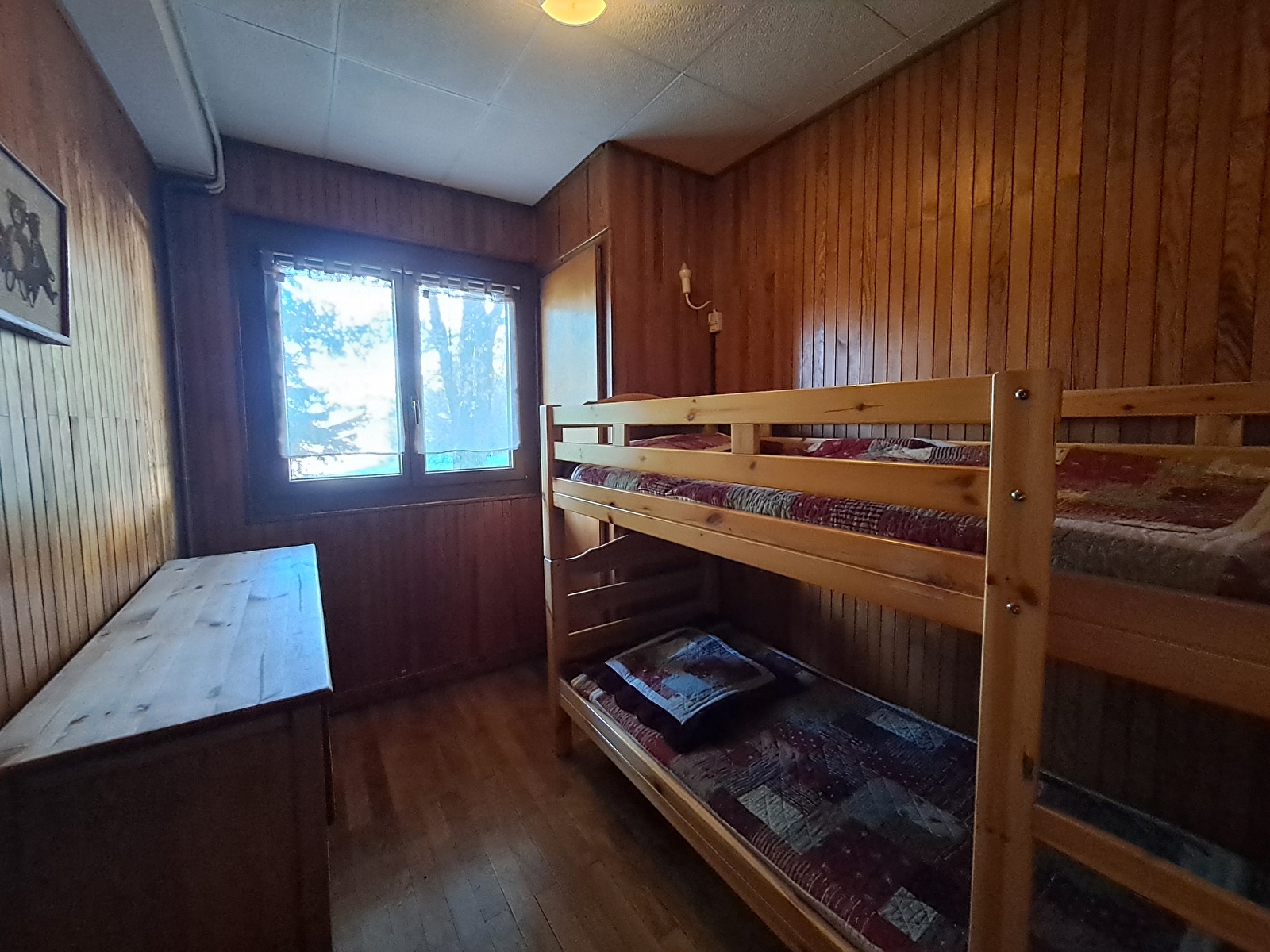 Cet appartement de 35m2 en rez-de-chaussée de chalet est composé d’une pièce principale avec canapé BZ et coin cuisine et repas. Le coin nuit est composé de 2 chambres, la première avec lits superposés et une seconde chambre avec lit en 140 ainsi qu’une salle d’eau et wc séparés.