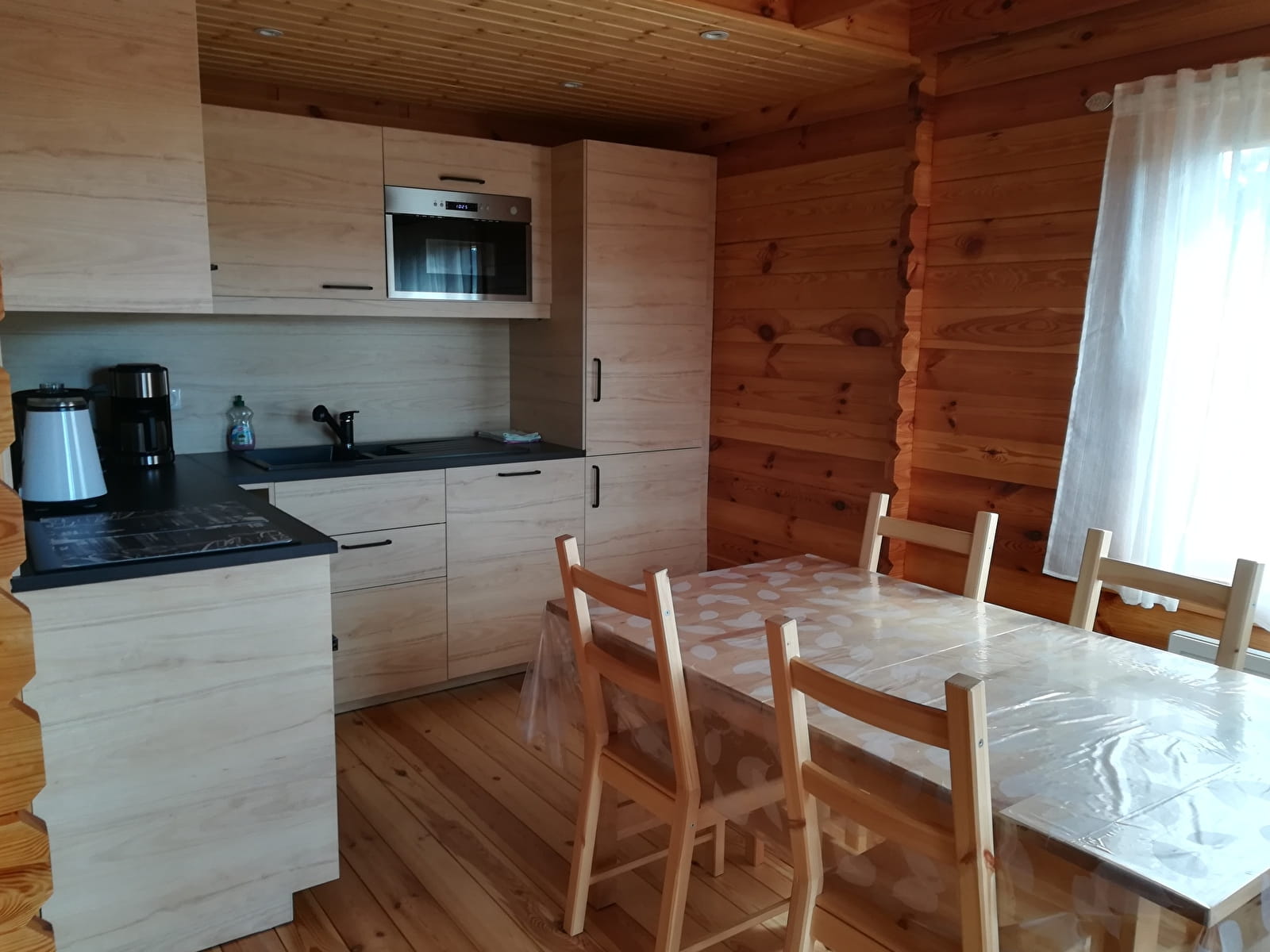 Le chalet est composé au rez de chaussée d'un local à skis avec lave-linge, une grande pièce à vivre avec salon, wifi, télévision, cuisine équipée et toilettes.