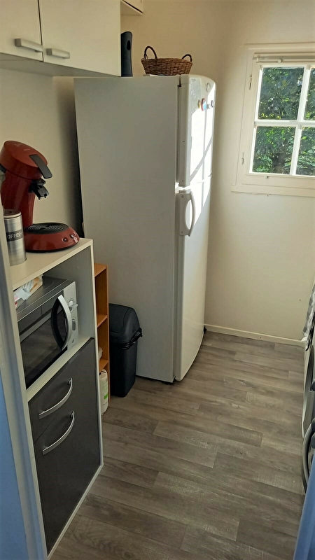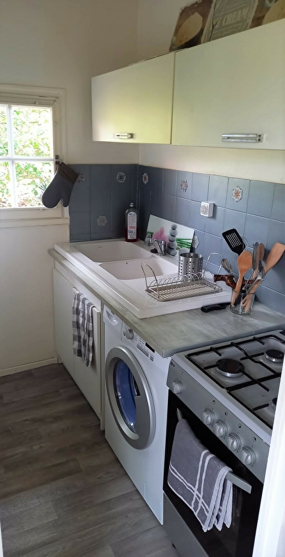 Petite cuisine fort bien équipée avec cuisinière/four au gaz, réfrigérateur/congélateur, four micro-ondes, cafetière Senseo et Machine à laver le linge et lave vaisselle