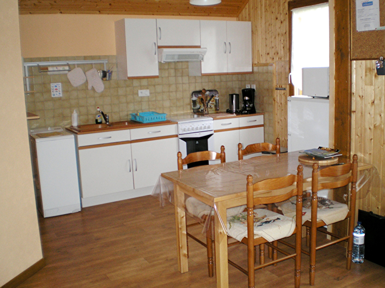 Accès direct à la pièce principale, coin cuisine aménagée, micro-ondes, four, lave-linge, hotte, gazinière, réfrigérateur-congélateur, coin repas, salon avec banquette et fauteuils, TV, 2 chambres : 1 lit de 140, 2 lits de 90, placard de rangement, salle d'eau avec douche et vasque, WC indépendants, local à vélo et planche à voile indépendant et fermé.