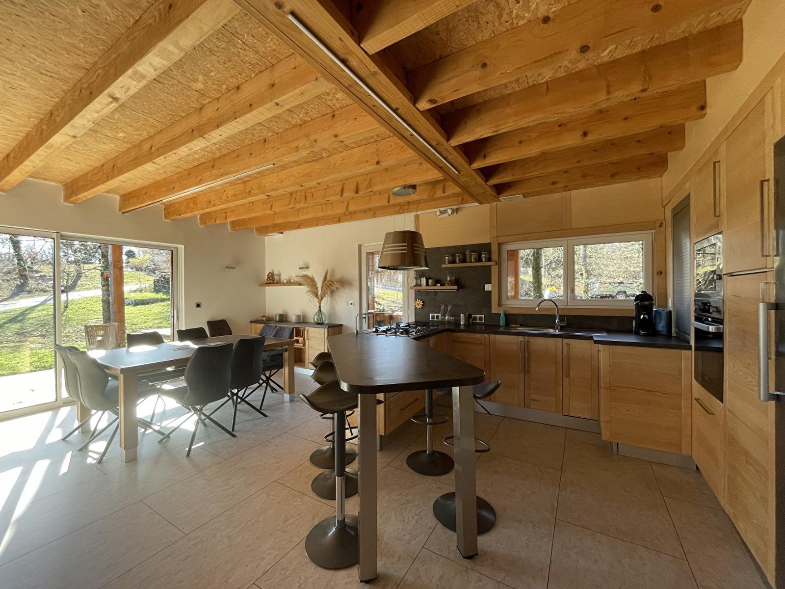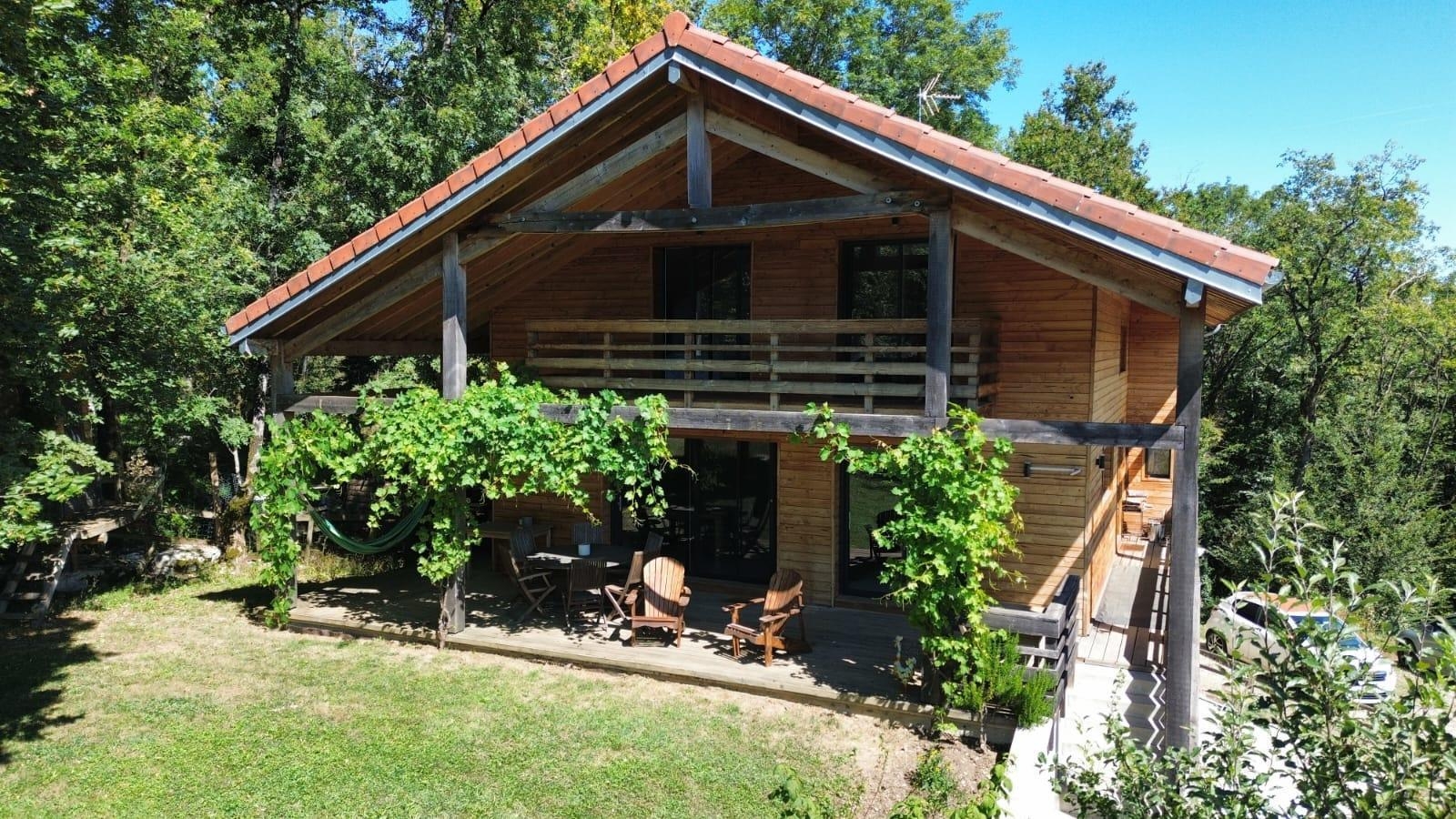 Le Chalet "New Hampshire" est le rêve familial d'Anne-Louise : un lieu pour se retrouver et créer de nouveaux souvenirs, et un lieu à partager. Originaire du New Hampshire aux USA, la propriétaire est tombée amoureuse de la région des lacs et petites montagnes qui lui rappellent chez elle. Dans ce chalet moderne et eco-friendly se compose d'une pièce de vie avec cuisine toute équipée, salon avec TV et poêle à bois, d'une chambre avec 1 lit double (140*190), d'une salle d'eau avec baignoire et douche à l'italienne et d'un WC indépendant. A l'étage une mezzanine avec un petit salon agrémenté d'une TV, de livres et de jeux de société, un coin bureau idéal pour le télétravail, 2 chambres avec chacune un lit double (140*190) et 1 chambre avec 1 lit double (140*190) et 2 lits superposés, une salle d'eau avec douche et un WC indépendant. Côté extérieur, vous pourrez profiter d'une belle terrasse agrémentée d'un salon de jardin et d'un barbecue.Un garage vous permettra de mettre à l'abri vos vélos ou motos Idéalement situé pour les amoureux de randonnées cyclo, pédestre et équestre, vous pourrez également partir à la découverte des lacs et cascades et vous rendre à Bourg-en-Bresse en 30 minutes pour visiter le célèbre monastère royal de Brou. Vous pouvez trouver aussi un terrain pétanque sur place (communale mais juste derrière le chalet sur le chemin de terre). Tennis à 8km (Aromas). Il y a aussi des randonnées sur place, avec chemins balisés. A noter: le sous-sol est loué à l'année.