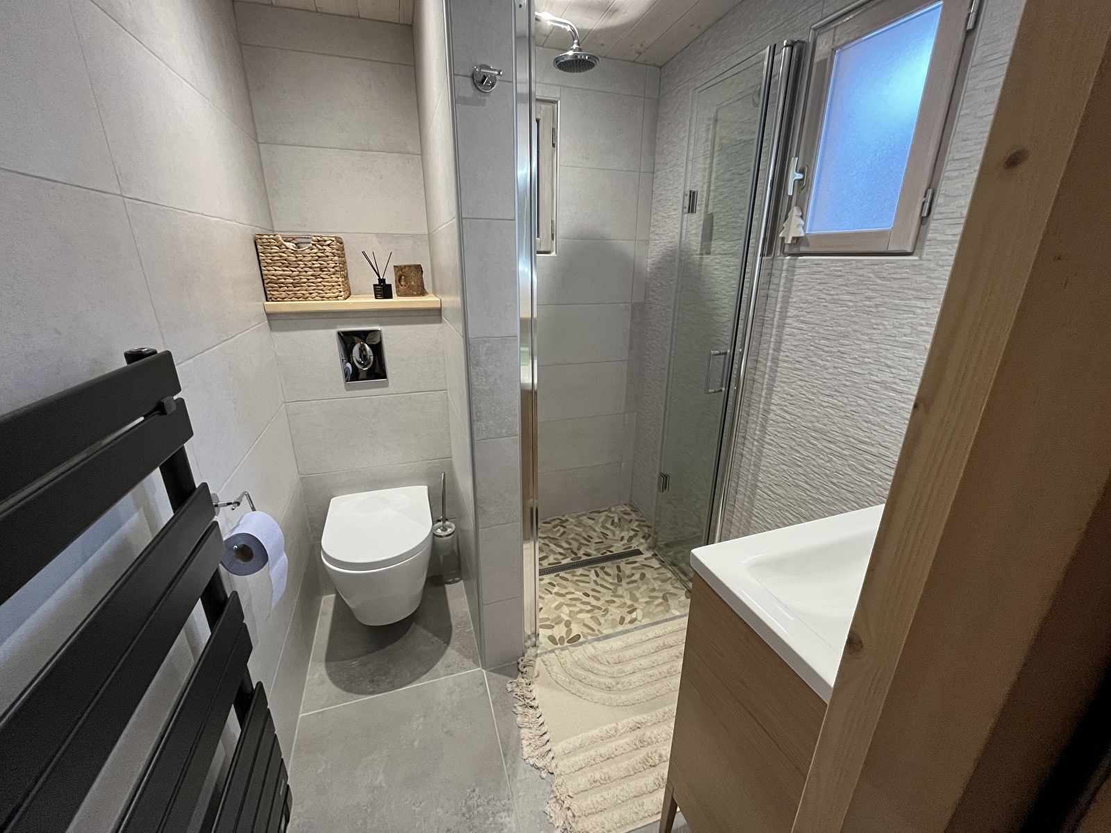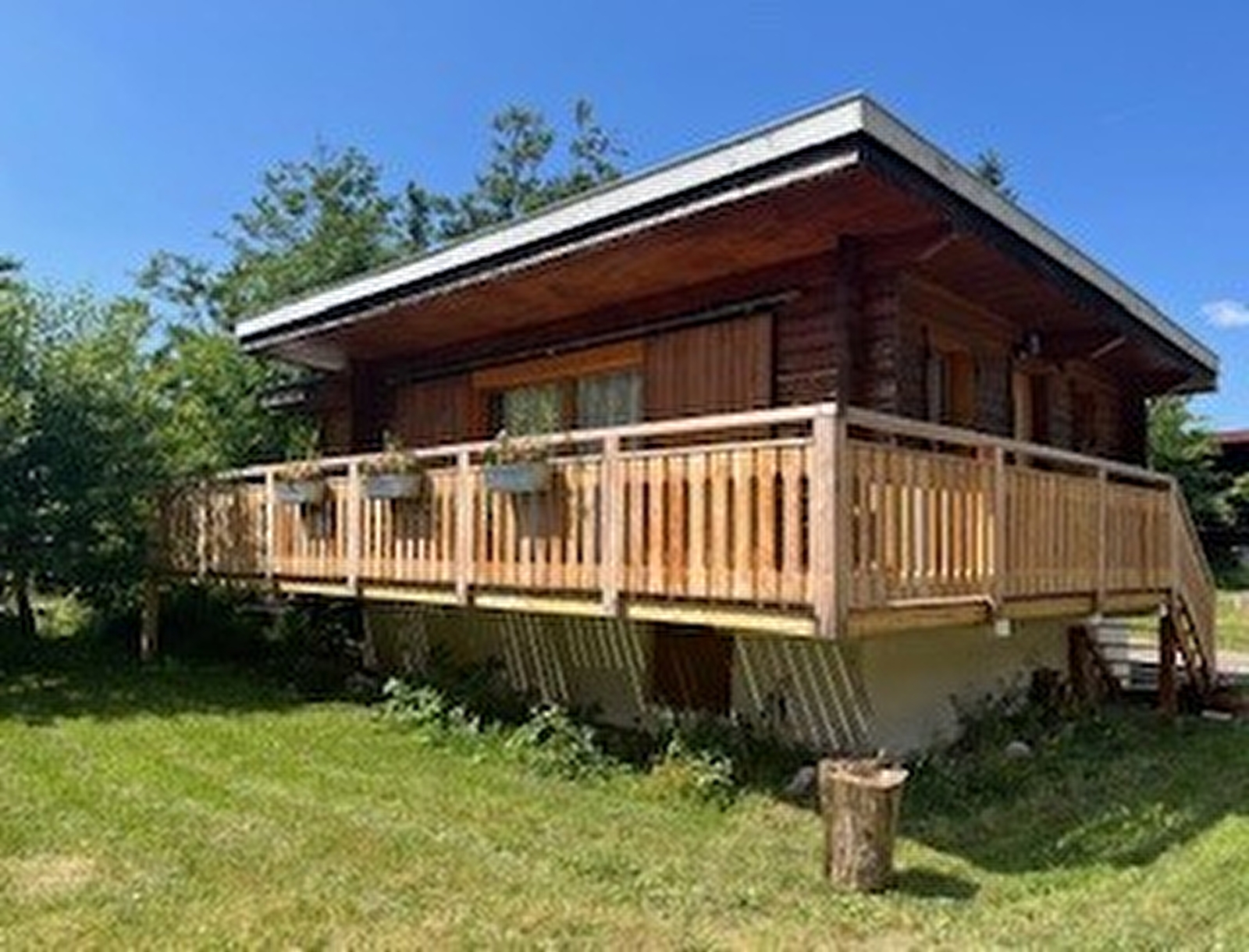 Ce chalet de 35m2 est composé d’une pièce principale avec coin repas, cuisine et salon avec canapé clic-clac, d’une chambre avec lit en 140, d’une salle d’eau avec douche et d’un wc séparé.