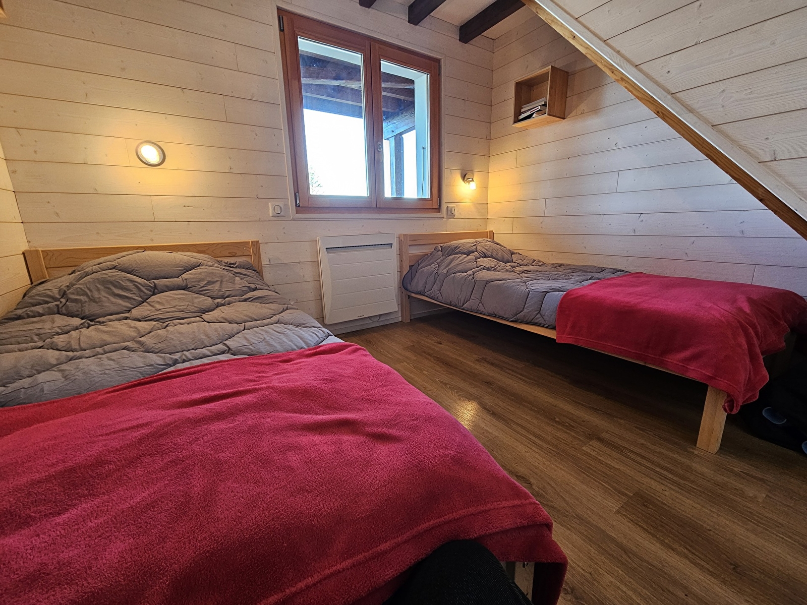 Dans ce chalet indépendant de 85m2 vous trouverez au rez-de-chaussée un hall d’entrée avec local a ski, ainsi que 2 chambres, l’une avec 2 lits simples et l’une avec 1 lit double, une salle d’eau et un WC complète le tout. A l’étage vous trouverez une pièce principale avec coin salon et coin cuisine-repas.