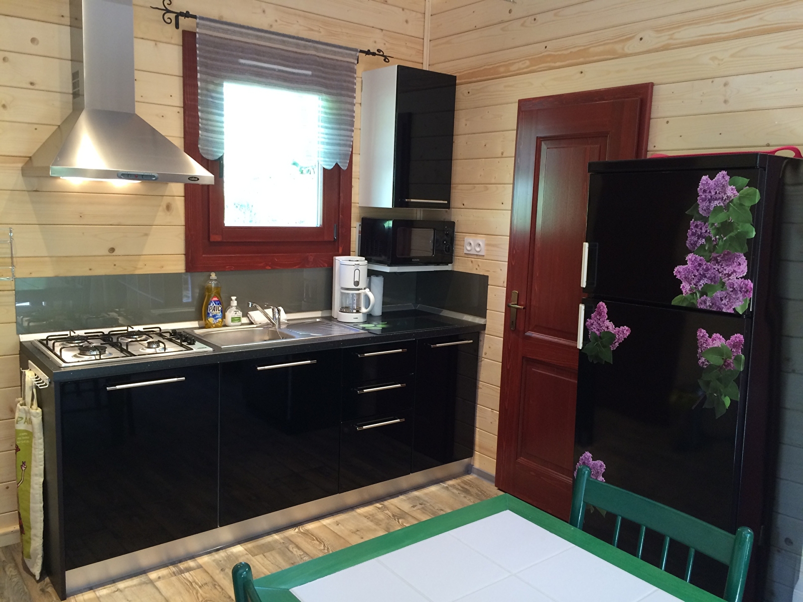 Depuis la terrasse en bois, s'ouvre le grand séjour avec sa superbe cuisine laquée en noir. Avec ses deux chambres (1 lit double et 1 lit gigogne pour 1 ou 2 personnes) et son salon en alcôve, la résidence accueille jusqu'à 6 personnes. Une magnifique salle de bain toute en bois avec belle douche-lune et WC séparé. Parking privé.