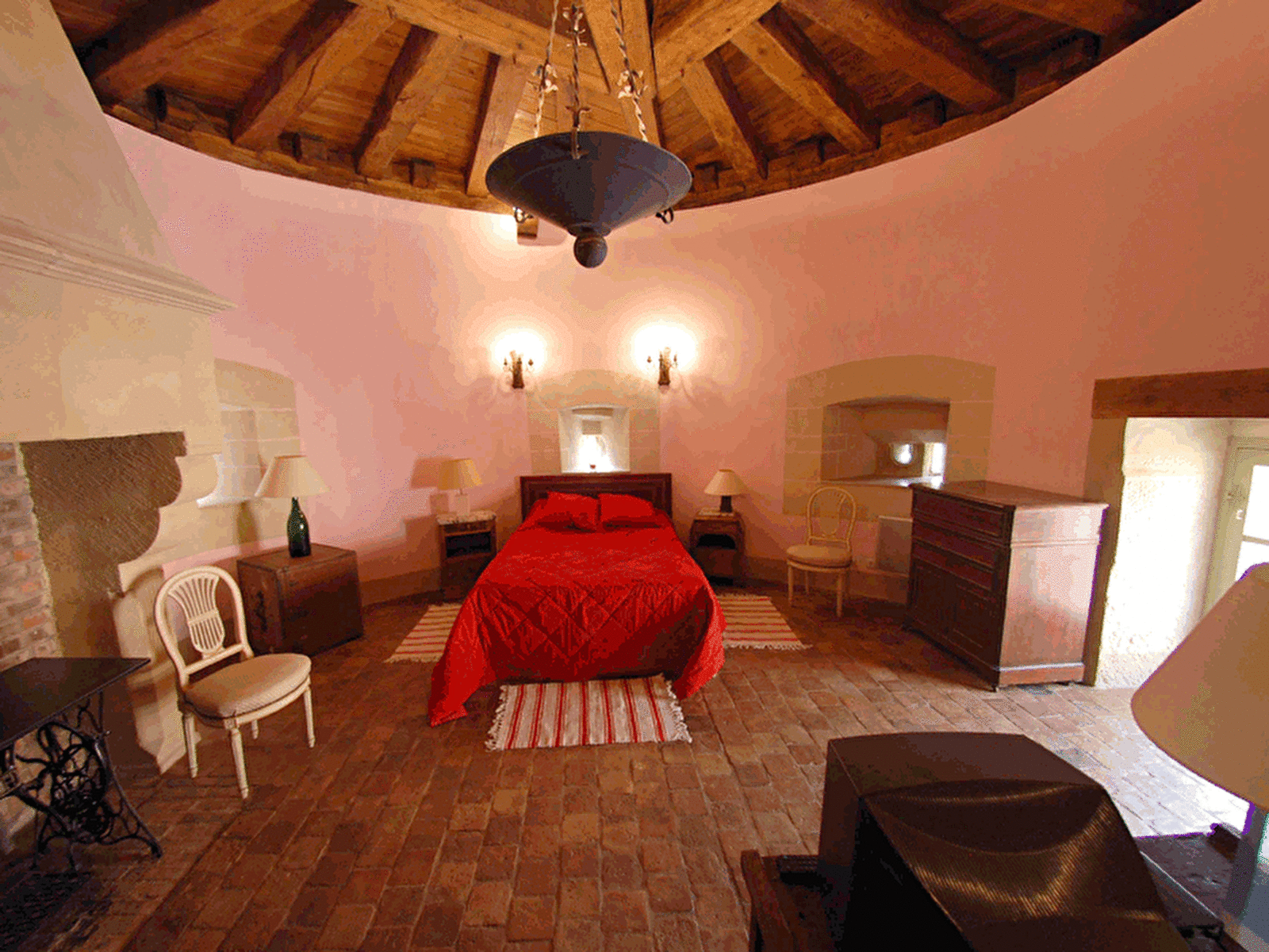 - Second étage : Chambre à coucher, plafond à la française, cheminée monumentale, fenêtre et meurtrières, salle d'eau avec petite fenêtre donnant sur l'étang, douche, lavabo et WC.