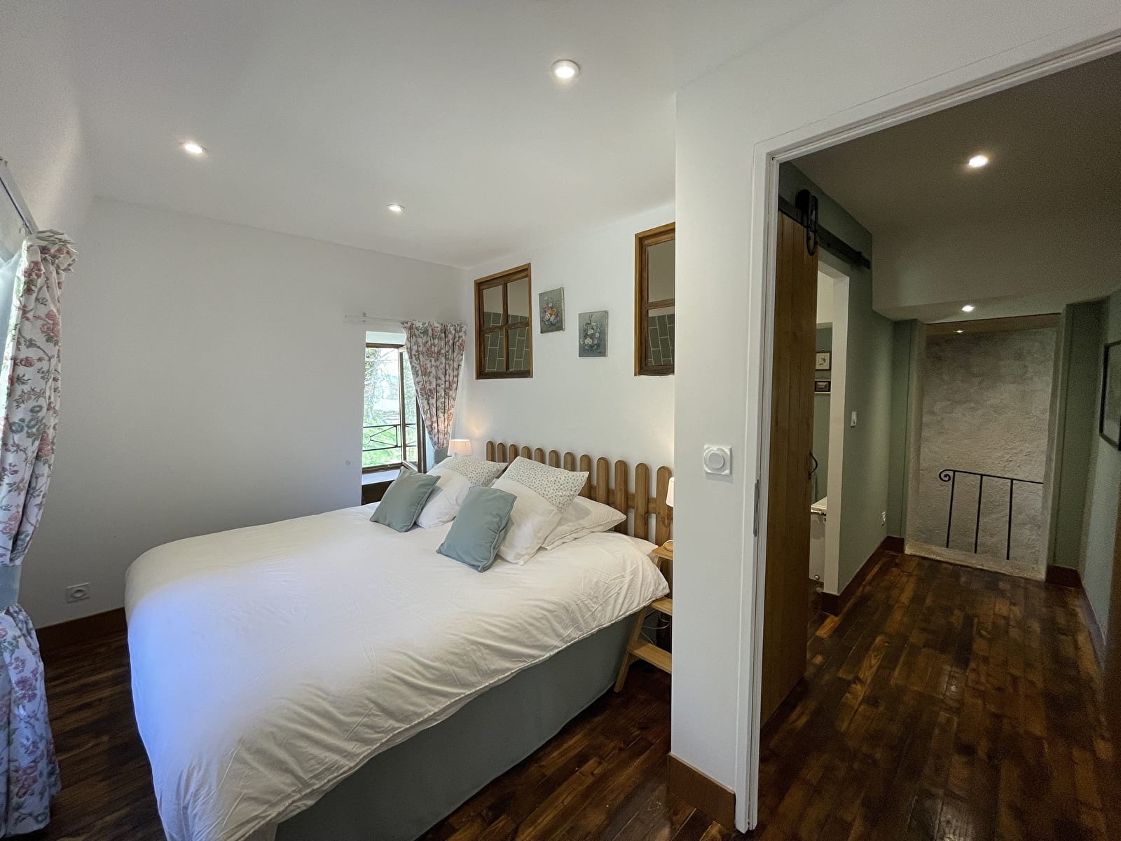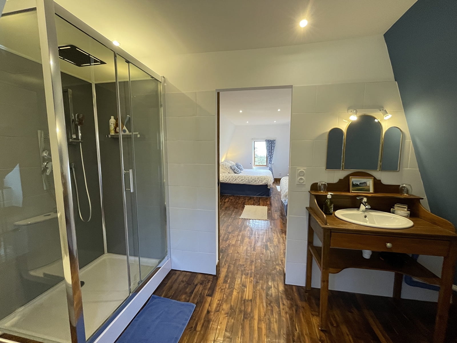 Au rez-de-chaussée, une grande chambre facilement accessible pour les personnes à mobilité réduite et donnant sur une salle de bain et sa douche à l’italienne de plein pied.
