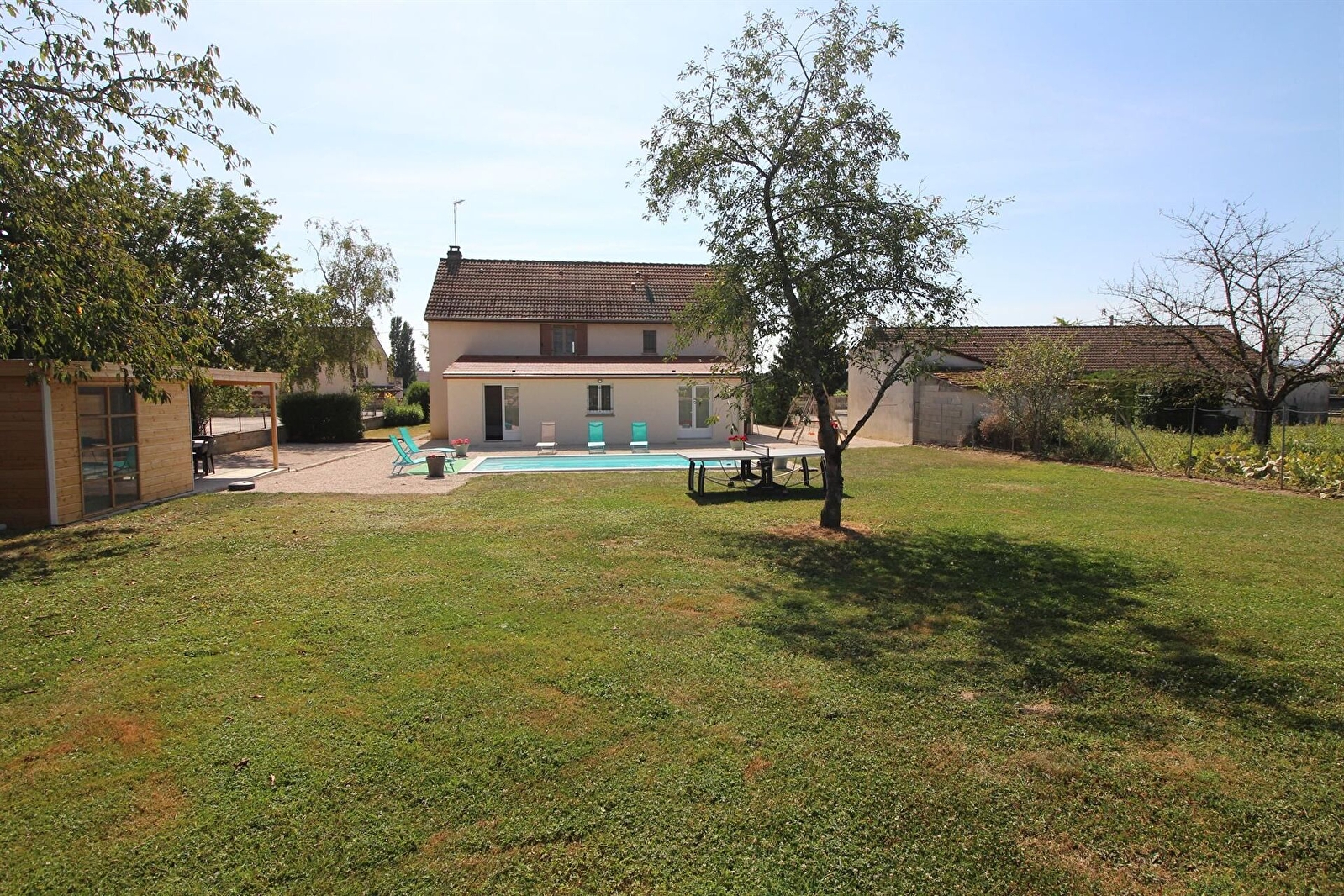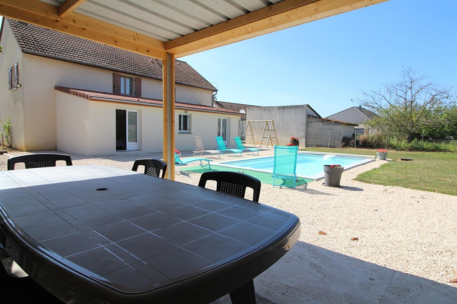 Piscine non chauffée de 7m x 3,5m et profondeur de 0,90 m à 1,60 m. ouverte de mi-mai à octobre selon météo.
