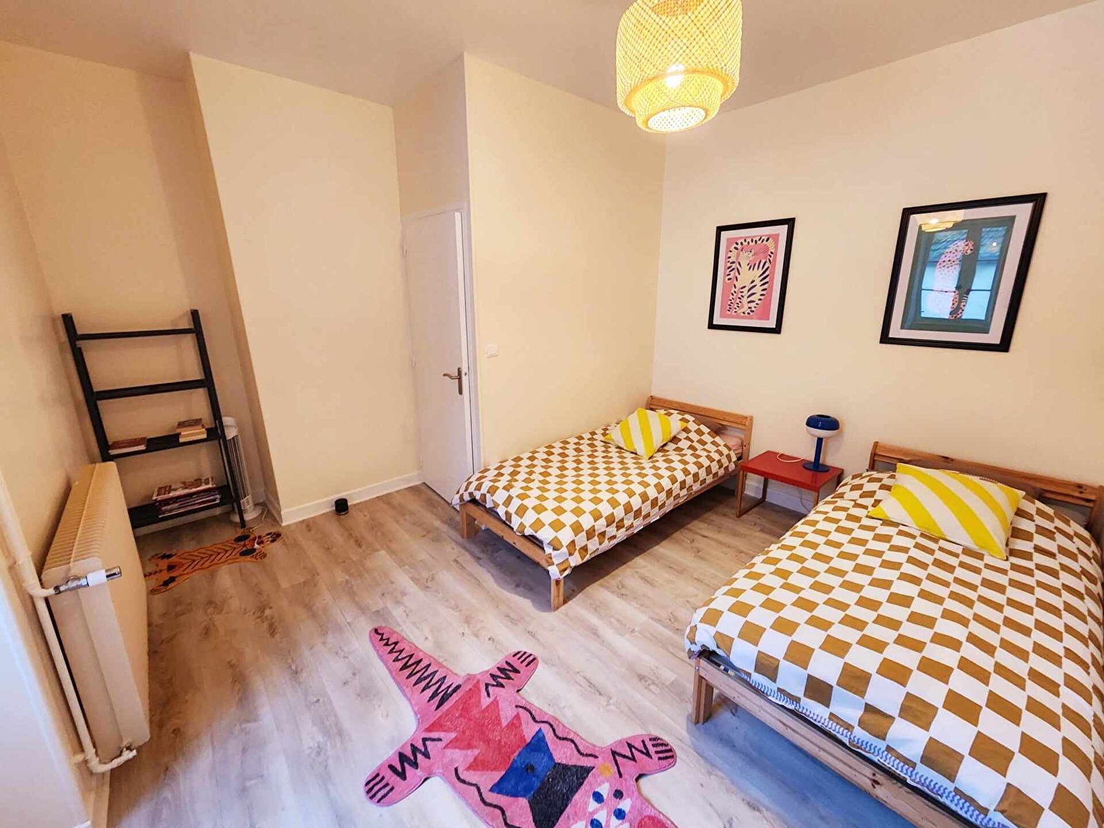 Cet appartement lumineux offre 3 chambres, une chambre avec un lit queen-size (160x200), une chambre avec un clic-clac converti en lit et une dernière chambre avec 2 petits lits pour enfants, un grand salon/salle à manger, une cuisine équipée, une salle de bain et des WC séparés.