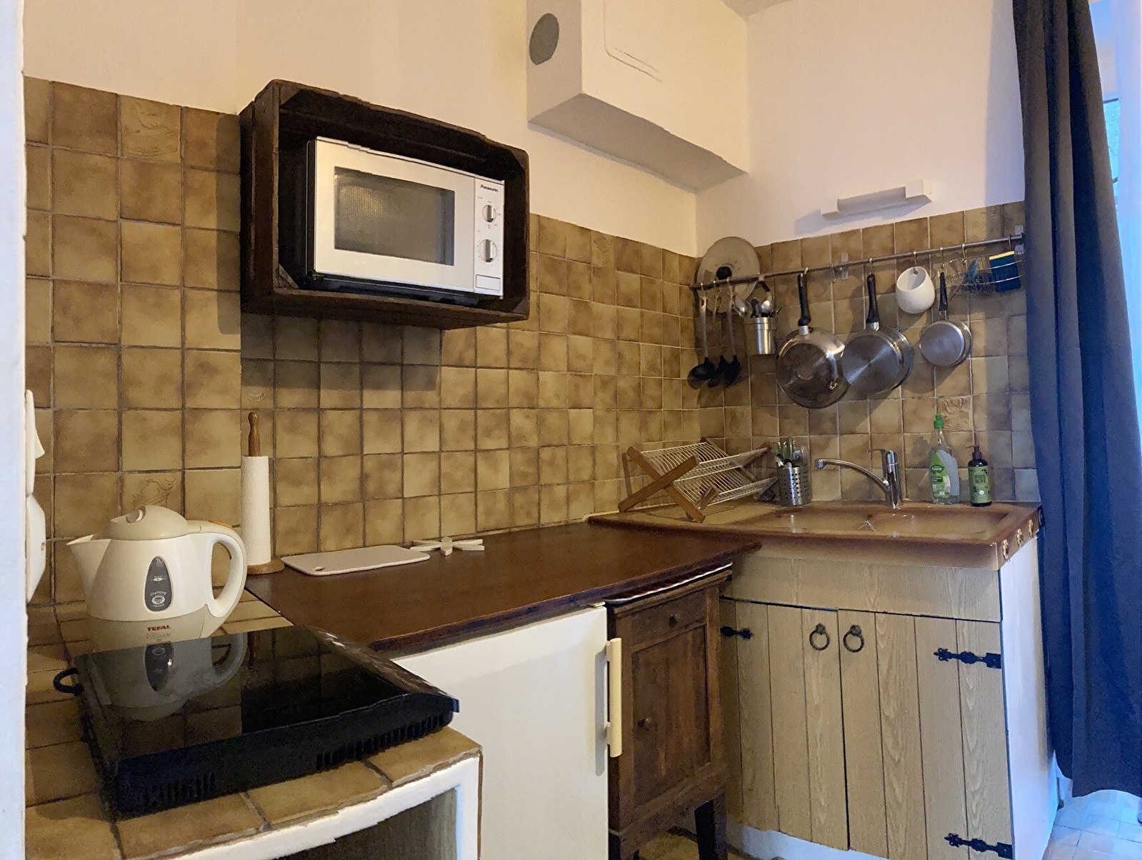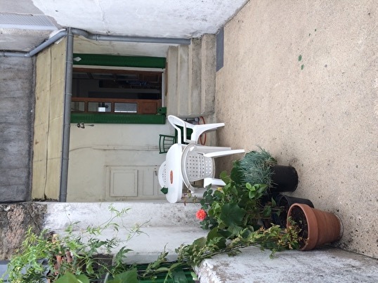 Coin cuisine, terrasse, deux chambres, salle de douche avec wc.