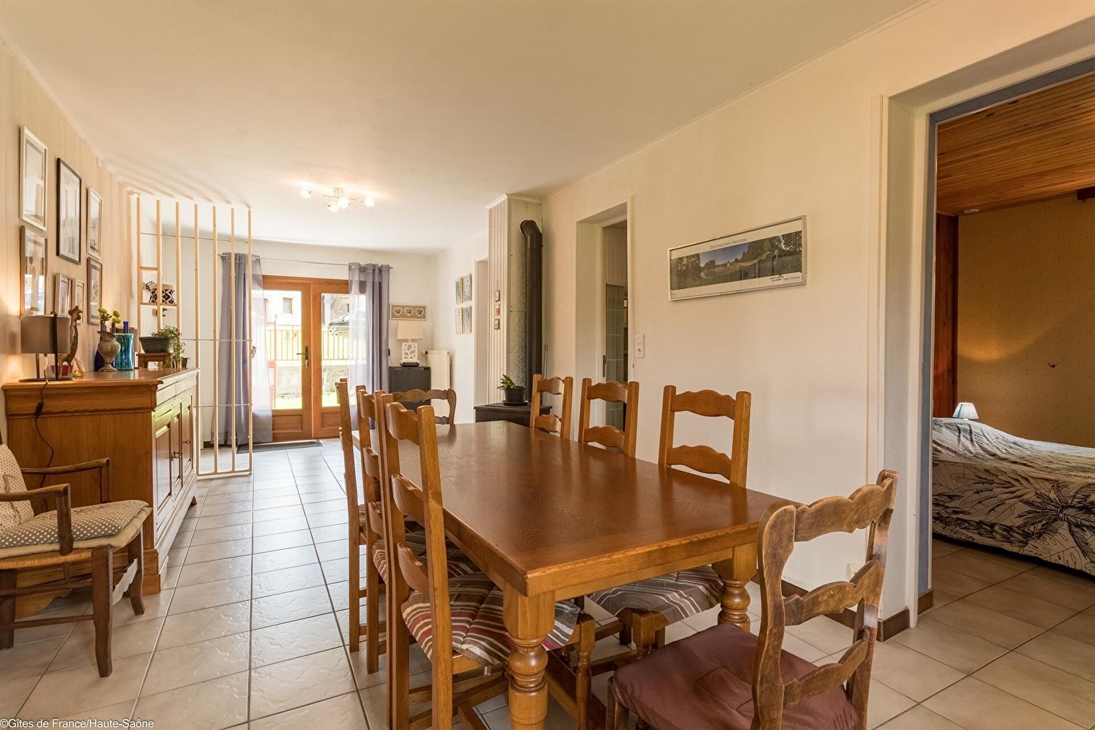 -Rez-de-chaussée : salle à manger avec poêle à bois, cuisine intégrée, salon, une chambre avec un lit 140, une chambre avec 2 lits 90, 2 salles d'eau avec WC.