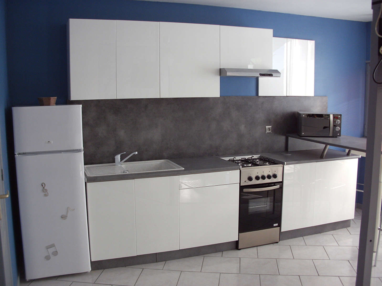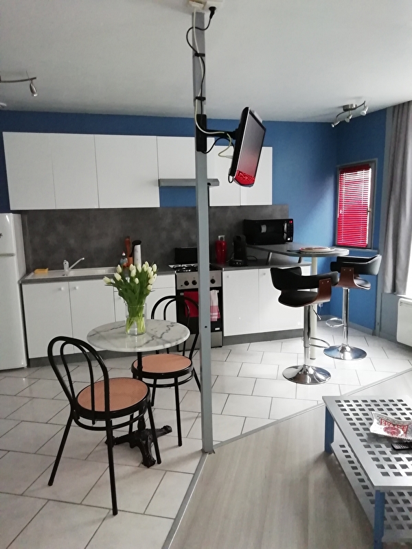 Pièce de vie à la décoration contemporaine avec canapé BZ, télévision, internet, cuisine équipée (gazinière, micro-ondes, réfrigérateur, cafetière Senséo, bouilloire, grille-pain), espace chambre indépendant avec lit 140, salle de bain douche, wc séparé.