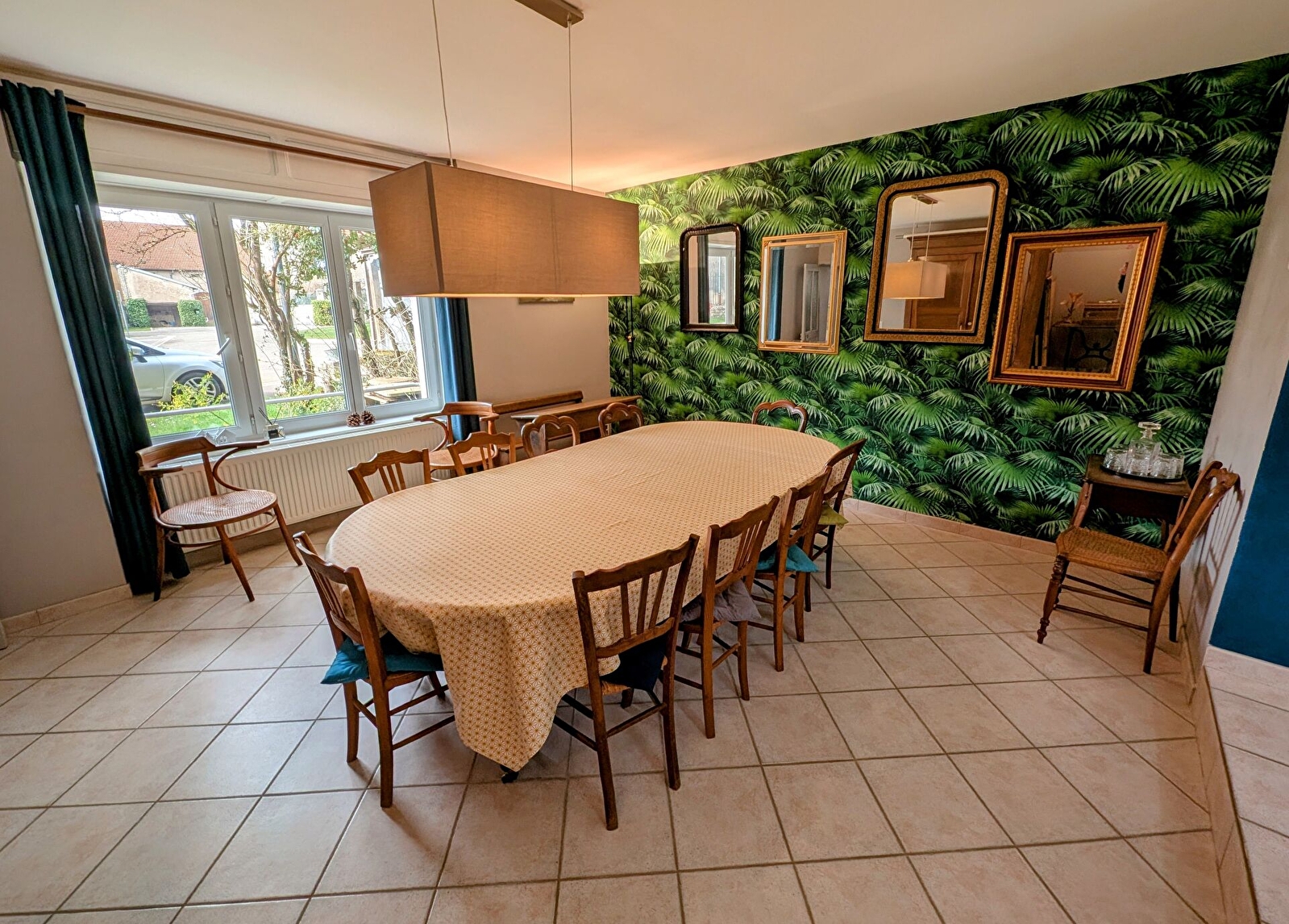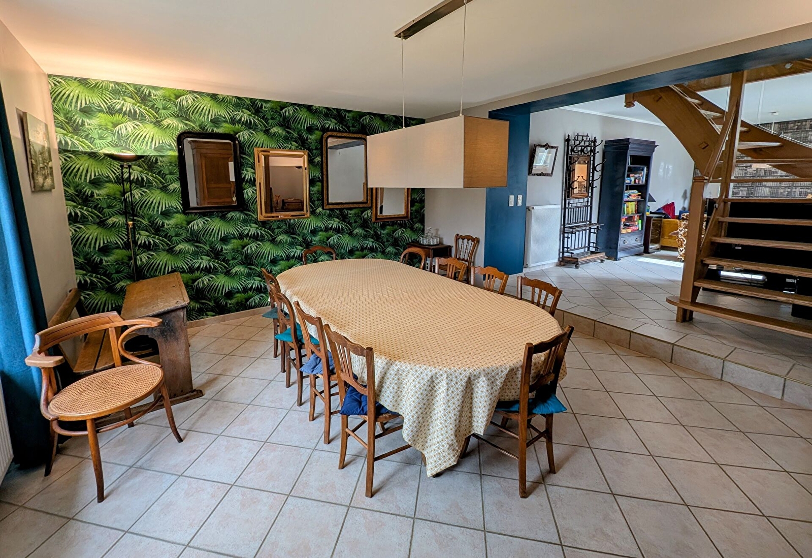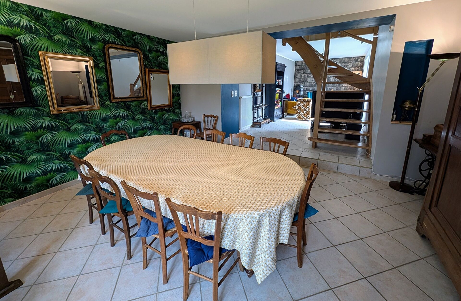 – Une grande salle à manger avec coin salon lumineux.