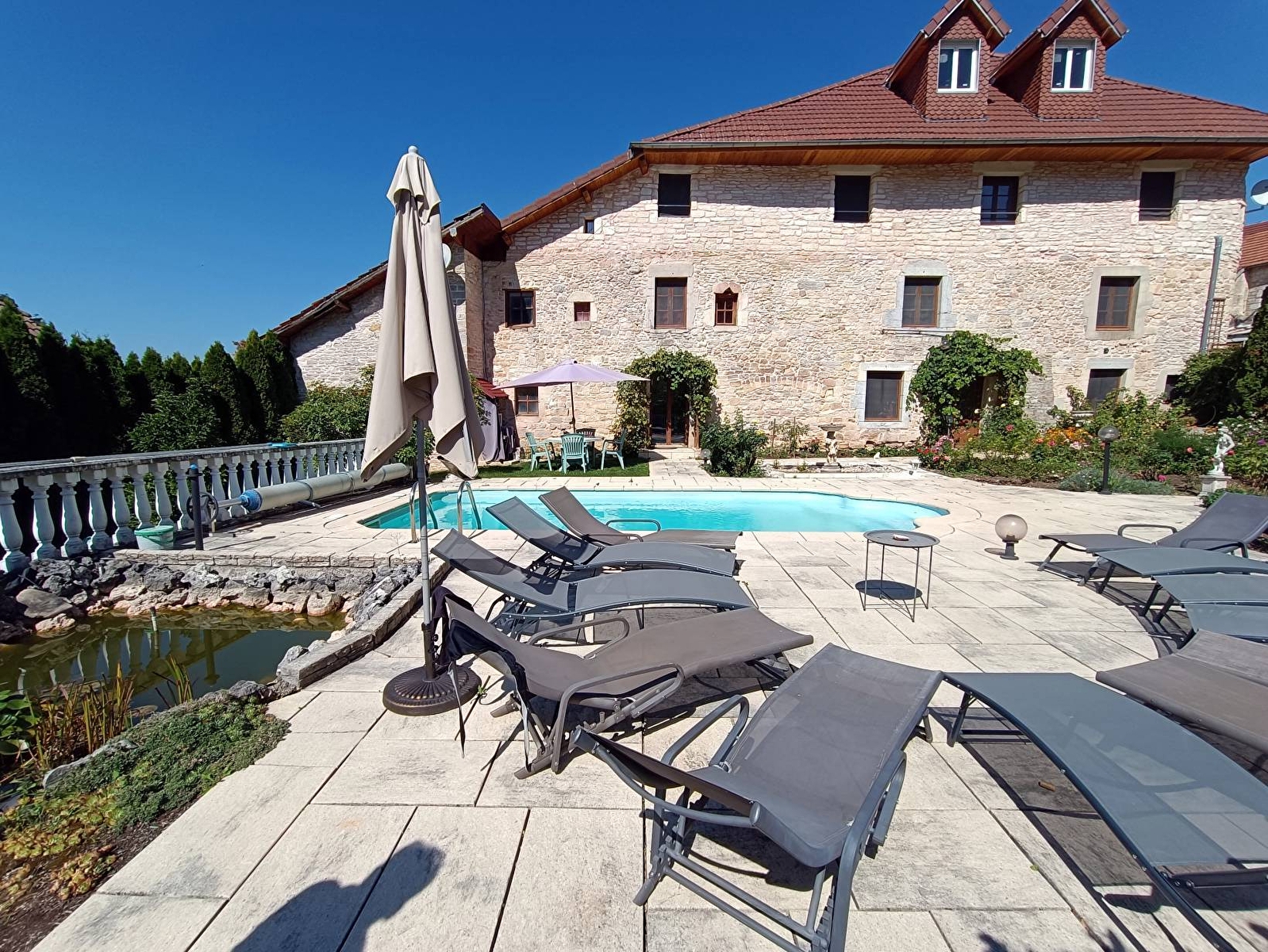 Au cœur du massif du Jura, cette élégante demeure de 1786 restaurée avec raffinement offre un cadre d’exception entre Besançon et la Suisse. Dans une atmosphère paisible, profitez d’un espace bien-être, d’un vaste parc arboré et d’une piscine pour un séjour alliant charme, sérénité et confort.