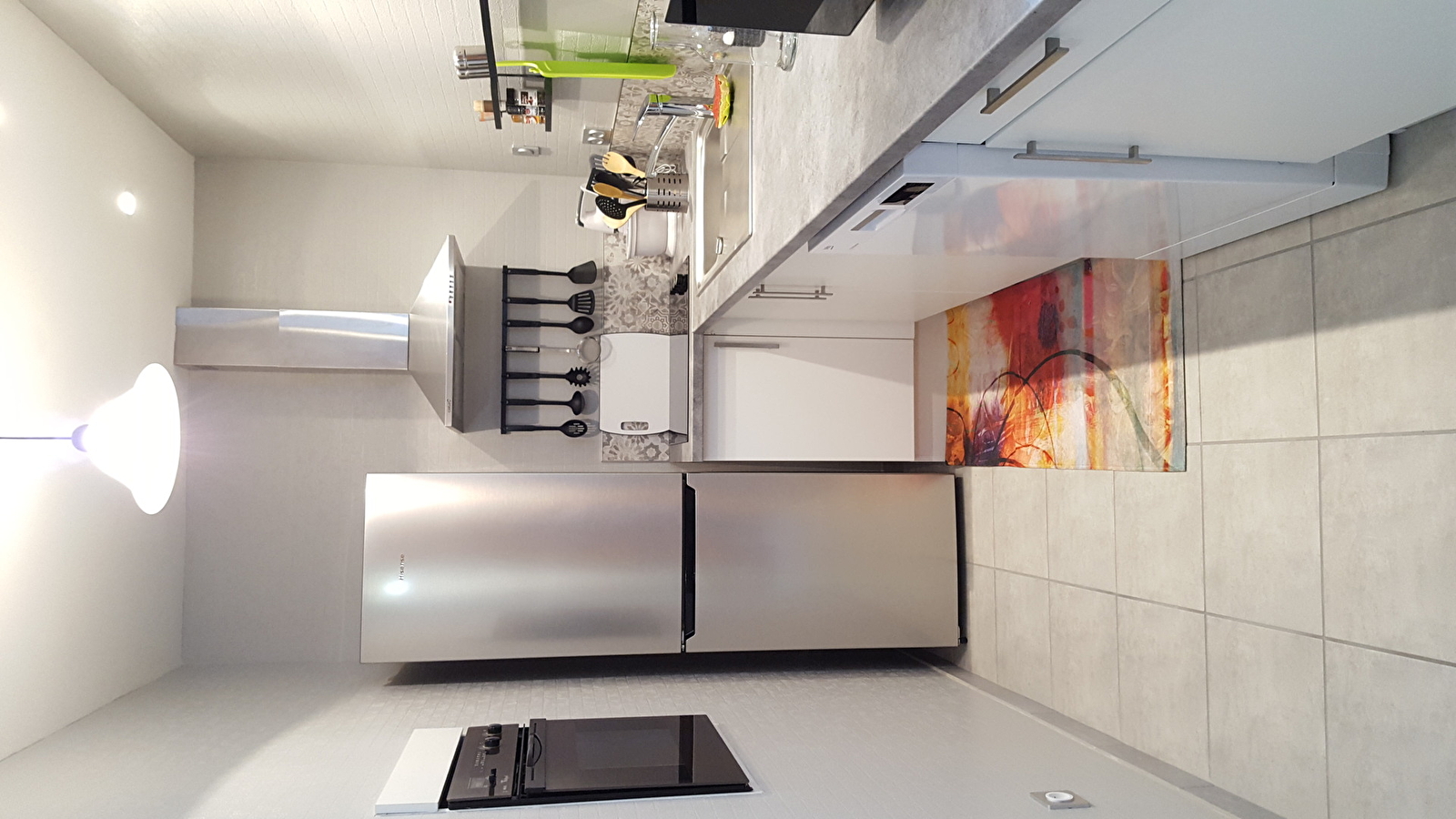 La cuisine est équipée et ouverte sur le salon-séjour.