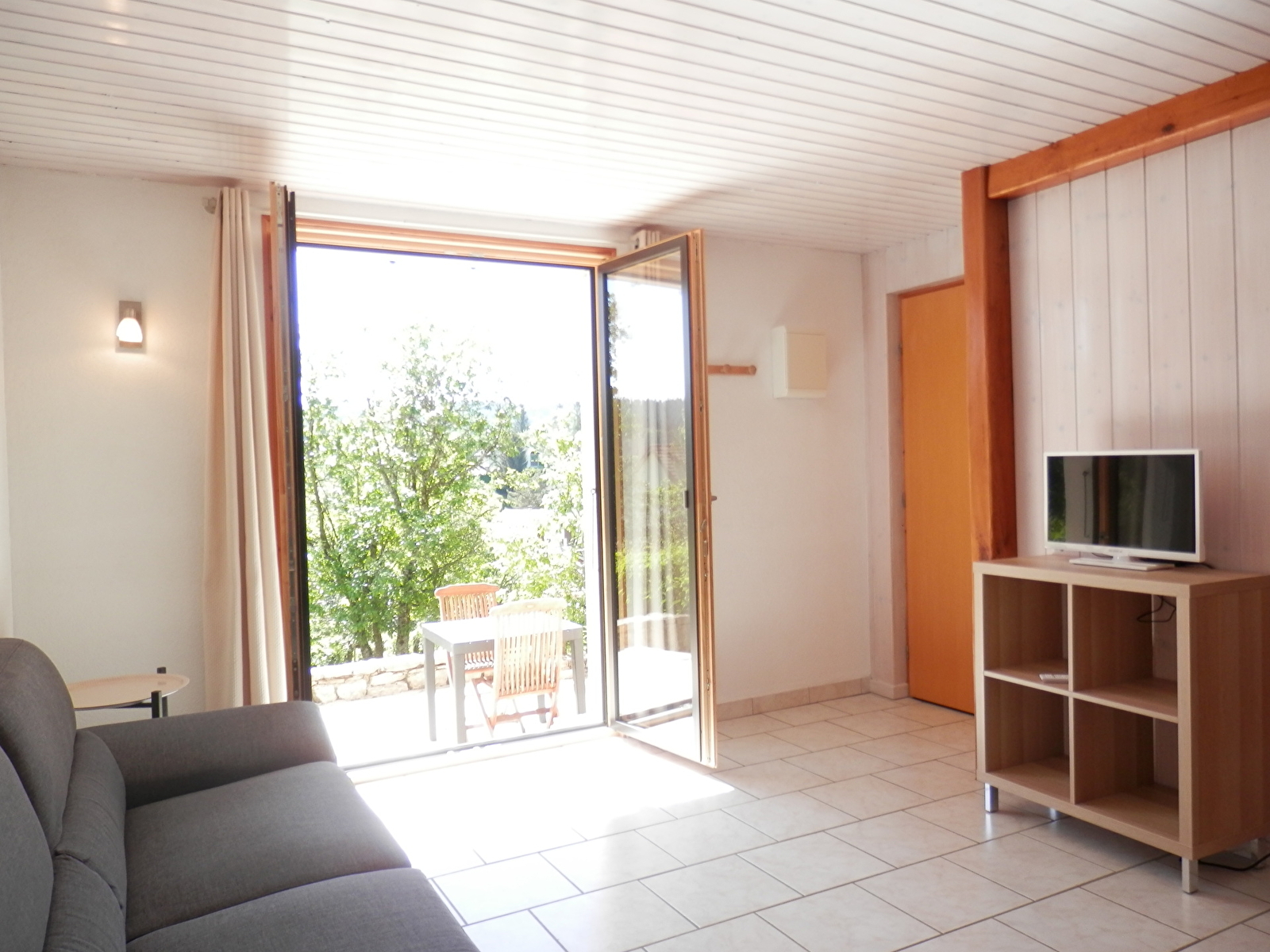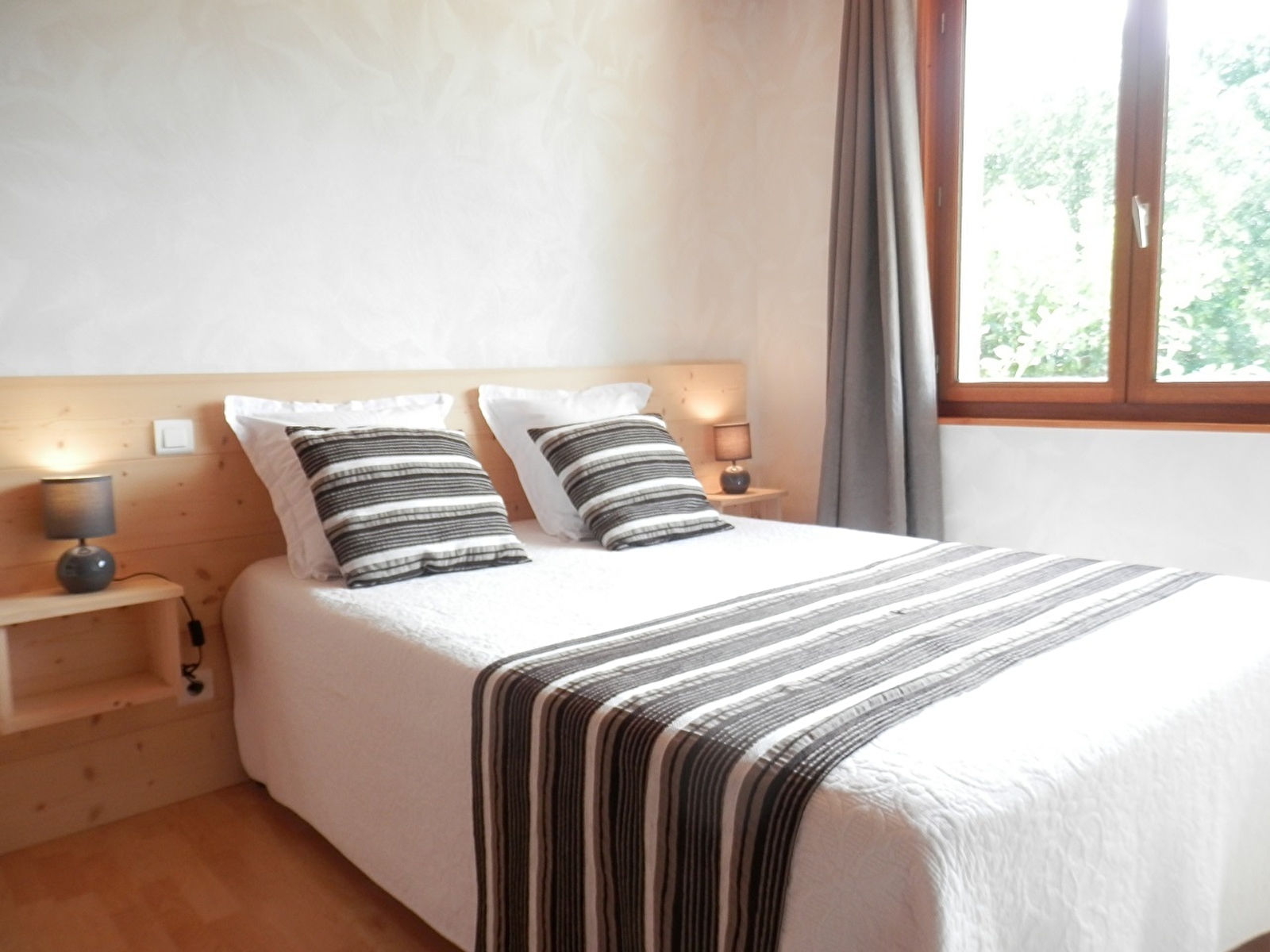 Gîte aménagé au rez-de-chaussée d'une jolie maison mitoyenne à celle des propriétaires comprenant également un autre gîte rural. Belle vue. Rez-de-chaussée : hall d'entrée commun à 2 gîtes. Terrasse privée. Vaste terrain partiellement clos commun ; garage et parking privés. Chauffage central compris.