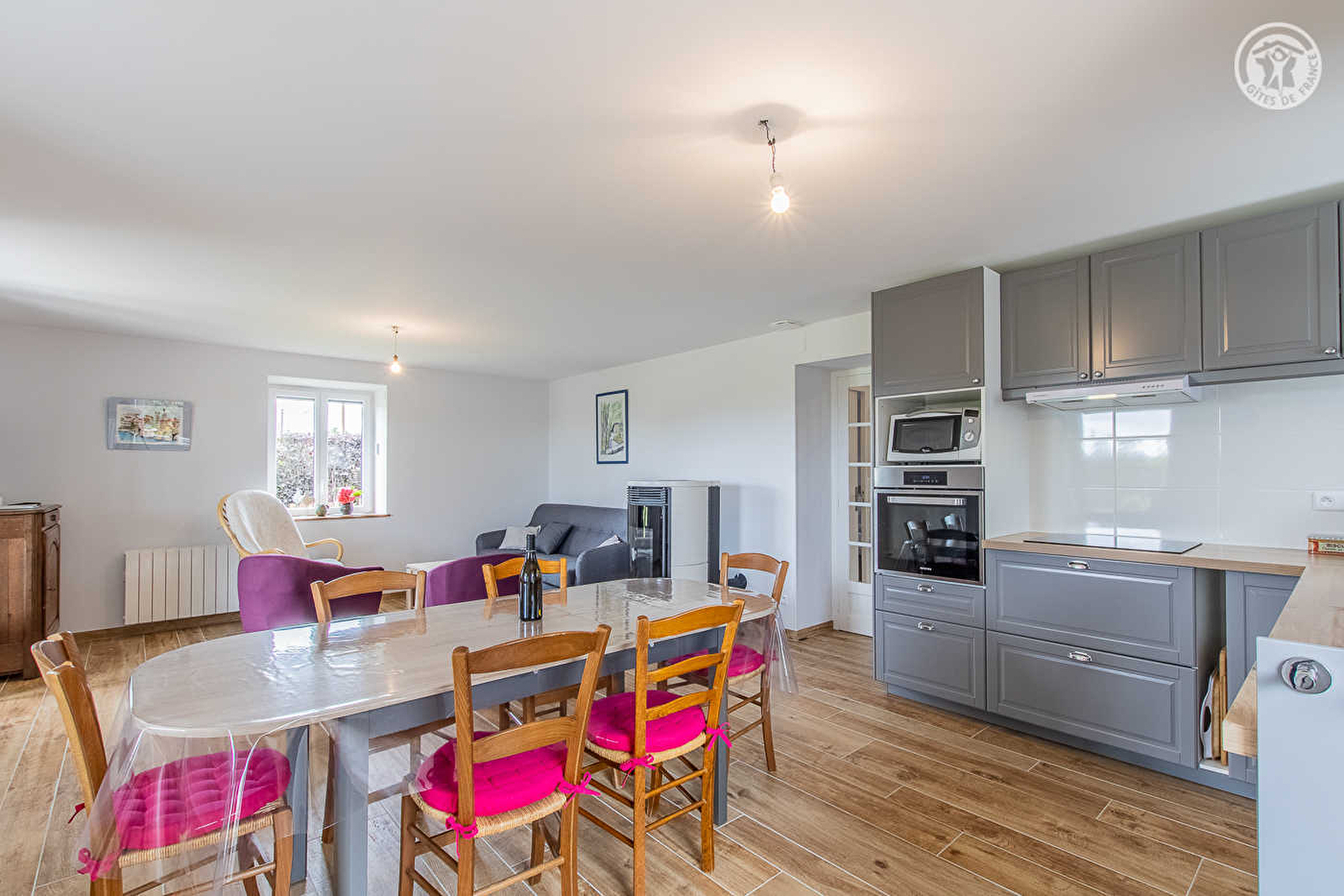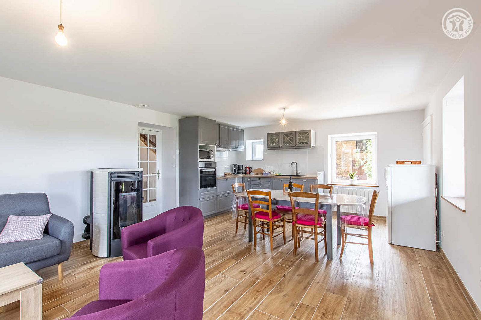 Composition : Maison individuelle jouxtant l'habitation propriétaires (indépendance totale sans vis-à-vis). Wifi. Chauffage électrique. Poêle granulés bois. Rdc : séjour-cuisine-salon, 1 chambre (lit 2 p. 160x200cm), salle d'eau (douche/Wc). 1er étage : 2 chambres avec TV bouquet Orange (chacune comprenant 2 lits 1 p. 80x200cm jumelables en lit 2 p. 160x200cm), pièce de détente (1 canapé), sde (douche/Wc). Terrasse couverte + jardin + local vélos + parking privés. Terrain en commun (7000m²). Toutes commodités 1.5 km.