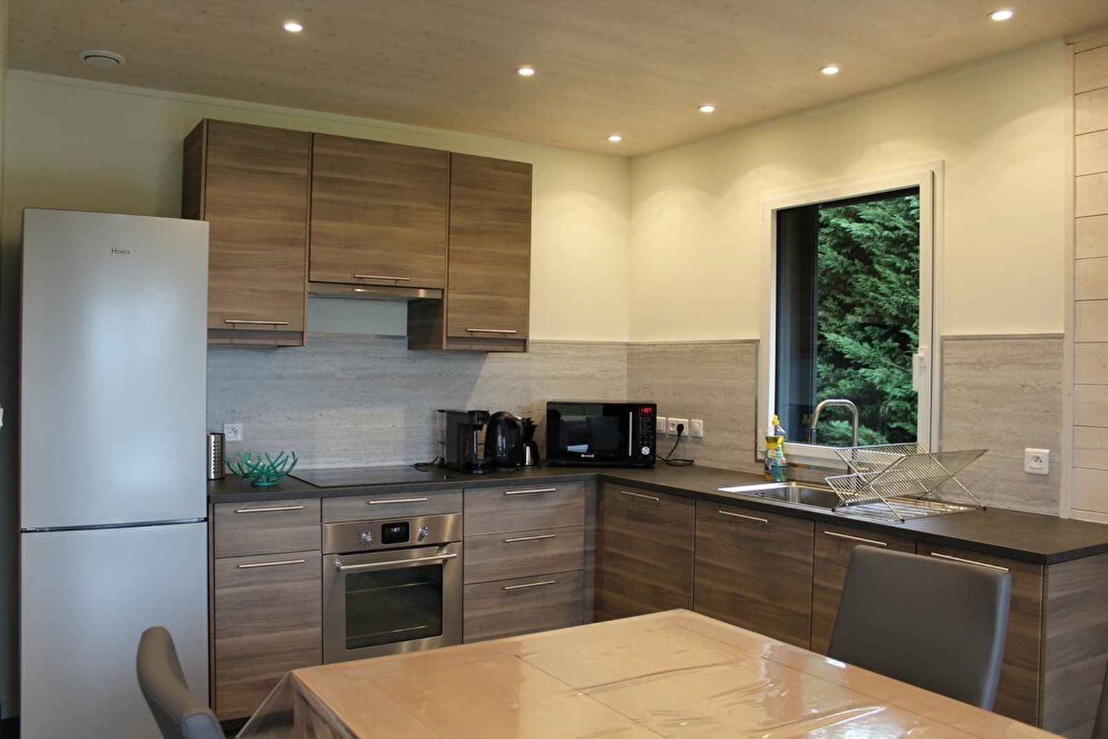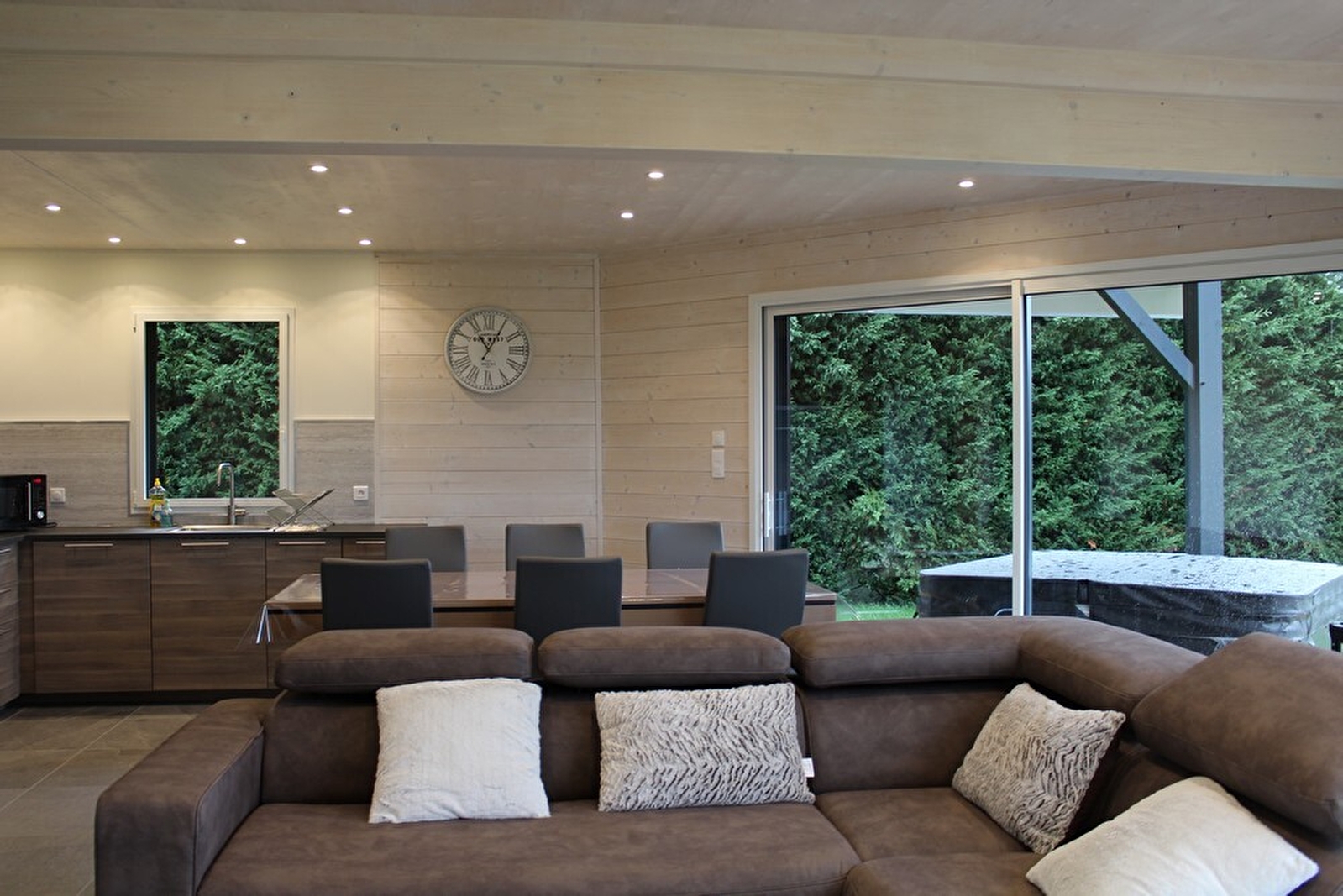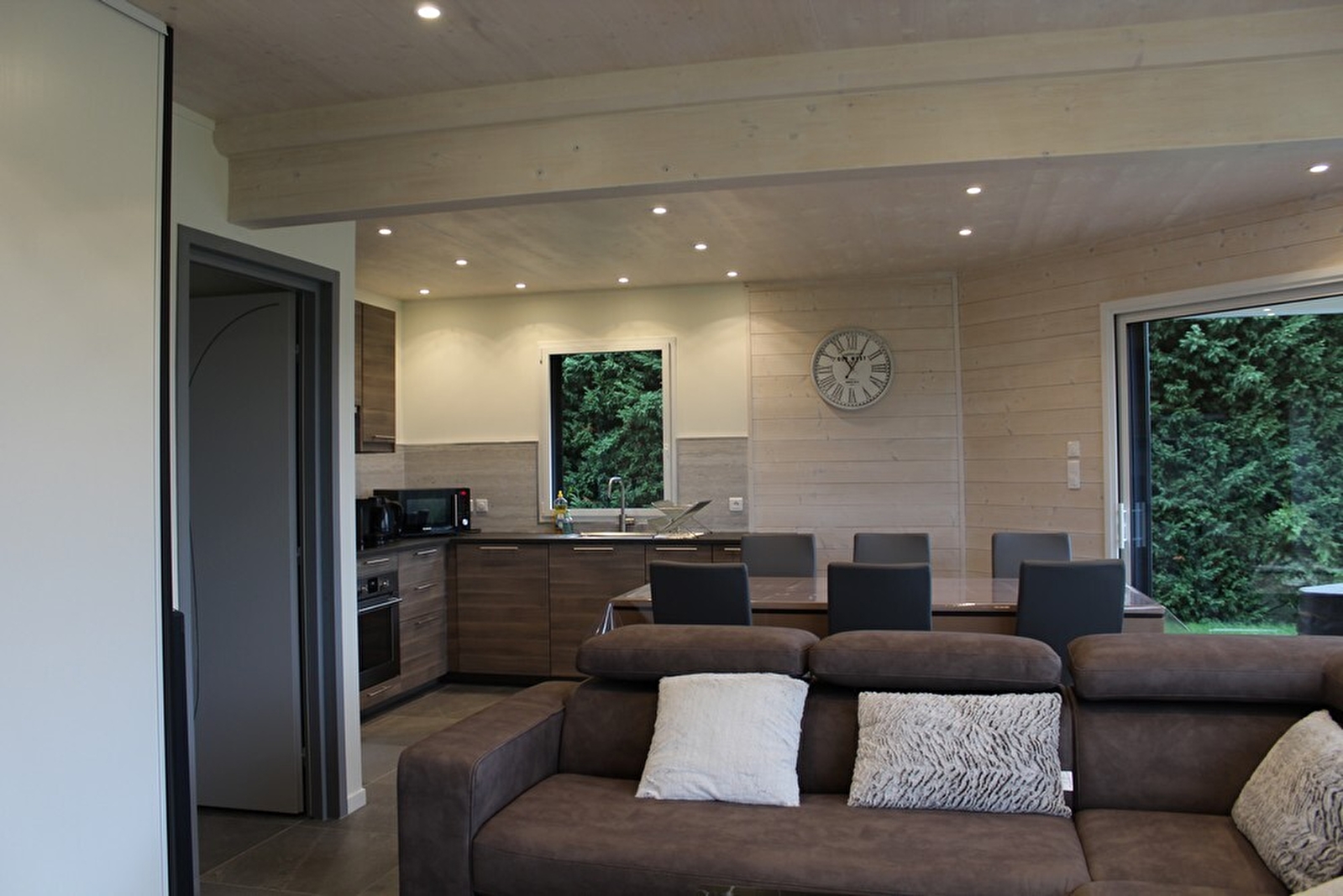 Dans un joli petit village du vignoble jurassien, à seulement quelques kilomètres de Poligny, capitale du Comté, venez séjourner dans cette maison neuve de plain-pied et profiter du calme environnant. Vaste pièce à vivre composée d'un coin salon avec canapé, télévision écran plat, chaine hifi bluetooth, et cuisine intégrée entièrement équipée. La première chambre comporte un lit de 160x200, la seconde deux lits de 90x200 et la troisième un lit de 90x190cm. Les linges de toilettes sont fournis et les lits sont faits à l'arrivée. Terrasse avec SPA privatif, salon de jardin et barbecue, offrant une magnifique vue sur le parc à Daims des propriétaires. Vaste terrain attenant clos. Climatisation. Pour les amateurs de pêche, vous aurez accès à l'étang privé des propriétaires (prêt de matériel de pêche sur demande). Adresse à découvrir absolument, n'attendez plus pour réserver ! 80 € de caution si les clients ne prennent pas le forfait ménage.