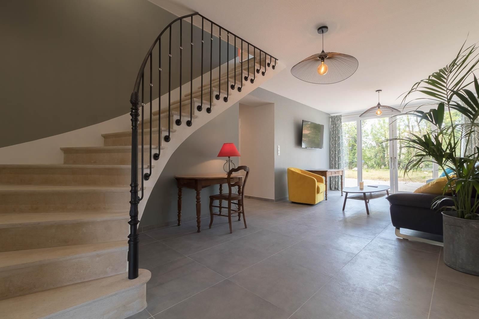 La maison se compose, au rez-de-chaussée, d'un vaste séjour en pierres apparentes avec cuisine toute équipée et salle à manger, d'un beau salon TV, d'une chambre avec un lit 160, d'une salle d'eau et d'un WC indépendant.