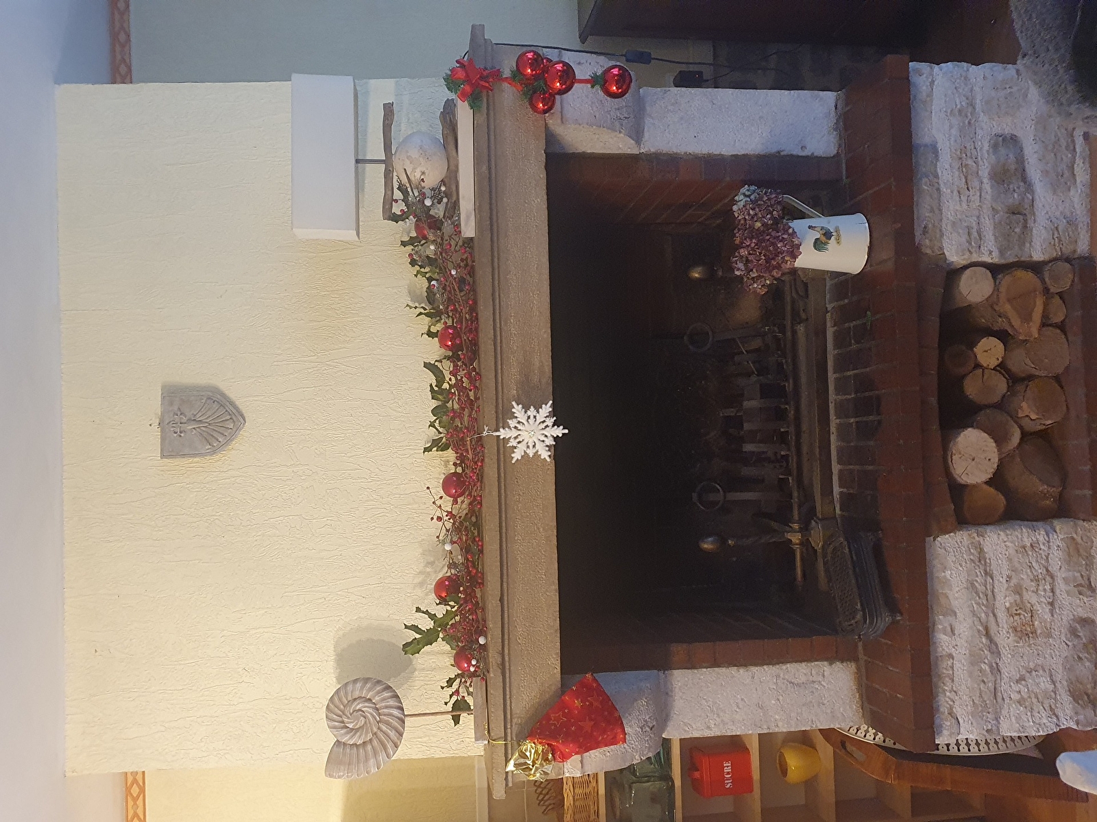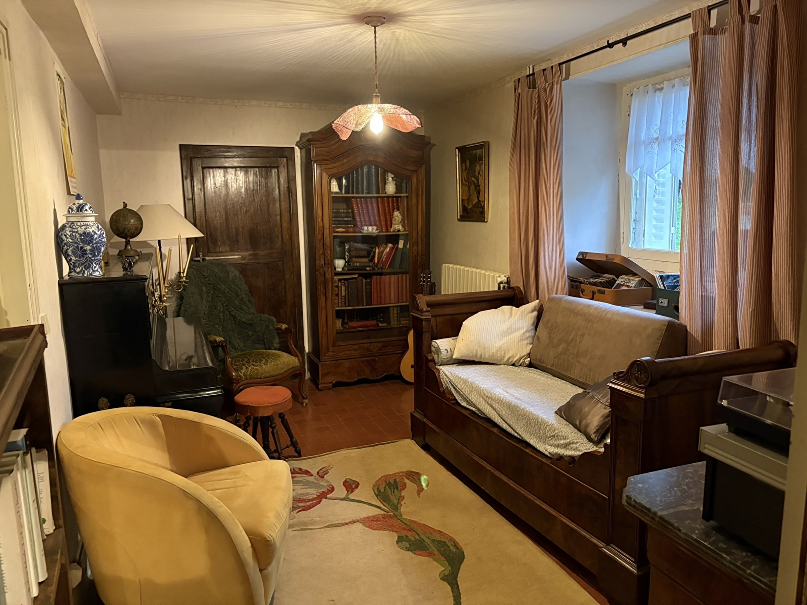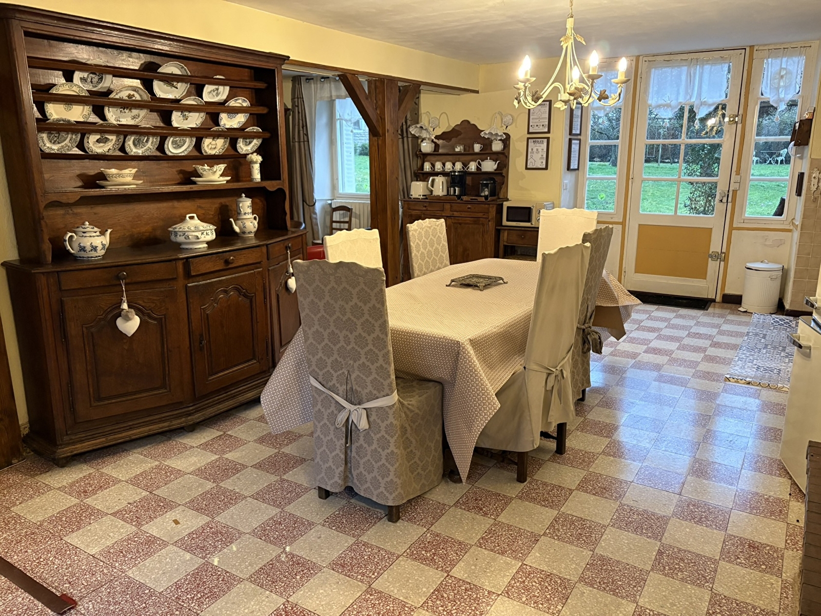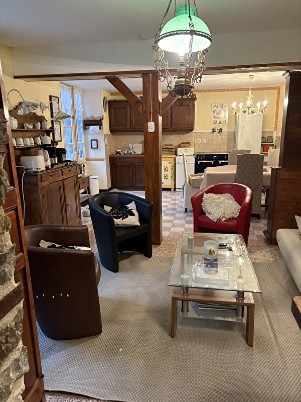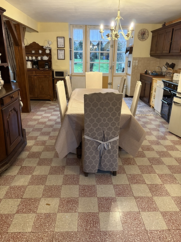 Vous entrez dans une grande pièce à vivre avec cheminée, cuisine, salle à manger et un coin salon. Une salle de lecture/musique prolonge le salon.
