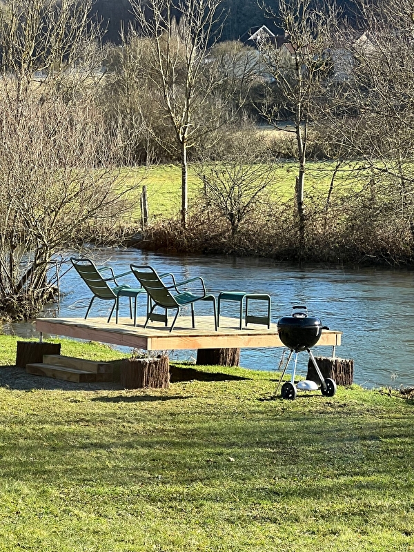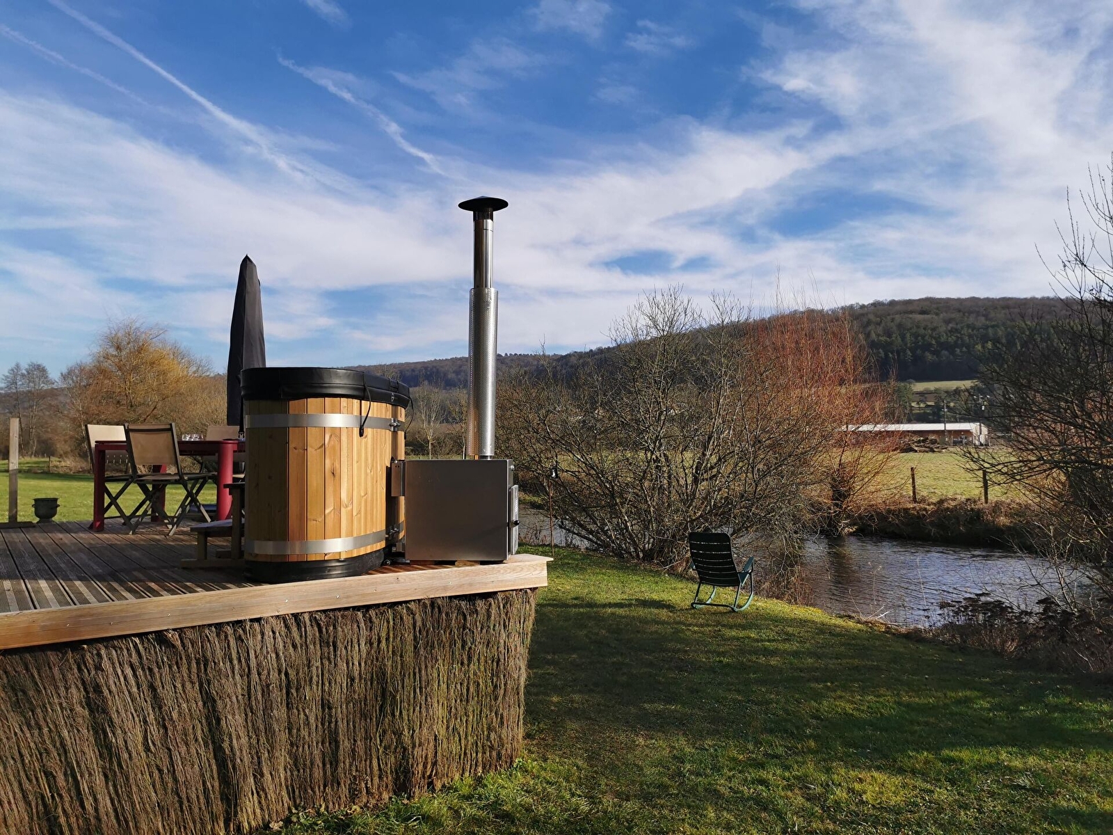 Profitez de notre bain nordique privatif posé au bord de la rivière, rempli à l'eau de source et chauffé au feu de bois.