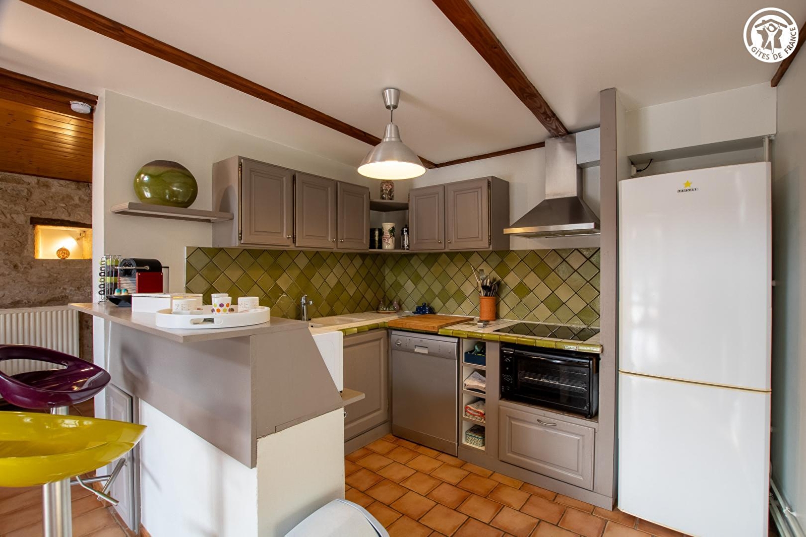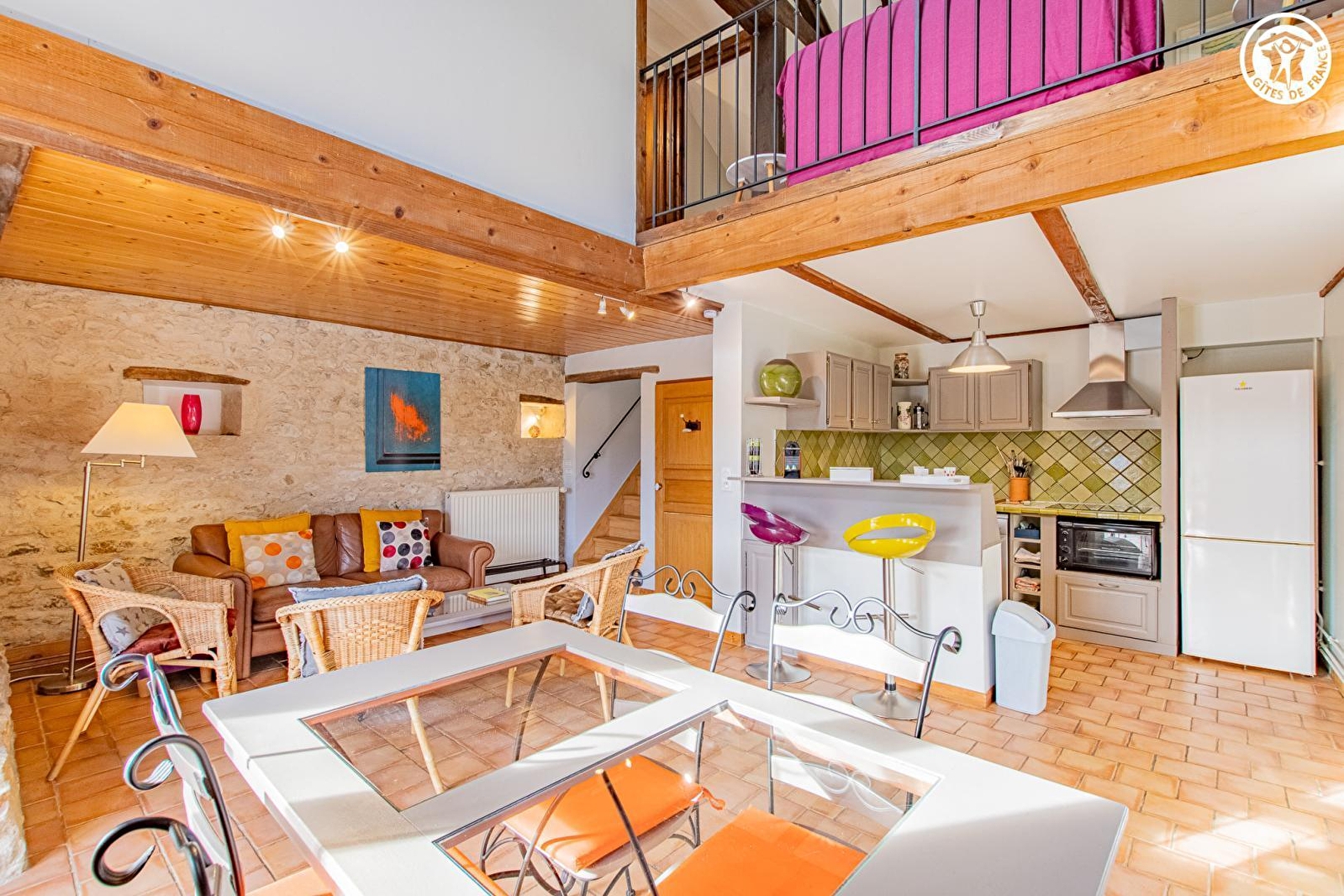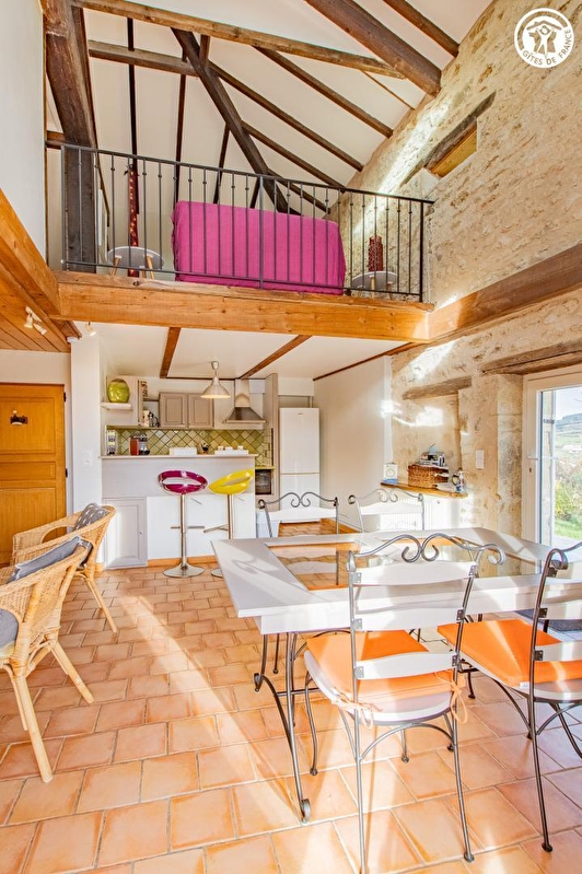 Composition : Gîte dans résidence secondaire propriétaire (totale indépendance). Wifi (fibre). Chauffage central gaz + poêle à bois. Rdc : séjour-cuisine-salon, salon TV en mezzanine (canapé conv. 2 p. 140x190cm en appoint), 2 chambres (lit 2 p. 160x200cm / 2 lits 1 p. 90x190cm), salle d'eau (douche), Wc indépendant. Terrasse + jardinet + parking privés. Borne de recharge voiture électrique. Commerces 5 km. Supermarchés 11 km.
