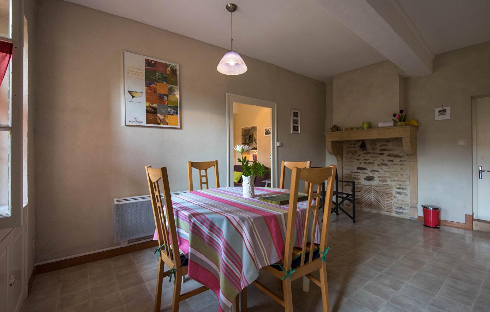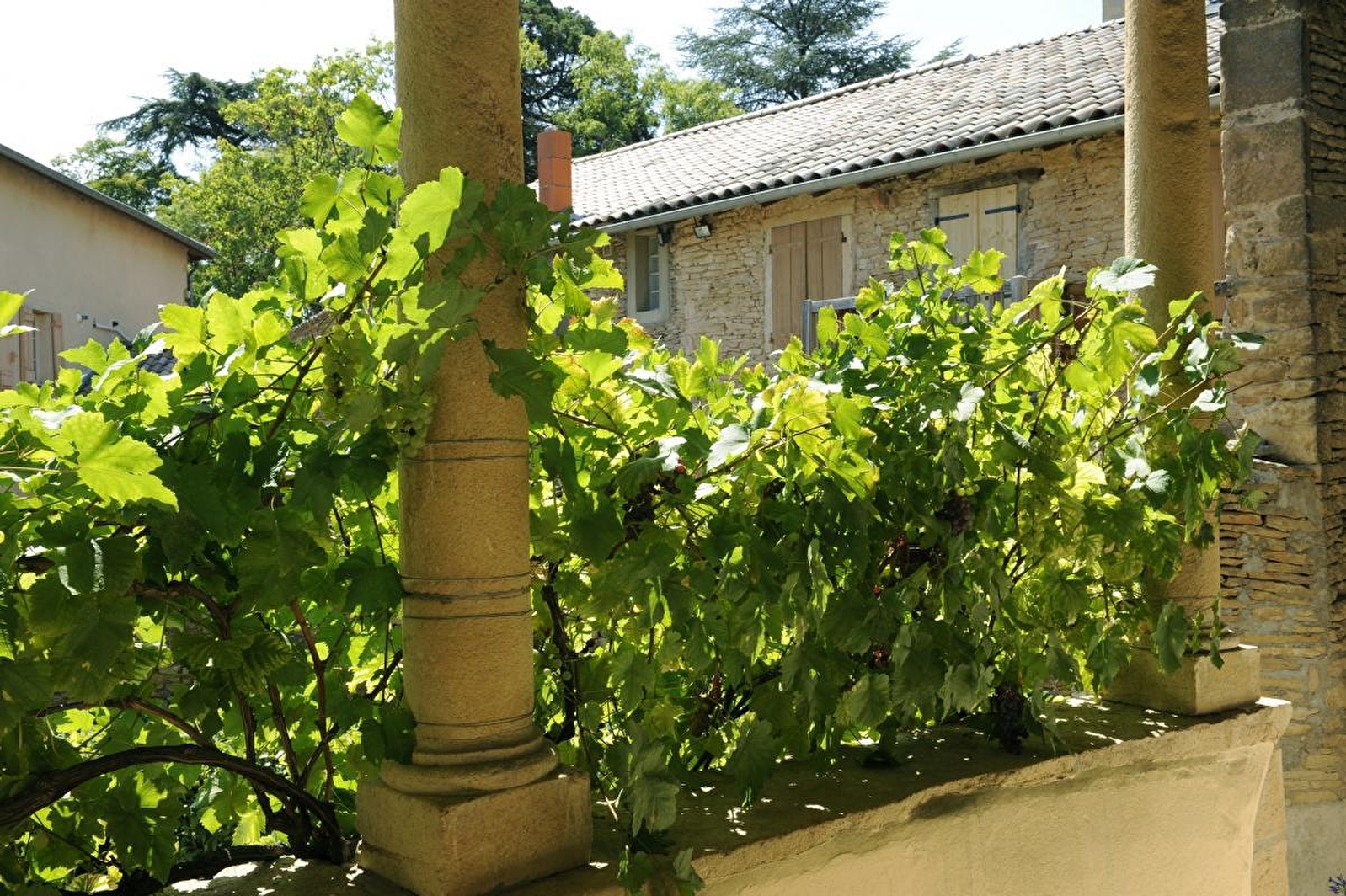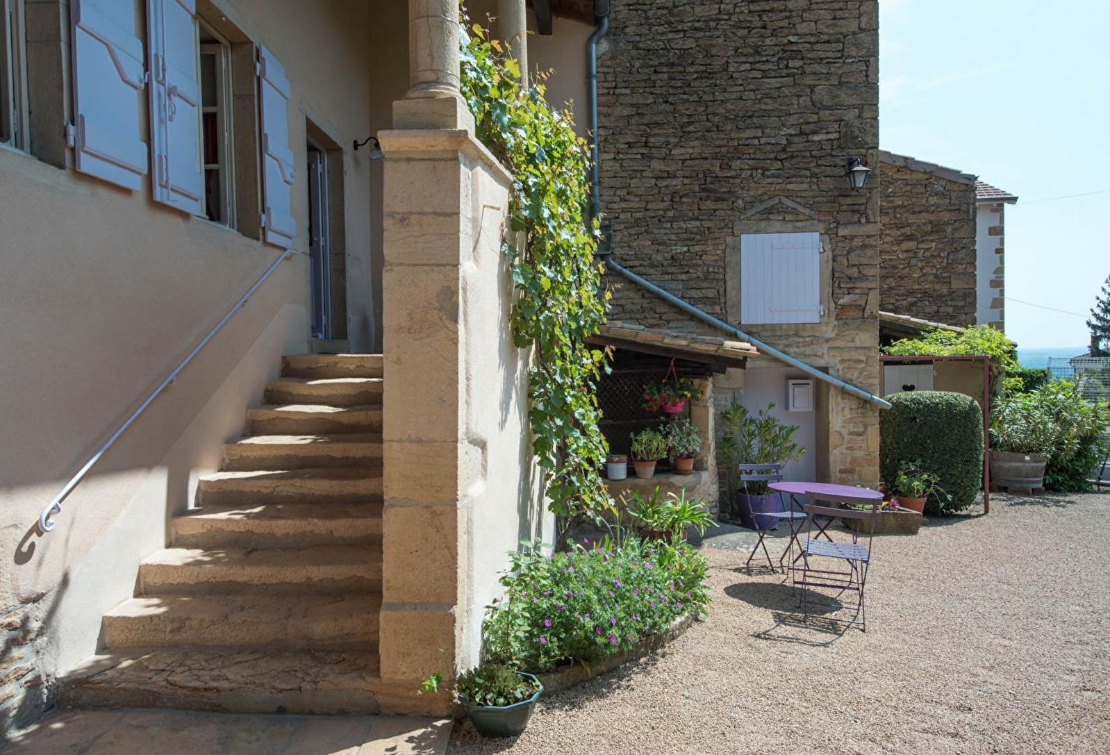 Passionnée de vin & de ses divers métiers, ayant elle-même œuvré sur une exploitation familiale, Marie-Hélèn vous accueille dans une élégante authentique demeure bourguignonne du XVIIe siècle chargée d'histoire, soigneusement restaurée dans les règles de l'art - superbe bâtiment de caractère, dotée notamment d'une traditionnelle « galerie mâconnaise » abritée - lovée au calme au sein d'une ravissante & intimiste arrière-cour close, végétalisée & fleurie, accessible par un original passage couvert privé - de type « traboule » - bordant une ruelle & la place du village. En plein cœur d'un pittoresque charmant petit bourg viticole typique de la campagne mâconnaise (comptant parmi les 4 rares villages constituant le prestigieux cru « Pouilly-Fuissé »), blotti sur les crêtes d'un coteau panoramique exposé (exceptionnel belvédère dominant en balcon la ville de Mâcon, la vallée de la Saône & la Bresse savoyarde, et offrant une sublime vue dégagée jusqu'au Mont-Blanc par temps clair !), au creux d'un somptueux écrin paysagé vallonné, succession de vastes vignobles & collines boisées. Spacieux gîte de très bon confort. Beaux volumes. Chaleureux cachet campagnard, mixant modernité & traditions, entre esprit contemporain et douce ambiance dépaysante d'une ancienne demeure (manteau de cheminée, poutres, portes moulurées, rare sol en dalles de pierres d'origine). Agréable balcon-terrasse abrité, niché sous l'historique « galerie mâconnaise », complété par une large terrasse en gravier « sur cour » (exposée & ombragée).