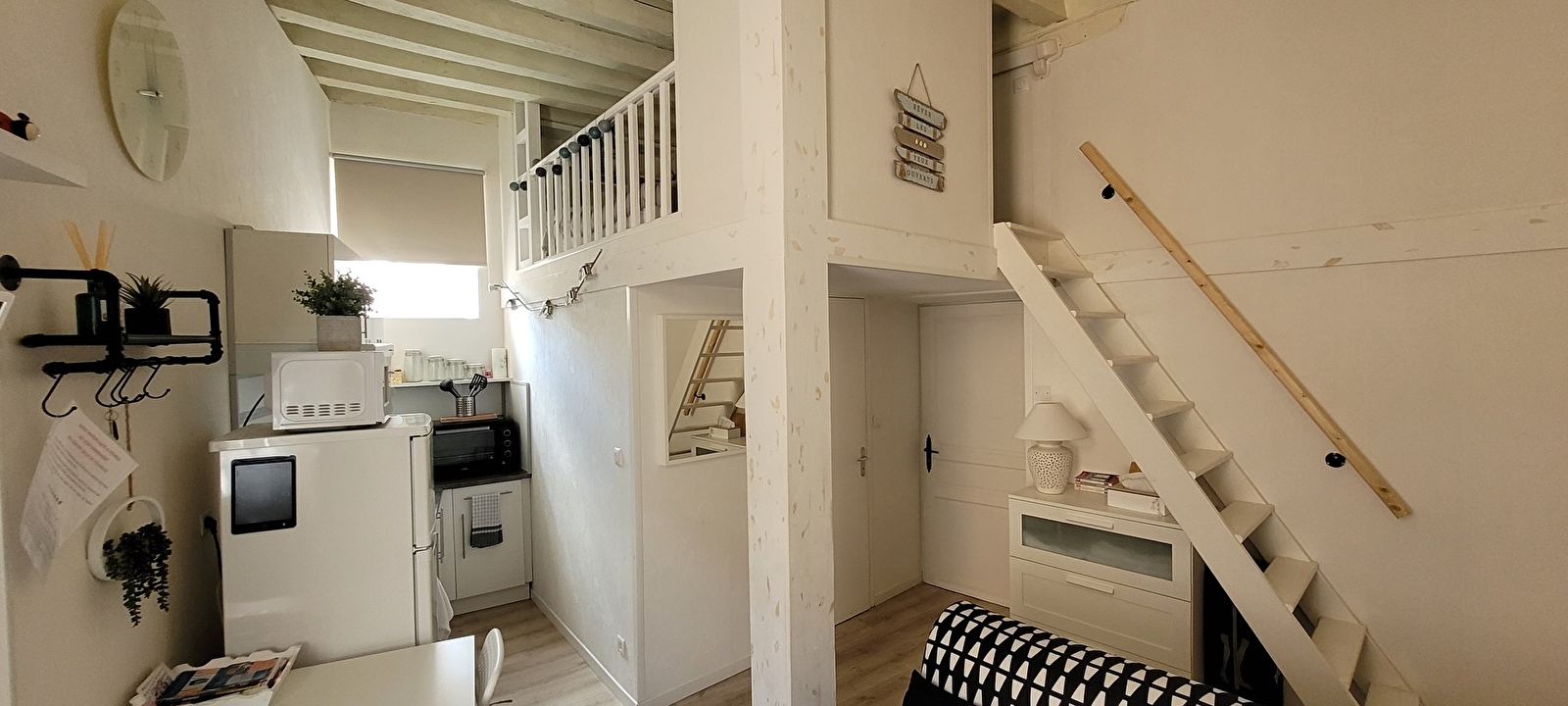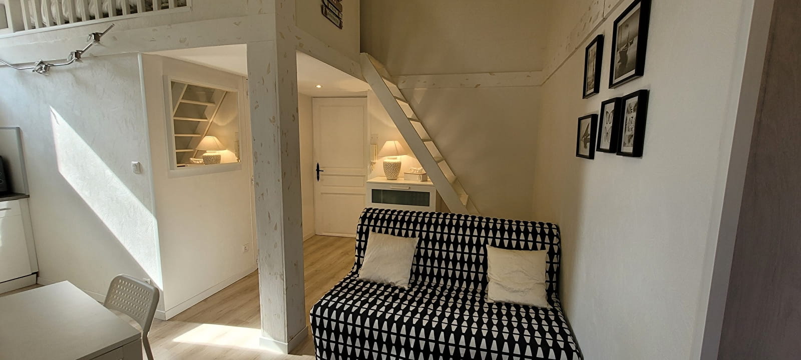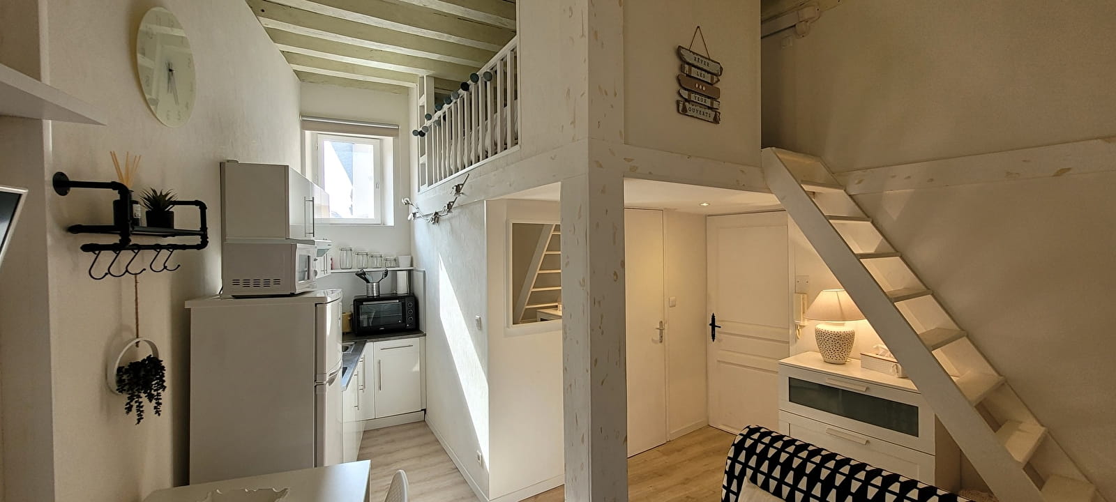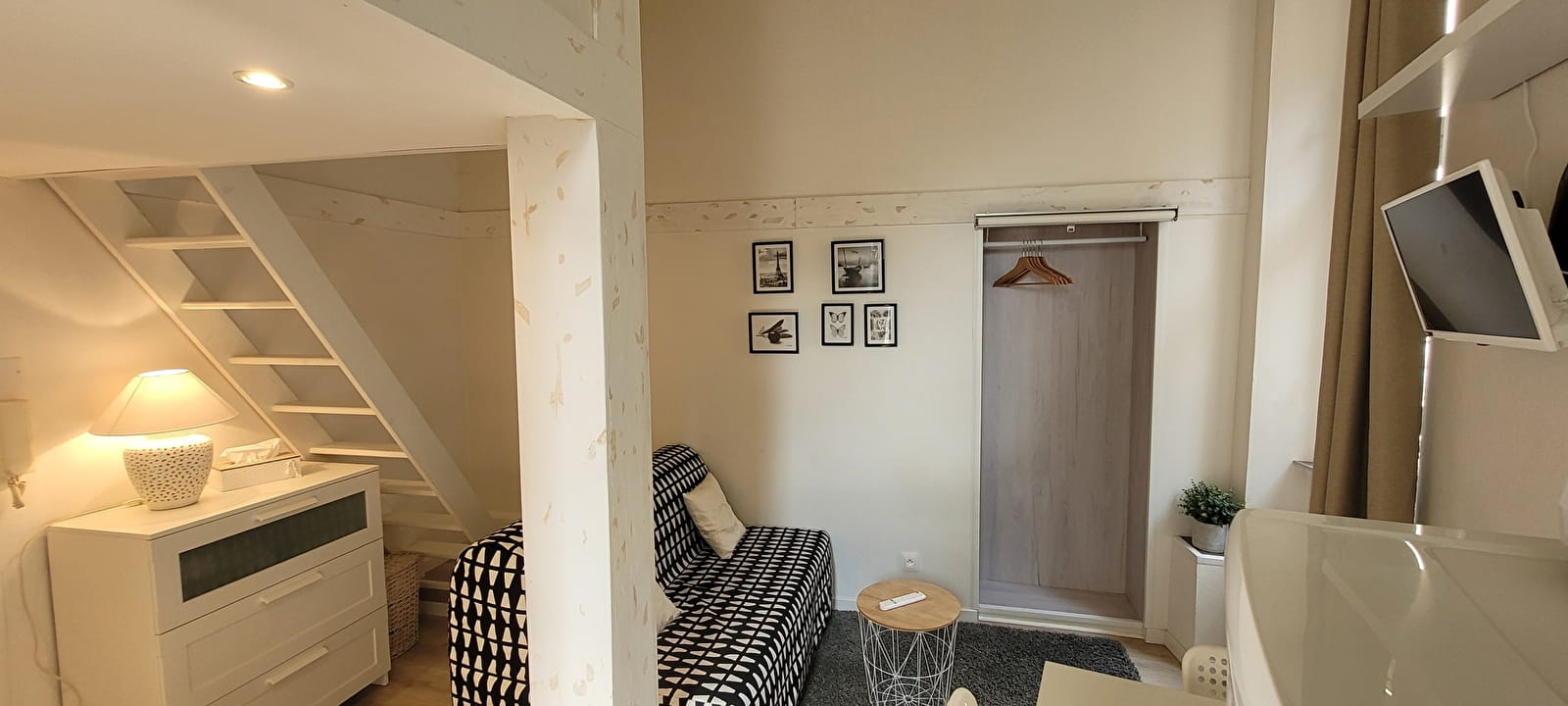 En montant les escaliers, vous accéderez à la mezzanine où se trouve le coin nuit. Il y a un lit de 130 cm et suffisamment d'espace pour ranger vos affaires. La mezzanine est accessible par une échelle, très cosy du fait de la petite hauteur sous plafond ce qui ajoute du charme et de l'originalité à l'appartement.