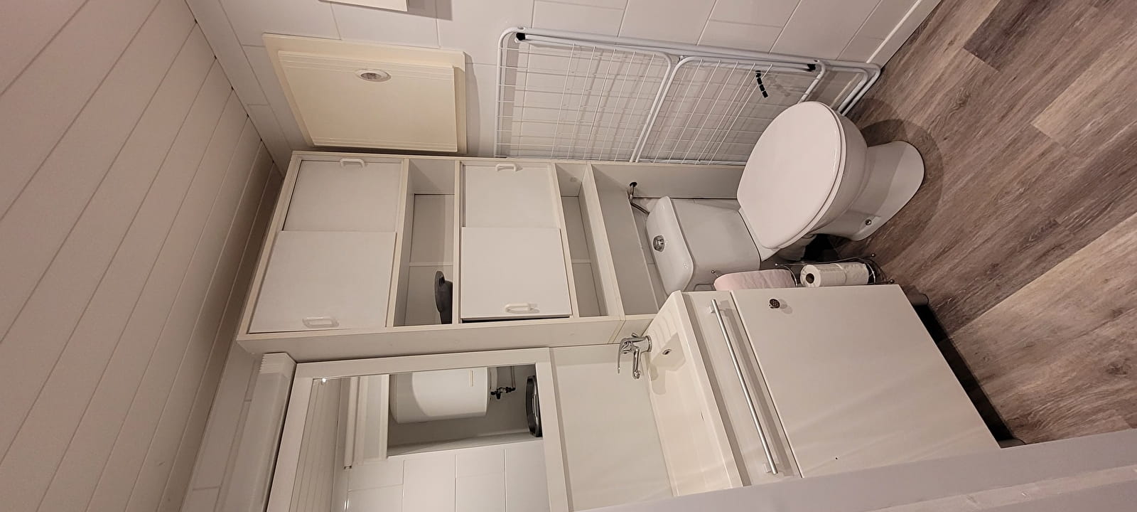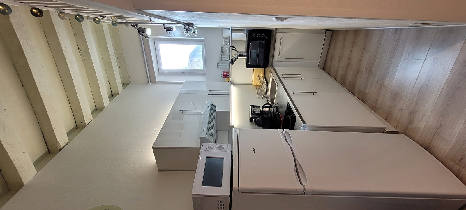 L'appartement est aménagé sur deux niveaux. Au rez-de-chaussée, vous trouverez un coin salon avec un canapé convertible, une petite table, un TV et une kitchenette équipée d'un réfrigérateur, d'un four micro-ondes, d'une plaque de cuisson et d'une cafetière. Il y a également une salle de bains avec une douche et des toilettes.