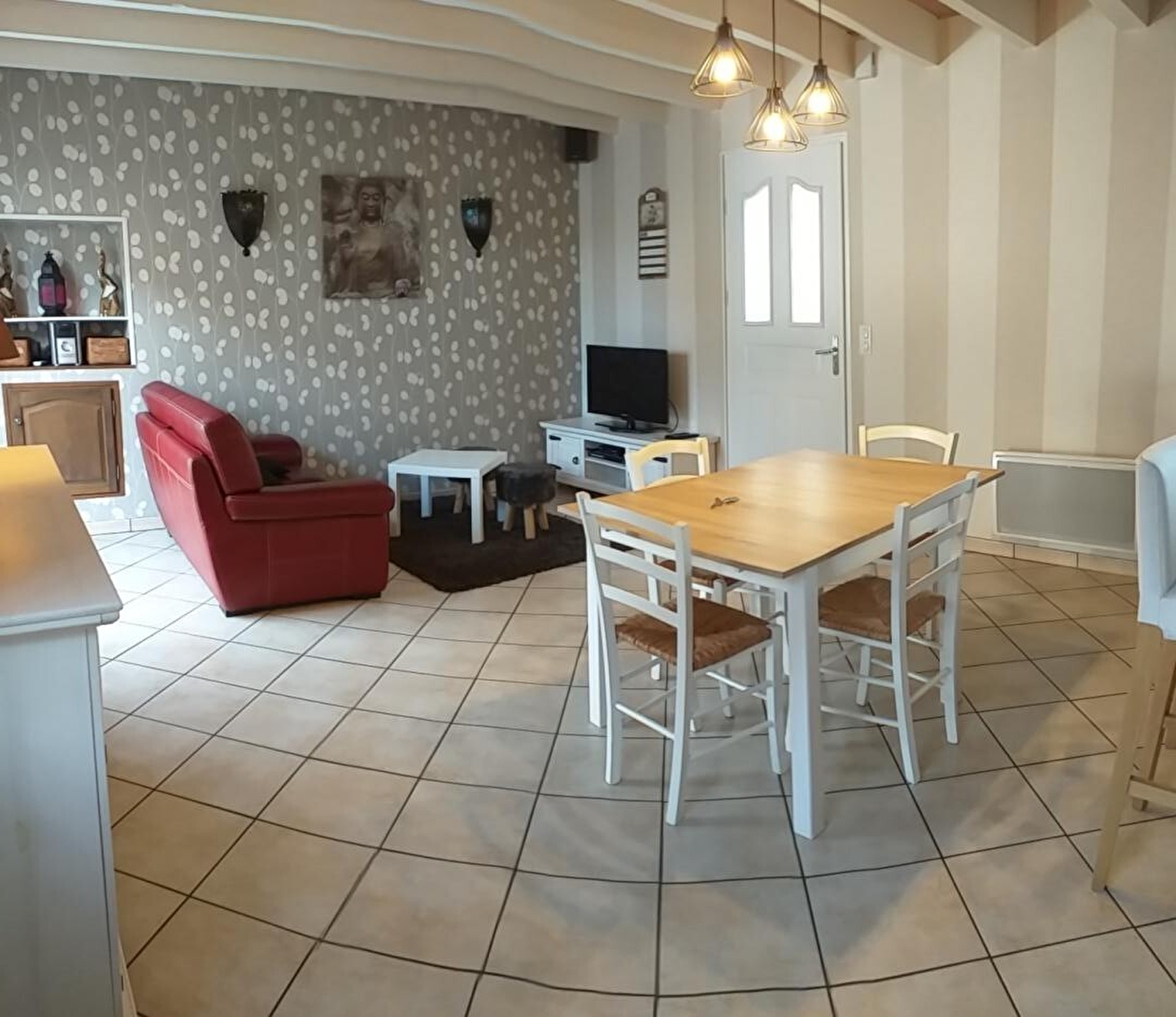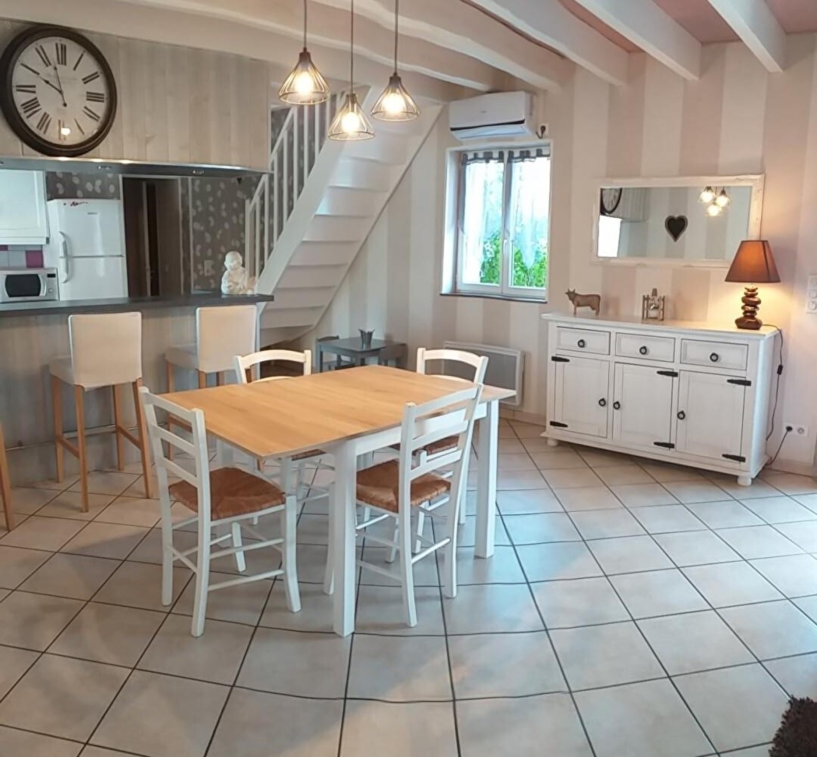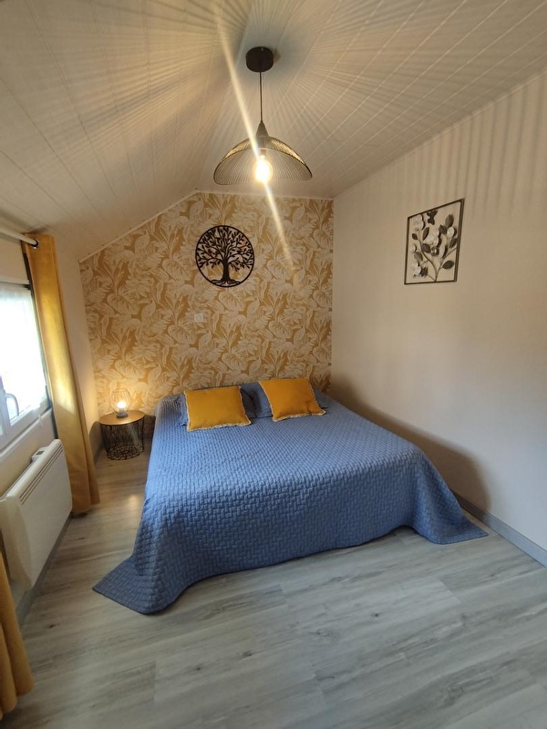 Composition : Maison individuelle jouxtant la maison des propriétaires (indépendance totale sans vis à vis). Chauffage Pompe à Chaleur. Climatisation. Wifi. Duplex. Rdc : séjour-cuisine-salon, wc indépendant. 1er étage : 2 chambres ( lit 2 p 140x200cm / lit 2 p 160x200cm), salle d'eau (douche multijets), wc indépendant. Jardinet clos avec terrasse. Parking public aisé sur place (devant le gîte). Local vélos (chez les propriétaires à deux pas). Commerces et services à 2.5 km. Gare 26 km. Voie verte à 2 km.