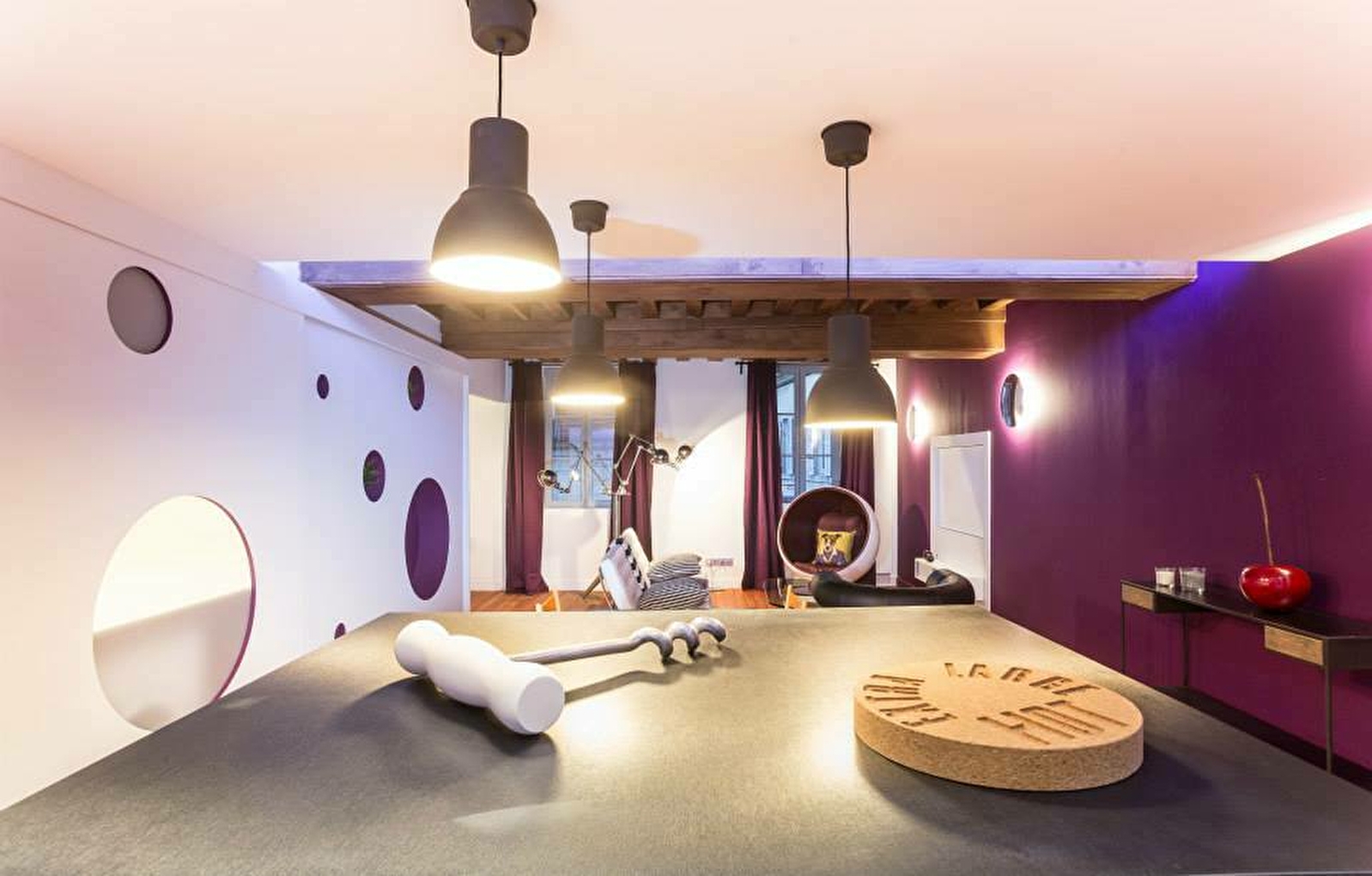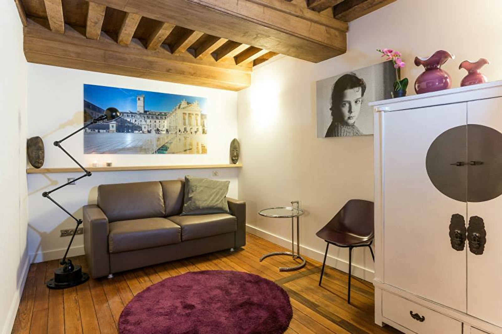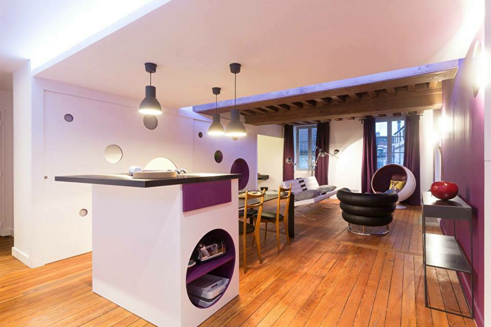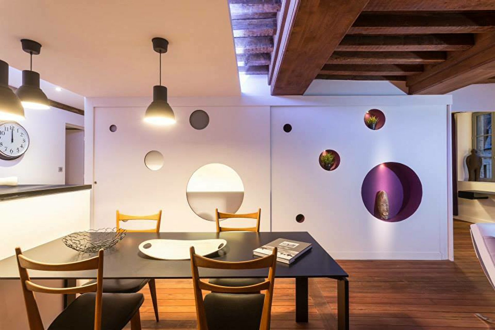 Cet appartement offre une décoration design et traditionnelle à la fois avec ses parquets et plafonds d’époque.