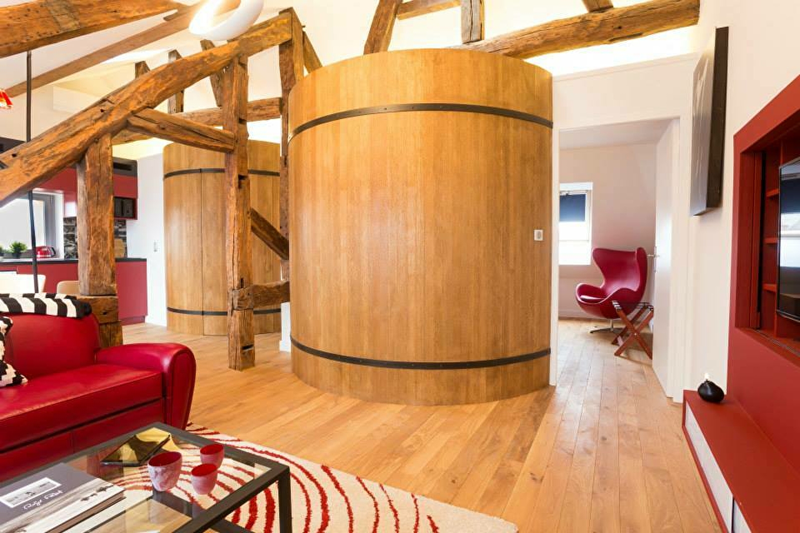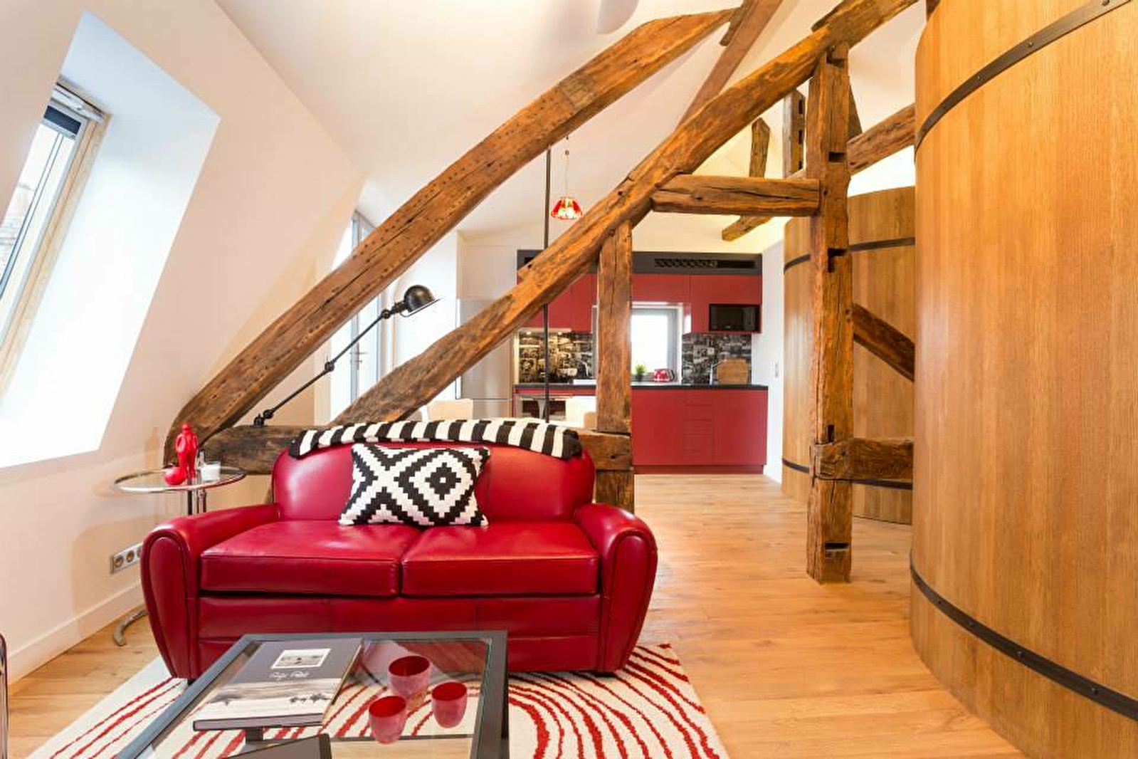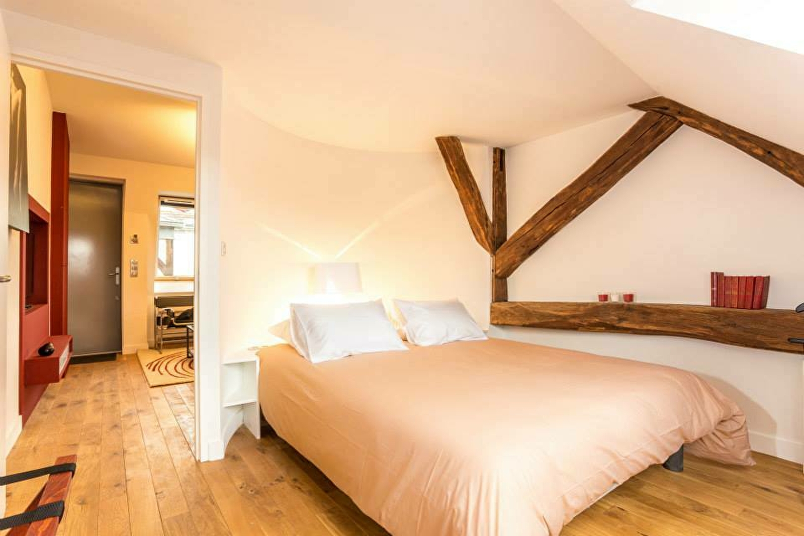 L’appartement traversant et lumineux, et spacieux, doté d’une décoration unique, et d'une terrasse exceptionnelle donnant sur les toits de DIJON. Il se compose d’une pièce à vivre avec cuisine entièrement équipée, ouverte sur le salon, avec une table accueillant jusqu’à 4 personnes, (vous disposez de plaques de cuisson, avec hotte, d’un lave-linge, séchant, d’un four, d’un lave-vaisselle, micro-onde, réfrigérateur congélateur, d’une machine à café Nespresso, d’une bouilloire, et d’un grille-pain, et tout le nécessaire dans la cuisine), d’un salon avec télévision écran plat, canapé, fauteuil, d'une chambre double avec un lit queen-Size et TV, avec dressing et un coffre, d’une salle de bain avec grande douche à l’italienne et WC, une vasque, sèche-cheveux ; miroir.
