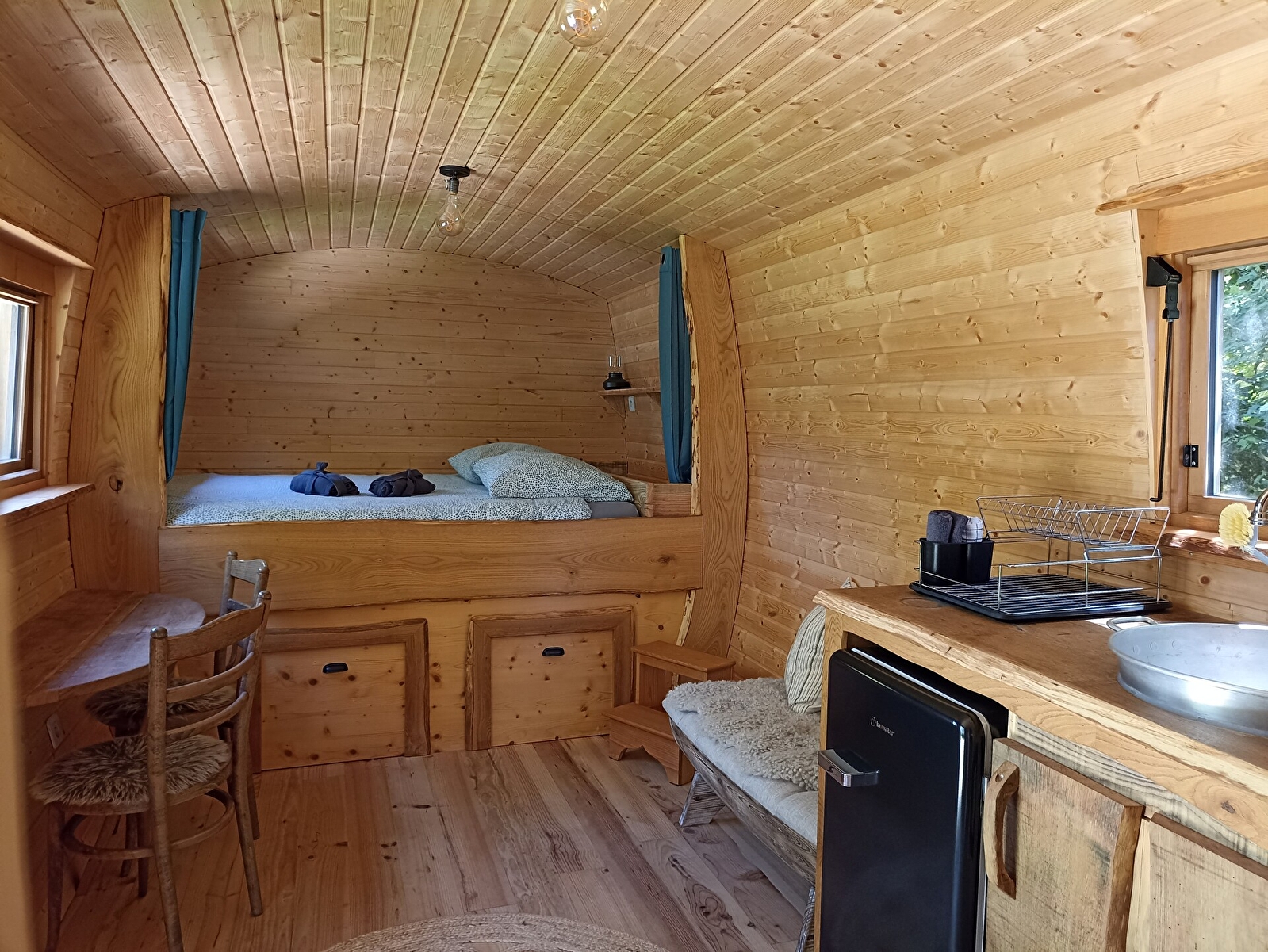 Le lit Queen size en alcôve vous transportera dans les bras de morphée grâce à ce petit coin cocooning. Le luxe de cette roulotte insolite est qu’il n’est pas nécessaire de sortir pour cuisiner ou se laver. Le coin cuisine vous permettra une autonomie et des séjours plus long. Elle est également pourvue de sa salle de douche et ses wc pour plus d’intimité.